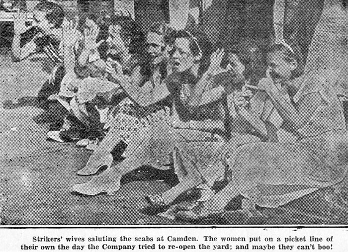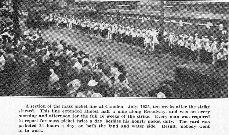 A section of the mass picket line at Camden-July, 1935, ten weeks after the strike started. This line extended almost half a mile along Broadway, and was on every morning and afternoon for the full 16 weeks of the strike. Every man was required to report for mass picket twice a day, besides his hourly picket duty. The yard was picketed 24 hours a day, on both the land and water side. Result: nobody went in to work.