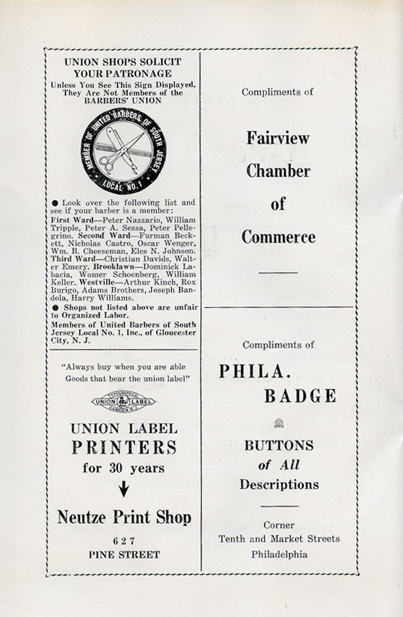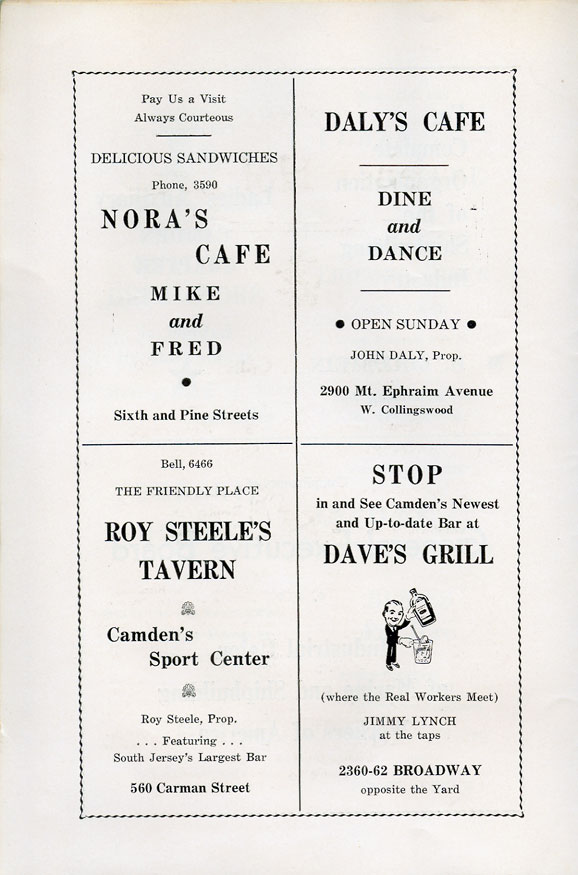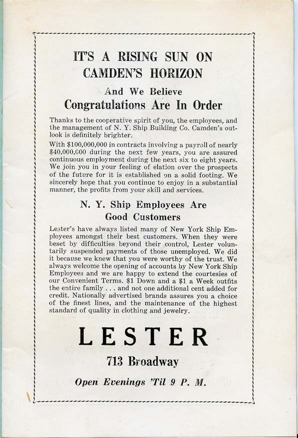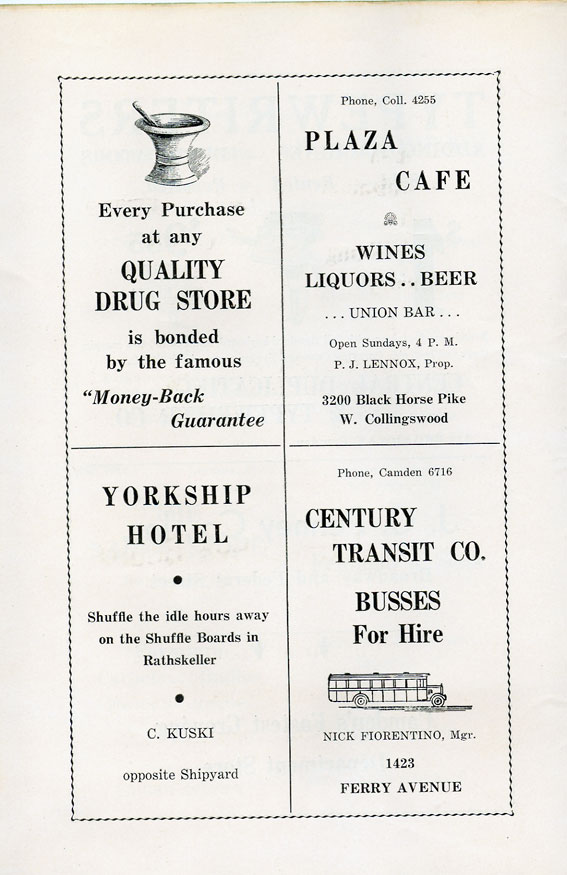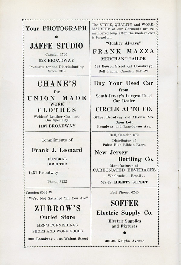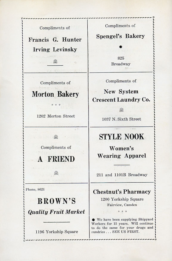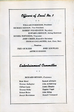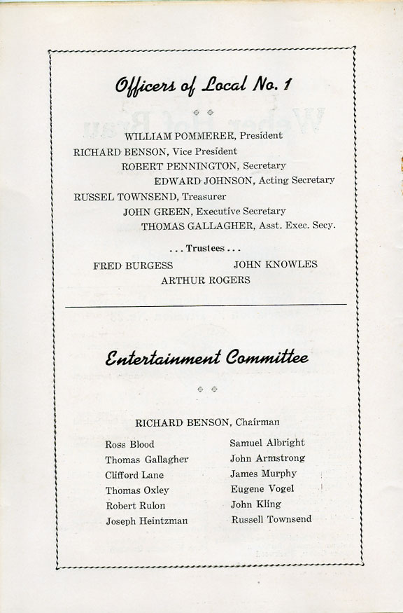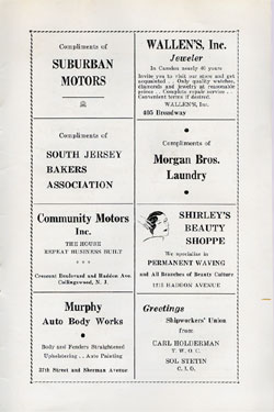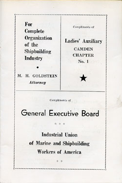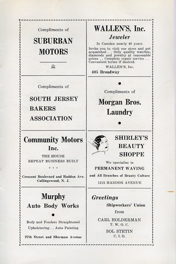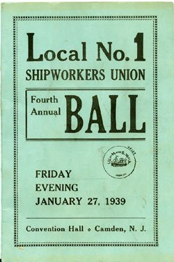 With the thousands of employees at New York Ship as members, the Local 1 Ball was quite a large event, and was staged in Camden's largest venue, the original Convention Hall, which stood on Line Street at Memorial Avenue. This building burned down in the early 1950s, and the site is now a parking lot for employees of Campbell's Soup corporate headquarters.