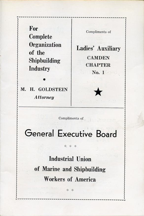 The Industrial Union of Marine and Shipworkers of America was founded in Camden by employees of the New York Shipbuilding Corporation at the shipyard on Broadway in 1933. Despite the fact that shipyard employees had voted by a ratio of 20 to 1 to unionize, management refused to recognize the new organization. After negotiations broke down, the 3200 shipyard workers went on strike on March 27, 1934. After seven weeks management capitulated. The men returned to work on May 14, 1934. under the first Union contract signed by any large shipyard since 1919.