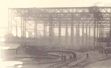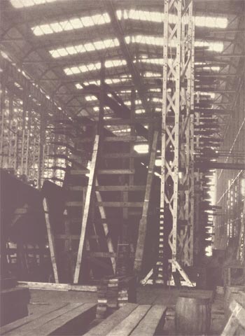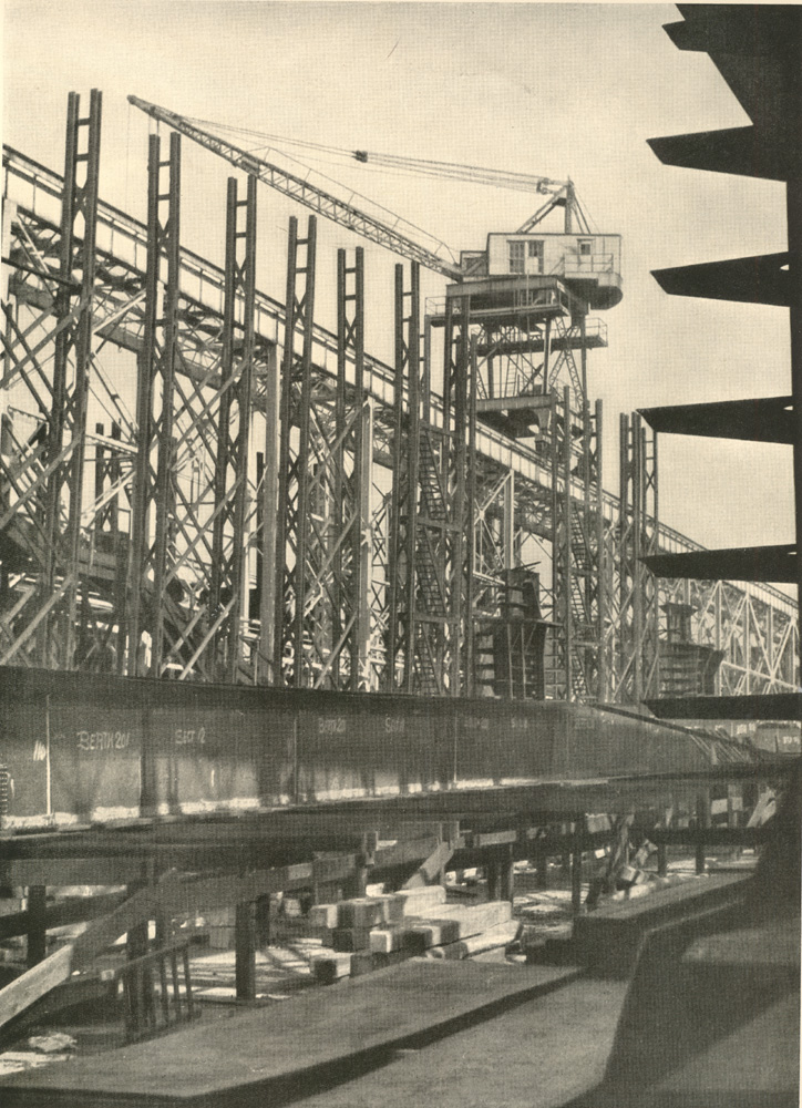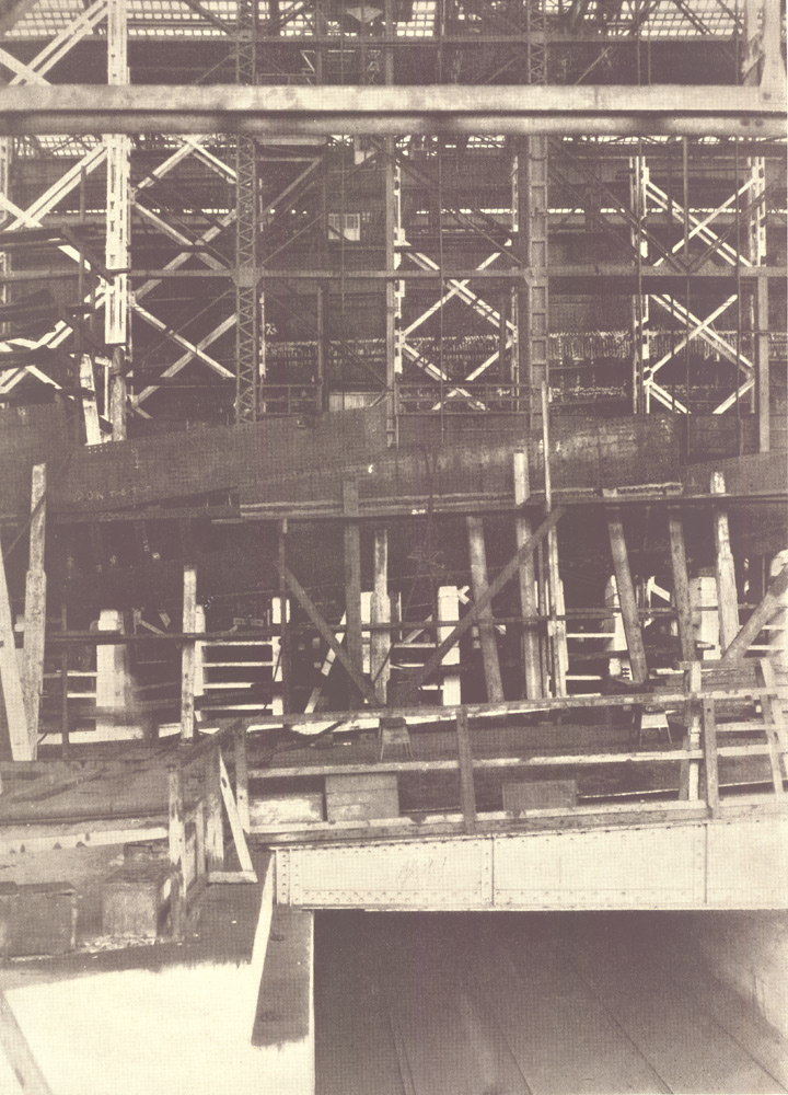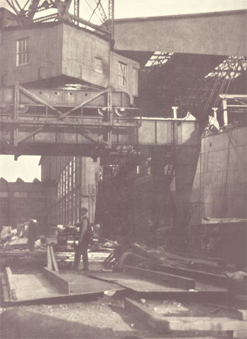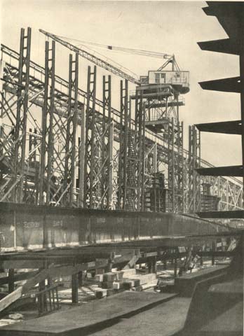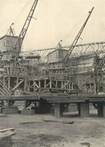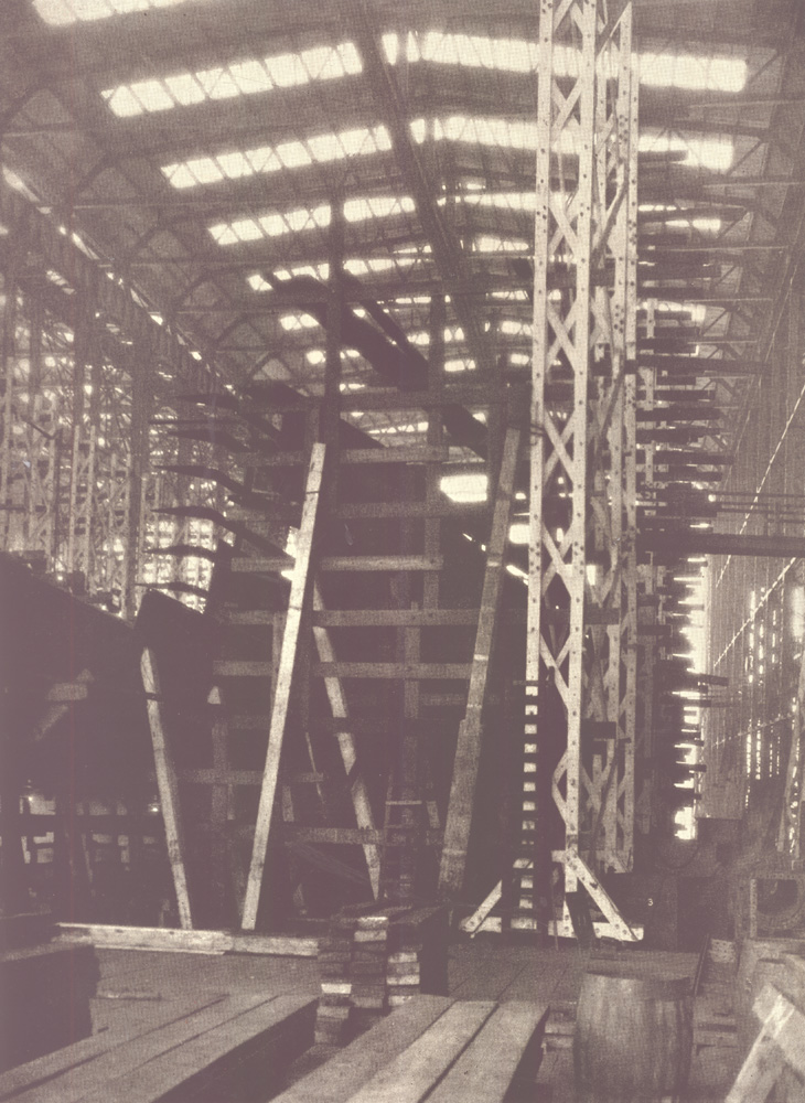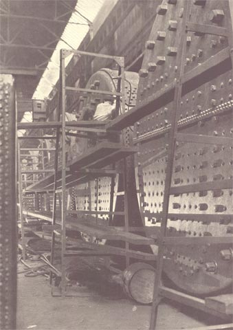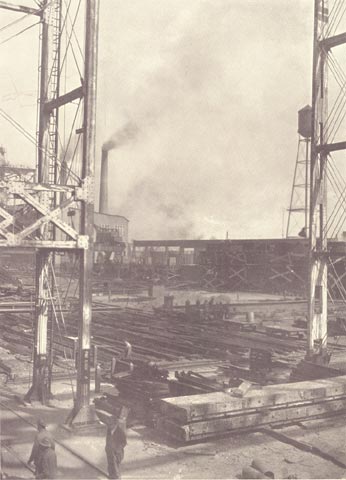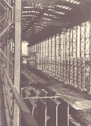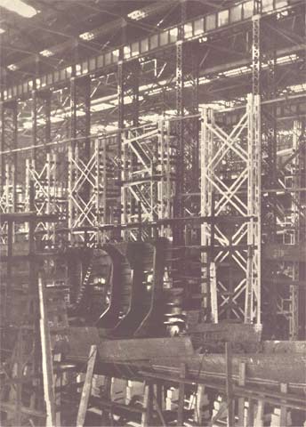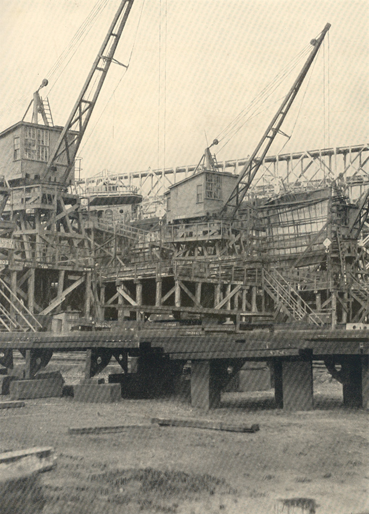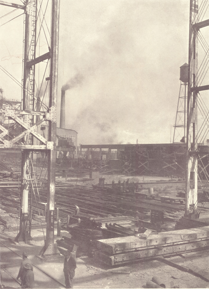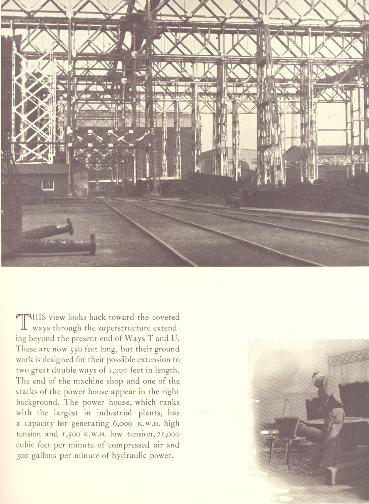 This view looks back toward the covered ways through the superstructure extending beyond the present end of Ways T and U. These are now 550 feet long, but their ground work is designed for their possible extension to two great double ways of 1,000 feet in length. The end of the machine shop and one of the stacks of the power house appear in the right background. The power house, which ranks with the largest in industrial plants, has a capacity for generating 6,000 kilowatt hours high tension and 1,500 kilowatt hours low tension, 21,000 cubic feet per minute of compressed air and 300 gallons per minute of hydraulic power .
