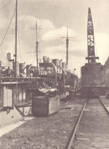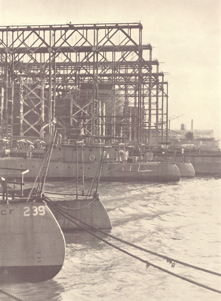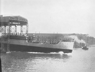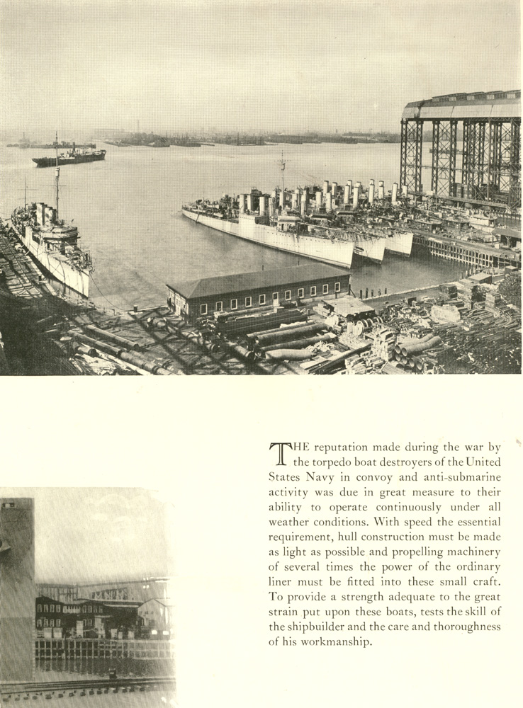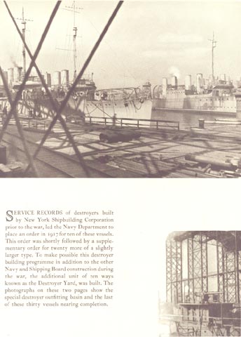 Service records of destroyers built by New York Shipbuilding Corporation prior to the war, led the Navy Department to place an order in 1917 for ten of these vessels. This order was shortly followed by a supplementary order for twenty more of a slightly larger type. To make possible this destroyer building programme in addition to the other Navy and Shipping Board construction during the war, the additional unit of ten ways known as the Destroyer Yard, was built. The photographs on these two pages show the special destroyer outfitting basin and the last of these thirty vessels nearing completion.