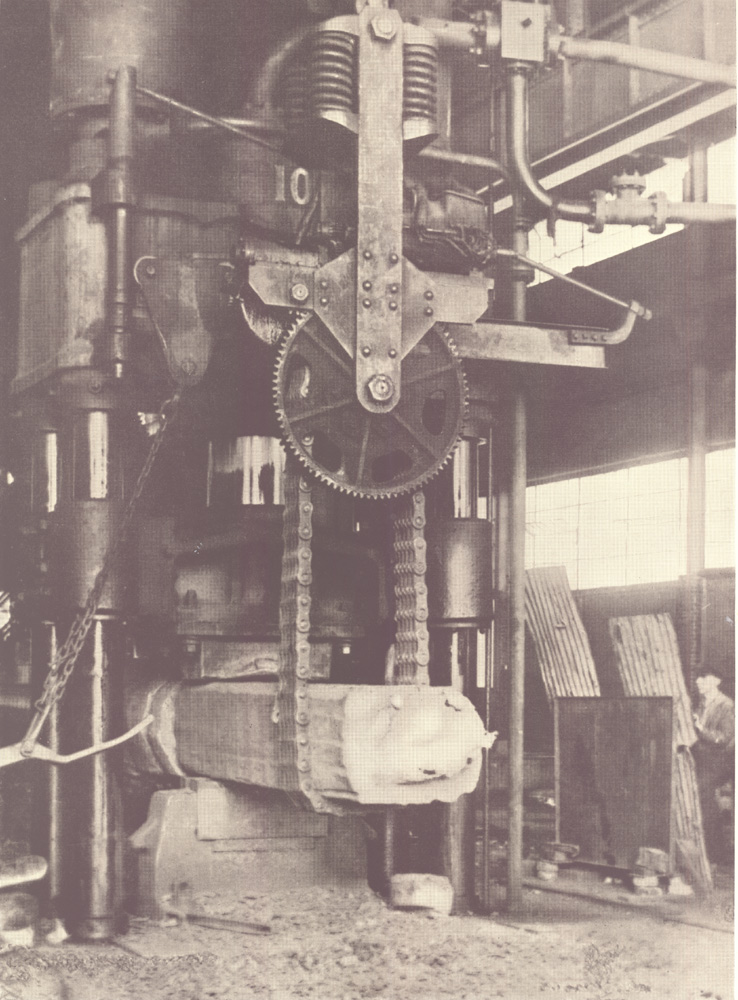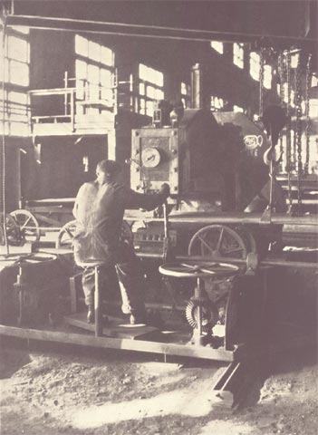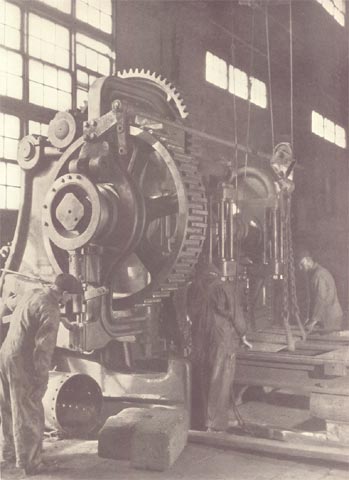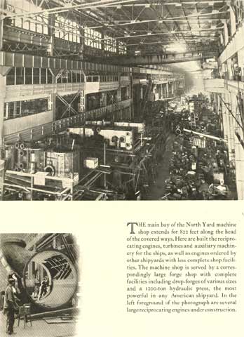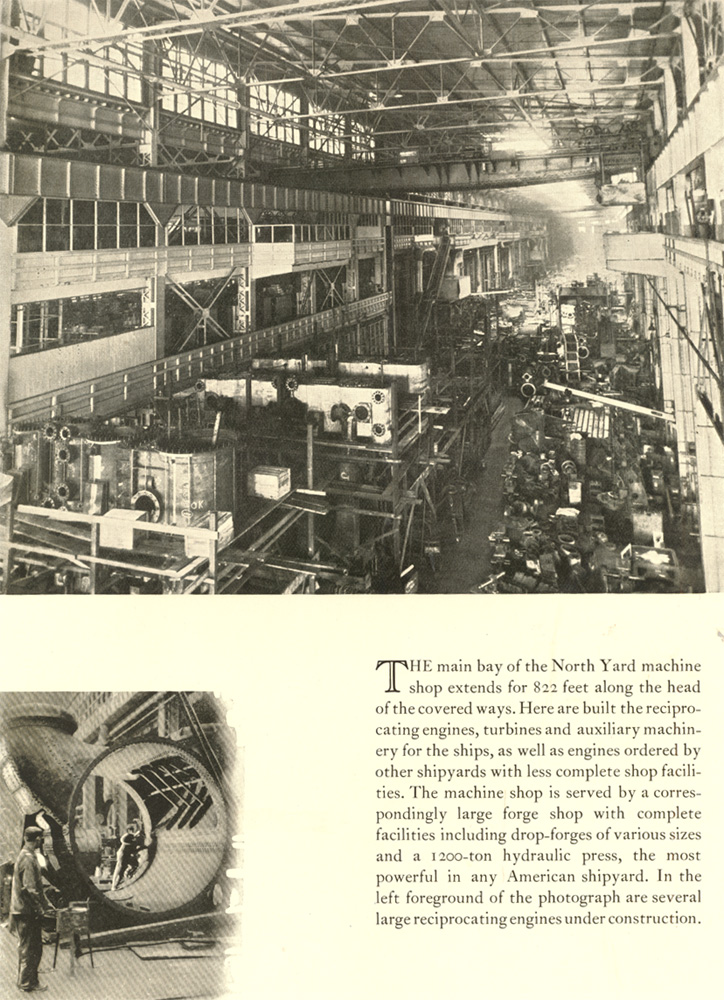 The main bay of the North Yard machine shop extends for 822 feet along the head of the covered ways. Here are built the reciprocating engines, turbines and auxiliary machinery for the ships, as well as engines ordered by other shipyards with less complete shop facilities. The machine shop is served by a correspondingly large forge shop with complete facilities including drop-forges of various sizes and a 12oo-ton hydraulic press, the most powerful in any American shipyard. In the left foreground of the photograph are several large reciprocating engines under construction.