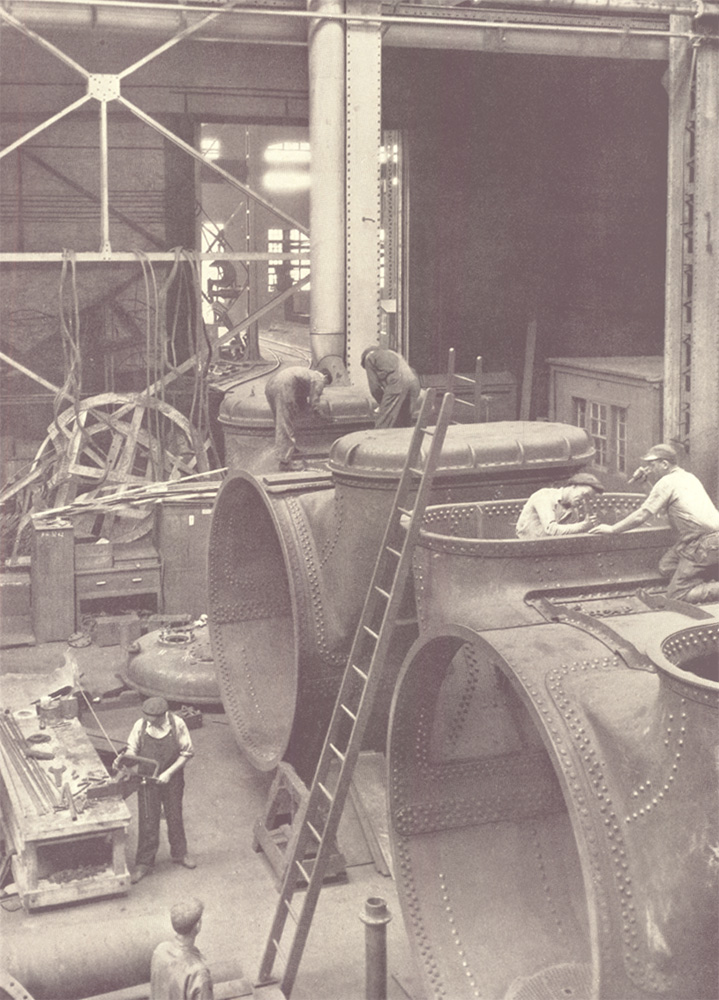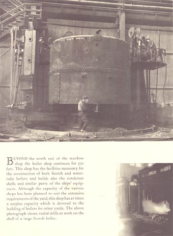 Beyond the north end of the machine shop the boiler shop continues for 500 feet. This shop has the facilities necessary for the construction of both Scotch and water-tube boilers and builds also the condenser shells and similar parts of the ships' equipment. Although the capacity of the various shops has been planned to suit the extensive requirements of the yard, this shop has at times a surplus capacity which is devoted to the building of boilers for other yards. The above photograph shows radial drills at work on the shell of a large Scotch boiler.