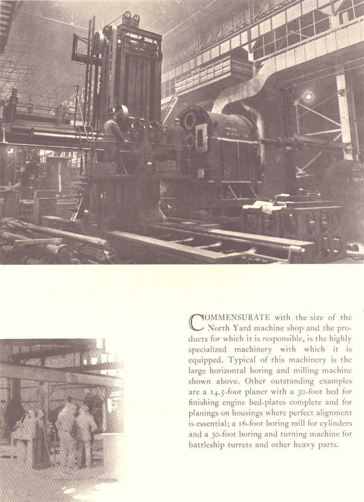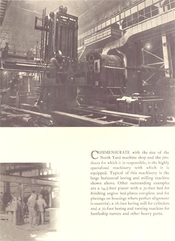 Commensurate with the size of the North Yard machine shop and the pro ducts for which it is responsible, is the highly specialized machinery with which it is equipped. Typical of this machinery is the large horizontal boring and milling machine shown above. Other outstanding examples are a 14.5-foot planer with a 30-foot bed for finishing engine bed-plates complete and for planings on housings where perfect alignment is essential; a 16-foot boring mill for cylinders and a 30-foot boring and turning machine for battleship turrets and other heavy parts.