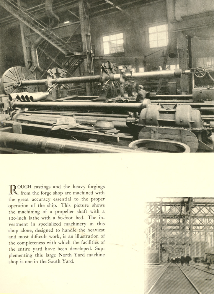 Rough castings and the heavy forgings from the forge shop are machined with the great accuracy essential to the proper operation of the ship. This picture shows the machining of a propeller shaft with a 120-inch lathe with a 6o-foot bed. The investment in specialized machinery in this shop alone, designed to handle the heaviest and most difficult work, is an illustration of the completeness with which the facilities of the entire yard have been developed. Supplementing this large North Yard machine shop is one in the South Yard .