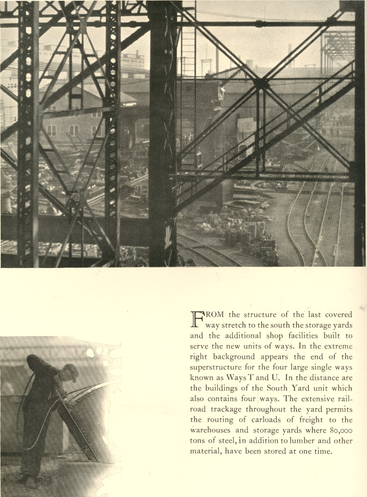 From the structure of the last covered way stretch to the south the storage yards and the additional shop facilities built to serve the new units of ways. In the extreme right background appears the end of the superstructure for the four large single ways known as Ways T and U. In the distance are the buildings of the South Yard unit which also contains four ways. The extensive rail-road trackage throughout the yard permits the routing of carloads of freight to the warehouses and storage yards where 80,000 tons of steel, in addition to lumber and other material, have been stored at one time .