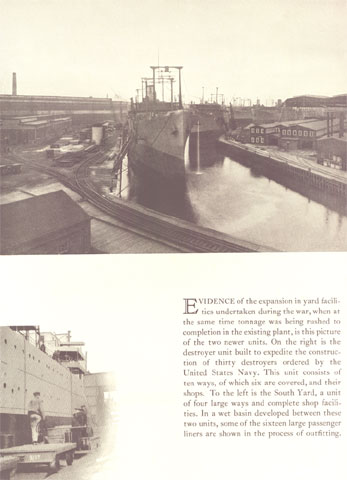 Evidence of the expansion in yard facilities undertaken during the war, when at the same time tonnage was being rushed to completion in the existing plant, is this picture of the two newer units. On the right is the destroyer unit built to expedite the construc-tion of thirty destroyers ordered by the United States Navy. This unit consists of ten ways, of which six are covered, and their shops. To the left is the South Yard, a unit of four large ways and complete shop facili-ties. In a wet basin developed between these two units, some of the sixteen large passenger li ners are shown in the process of outfitting.