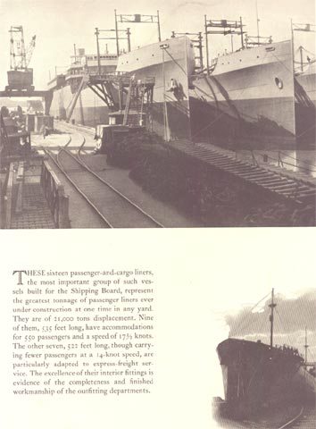 These sixteen passenger-and-cargo liners, the most important group of such vessels built for the Shipping Board, represent the greatest tonnage of passenger liners ever under construction at one time in any yard. They are of 21,000 tons displacement. Nine of them, 535 feet long, have accommodations for 550 passengers and a speed of 1772 knots. The other seven, 522 feet long, though carry-ing fewer passengers at a 14-knot speed, are particularly adapted to express-freight service. The excellence of their interior fittings is evidence of the completeness and finished workmanship of the outfitting departments.