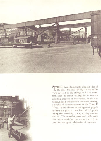 These two photographs give an idea of the crane facilities serving sections of the yard devoted to the storage of heavy material, such as armor plating for battleships awaiting erection on the vessels. In the distance, behind this seventy-ton crane runway, stretches the superstructure of the T and U Ways. In the picture on the opposite page is a thirty-ton gantry crane back of and paralleling the traveling crane, serving another section. The extensive crane and track facilities make available the en tire area of the yard for storage or fabrication of material.