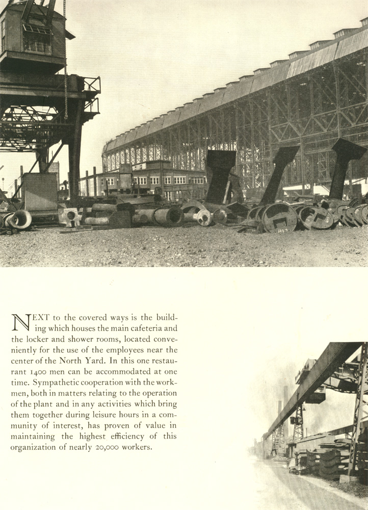 Next to the covered ways is the building which houses the main cafeteria and the locker and shower rooms, located conveniently for the use of the employees near the center of the North Yard. In this one restaurant 1400 men can be accommodated at one time. Sympathetic cooperation with the workmen, both in matters relating to the operation of the plant and in any activities which bring them together during leisure hours in a community of interest, has proven of value in maintaining the highest efficiency of this organization of nearly 20,000 workers.