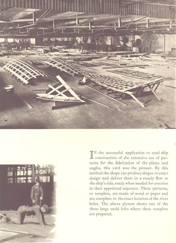 In the successful application to steel ship construction of the extensive use of patterns for the fabrication of the plates and angles, this yard was the pioneer. By this method the shops can produce shapes to exact design and deliver them in a steady flow to the ship's side, ready when needed for erection in their appointed sequence. These patterns, or templets, are made of wood or paper and are complete to the exact location of the rivet holes. The above picture shows one of the three large mold lofts where these templets are prepared.