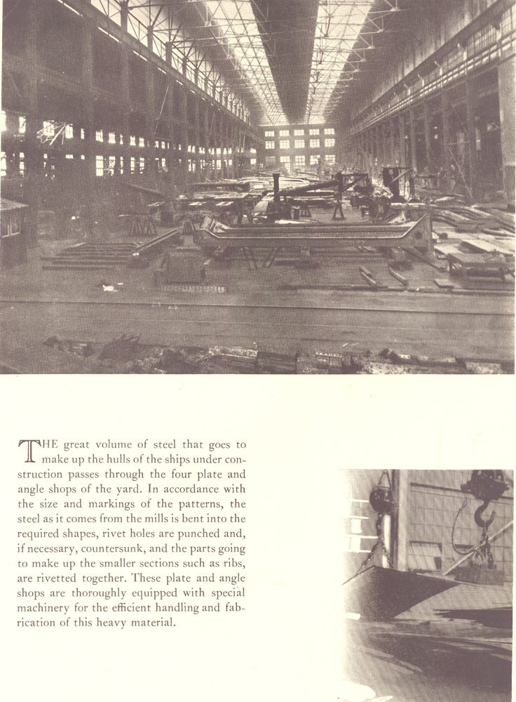 The great volume of steel that goes to make up the hulls of the ships under construction passes through the four plate and angle shops of the yard. In accordance with the size and markings of the patterns, the steel as it comes from the mills is bent into the required shapes, rivet holes are punched and, if necessary, countersunk, and the parts going to make up the smaller sections such as ribs, are riveted together. These plate and angle shops are thoroughly equipped with special machinery for the efficient handling and fab-rication of this heavy material.