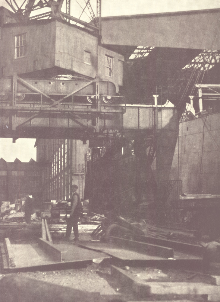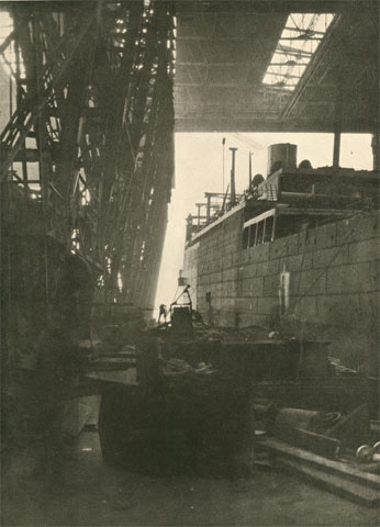 Back from the waterfront is a complete system of shops in which labor-saving machinery and methods have been developed that are now the accepted standards in modern steel ship construction. Passing through these shops the crude material is .made into the thousands of parts that compose the hull, boilers, machinery and equipment of the finished ship. A comprehensive crane system insures the efficient handling of this material throughout the entire course of its fabrication and erection.