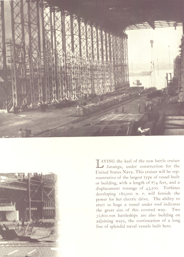 Laying the keel of the new battle cruiser L Saratoga, under construction for the United States Navy. This cruiser will be rep-resentative of the largest type of vessel built or building, with a length of 874 feet, and a displacement tonnage of 43,500. Turbines developing 180,000 H. P. will furnish the power for her electric drive. The ability to erect so huge a vessel under roof indicates the great size of this covered way. Two 32,600-ton battleships are also building on adjoining ways, the continuation of a long line of splendid naval vessels built here.