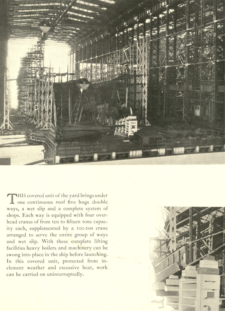 This covered unit of the yard brings under one continuous roof five huge double ways, a wet slip and a complete system of shops. Each way is equipped with four over-head cranes of from ten to fifteen tons capac-ity each, supplemented by a 100-ton crane arranged to serve the en tire group of ways and wet slip. With these complete lifting facilities heavy boilers and machinery can be swung in to place in the ship before launching. In this covered unit, protected from in-clement weather and excessive heat, work can be carried on uninterruptedly.