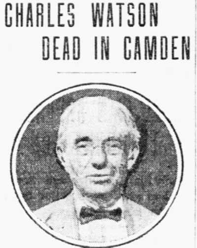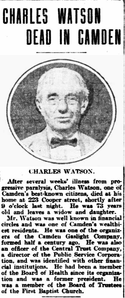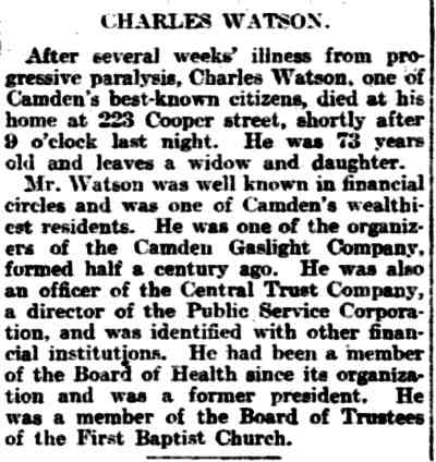 For reasons that are not particularly clear at this time, John R. Watson left Montana and went to live with his brother Charles. He arrived at the family home, 223 Cooper Street at some point after June 6, 1900 when the Census was taken. John R. Watson first appears in Camden City Directories in 1901 at 223 Cooper Street and is last listed at that address in 1908. Charles Watson, one of the best-known businessmen in Camden and one of its wealthiest citizens, died as a result of complications of a stroke in Camden on March 30, 1904, leaving a daughter, Emma, and his wife, the former Hannah Wilson. His first wife, Amanda Archer Starr had died in November of 1873. continued below |