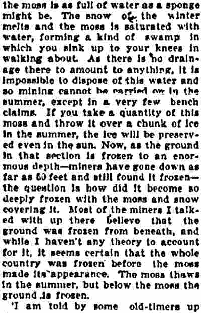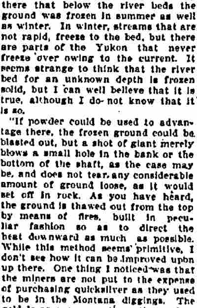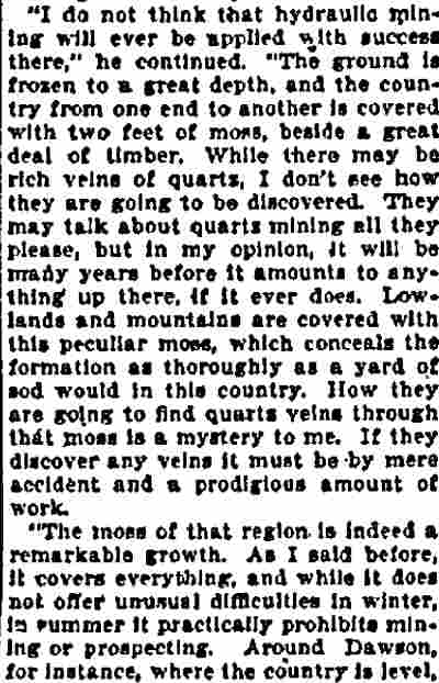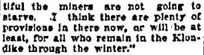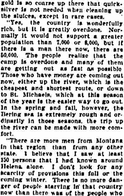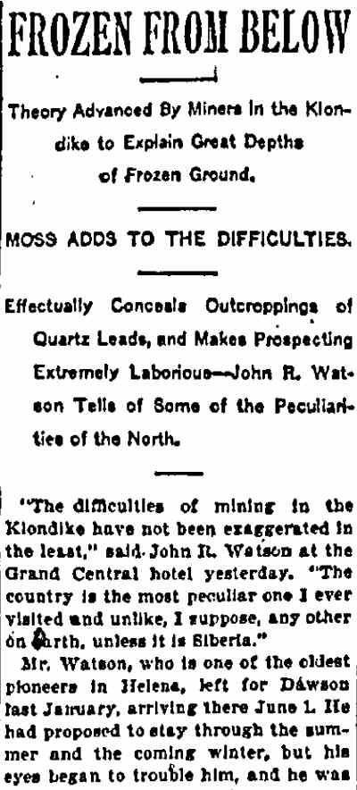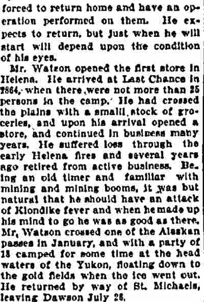 In Camden, Charles Watson appears also to have done quite well, as did his brother-in-law Benjamin F. Archer. A marriage was arranged between Benjamin Archer's sister-in-law Sarah Starr and his younger brother John R. Watson. He traveled east and the two were wed in December of 1868. The couple then returned to Helena, where they were blessed with a son, Jesse Starr Watson, in March of 1870. The 1870 Census shows the Samuel and John Watson, their mother, wives and children living in Helena. Samuel Watson had taken a post as an Internal Revenue collector, while John R. Watson continued in the grocery business. Sadly the family would go through a very tragic period in July if 1870. Young Jesse Watson died on July 7, his mother on July 8, and Leander Watson died on July 11. John R. Watson never remarried. He remained in Helena as late as 1894, where he was a prominent figure in business circles and dabbled in politics. He retired from business around hat time, although he had interests in Helena as late as 1899. When gold was discovered in the Klondike region of Alaska, the pioneer spirit returned to him, and although past 60 years of age, he headed north, leaving for Dawson in January of 1898, and arriving on June 1, with plans to stay throughout the winter into the following year. Trouble with his vision forced a return to Helena in August for an eye operation. He gave a long statement describing conditions in the Klondike, which was published in the Helena Independent newspaper on August 28, 1898. continued below |