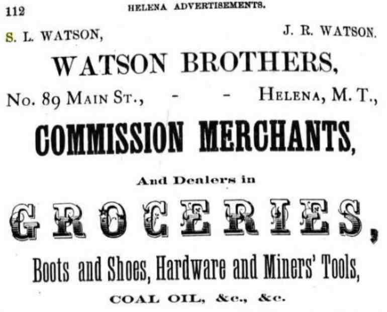 John Randolph Watson was born in Standish, Maine on May 29, 1836. He was the third of four children born to Stephen C. Watson and his wife, the former Lucy Paine, coming after older brothers Samuel S. Watson and Charles Watson, and before sister Phoebe Watson. The family was living in Limington Maine when the Census was taken in 1850. Stephen C. Watson was working as a window sash and blind maker, while older brothers Samuel, 21, and Charles, 19, were, according to the Census, were working as laborers. They more likely were working as apprentices of some sort. Samuel Watson became a goldsmith and traveled extensively through the United States, In 1854 he married Mary P. Ingalls of Tremont, Illinois. Charles Watson moved to Camden, New Jersey. He met and married Amanda Archer in 1856, and by 1859 had opened a grocery in Camden's North Ward. Amanda Archer's younger brother, Benjamin F. Archer, became one of Camden's leading businessmen in the 1800s, as a principal and after 1881 president of the Camden Gas Lighting Company. Benjamin Archer's wife was Catherine Starr, daughter ofJesse W. Starr, who owned the Camden Iron Works foundry, and uncle, John F. Starr, served in Congress and was for many years president of the First Camden National Bank for over 30 years. Samuel S. Watson settled down in Indianola, Iowa in the mid-1850s. His parents and younger brother came to live with him there, sadly his wife Mary passed away there in 1856. John R. Watson worked in Indianola in the late 1850s as a teacher and as a "daguerrian artist", that is to say, as a photographer. What John Watson did between 1859 and 1864 is not known. He came to Montana in 1864, one of the first settlers, with a small stock of groceries, and opened up the first store in what was to become the state capital, Helena. Samuel Watson married again and by 1866 had moved his family and mother to Montana. They to settled in Helena. Samuel Watson's wife Louisa gave birth to a son, Stephen, around 1866. Another son, Leander, was born in 1869. continued below |