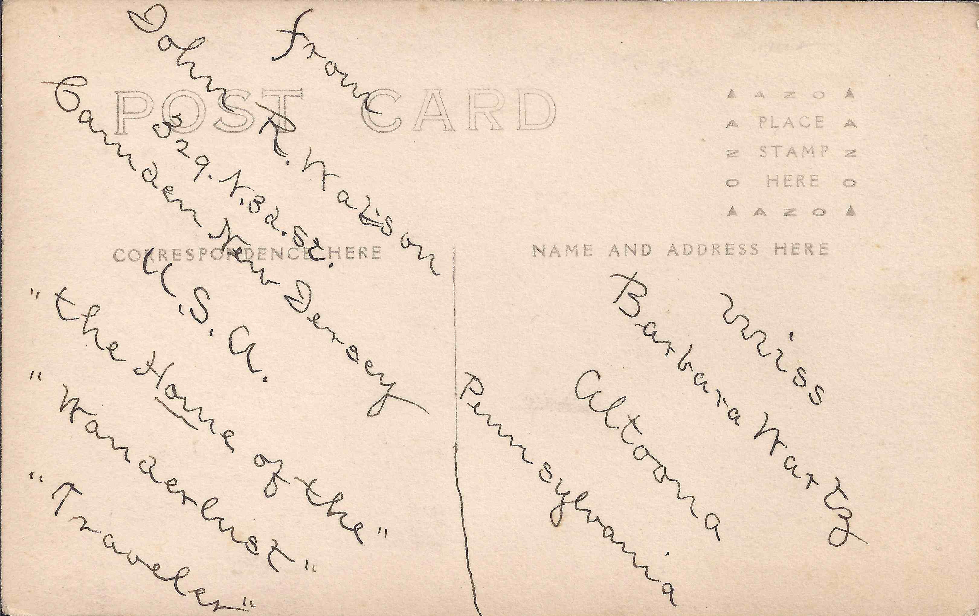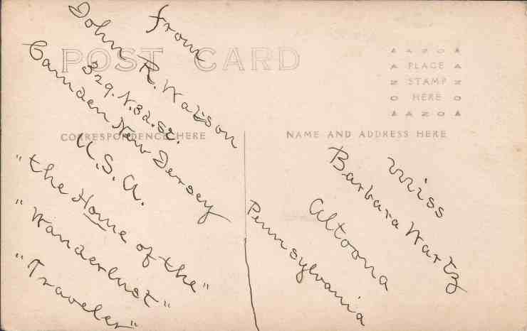 Over Memorial Day weekend of 2015, I received an e-mail from Carl Gainsborough containing the the two scanned images above. As you can see, the never mailed postcard is of a tavern in Standish Corner, and the rear shows the name and address of the sender. Carl called it a mystery… and that is about all it took to get me interested in the card and the people named. The first thing that caught my eye was the address, which Carl took for 329 North 32nd Street. John R. Watson's lower case "d" does resemble a "2", and the actual address was 329 North 3rd Street. I used the address to determine when the postcard had been signed. John R. Watson appeared at that address in the 1910 Census, and in City Directories from 1913 through late 1918. The census of 1920, which was taken in January, shows that he had moved to 300 Cooper Street. That frames the date as being any time between the spring of 1912 and late summer of 1918. With the "when" established, it was time to move on the "who". Who were John R. Watson and Miss Barbara Martz? To date I have not nailed down who Miss Martz was with any certainty. In the case of John R. Watson, I have found quite a bit, and it is a fascinating story taking us into an earlier and quite different time in America. continued below |