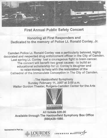 RONALD CONLEY was a career police officer who served the City of Camden for many years before being struck down at an early age by cancer. He was hired by Camden City Police Department in 1986. He left to take a position with the Washington Township Police Department in 1989, but returned to Camden the following year. He rose through the ranks, with promotions to Detective in December of 1991, Sergeant in December of 1995 and to Lieutenant in November of 2001. During his time with the Camden Police Department he received numerous commendations for merit and bravery while part of the Patrol Division, Detective's Bureau, Homicide Division, Member of Narcotics Strike Force and Tactical Force Unit. Ron Conley was also an instructor at the Camden County Police Academy and First Vice President of Camden Organization of Police Superiors. After a courageous battle with brain cancer, Ronald Conley passed away on May 17, 2006 at the age of 40. |