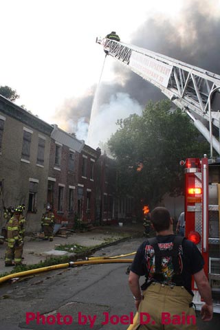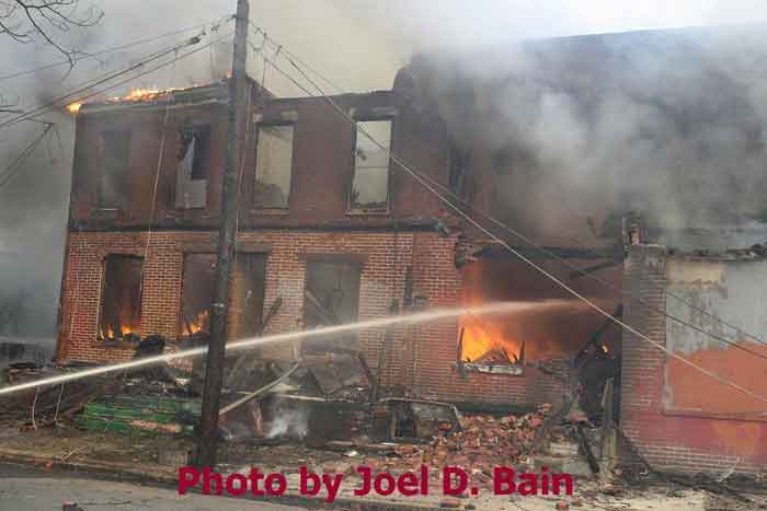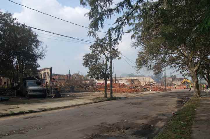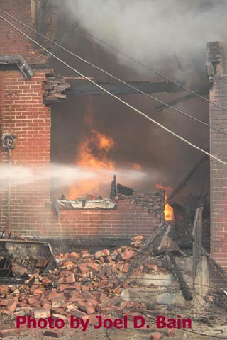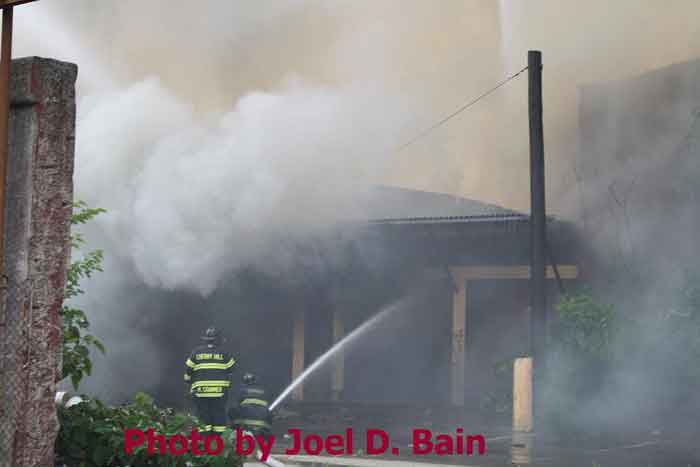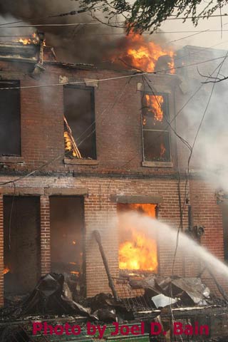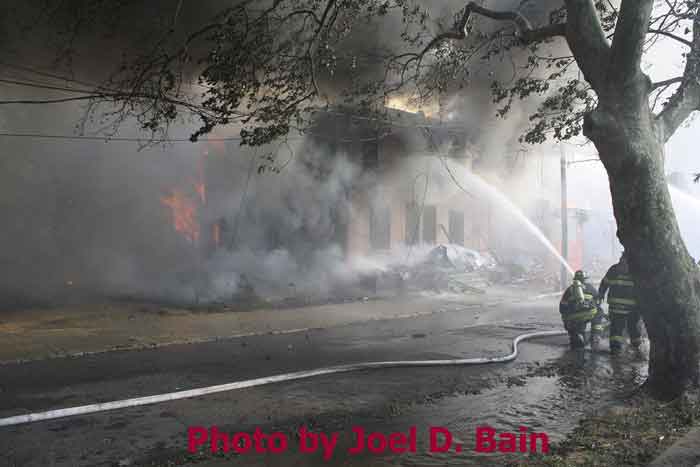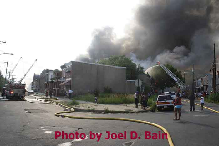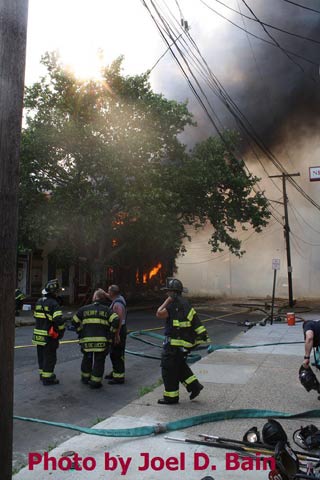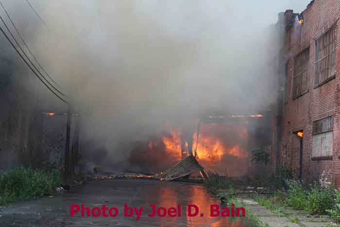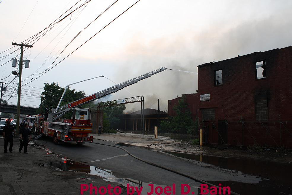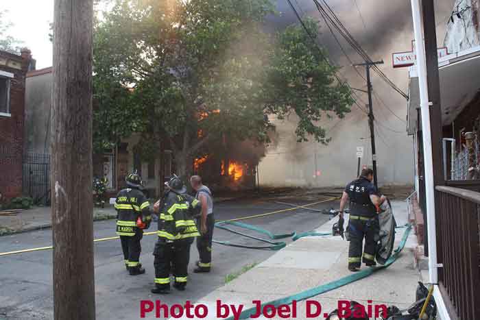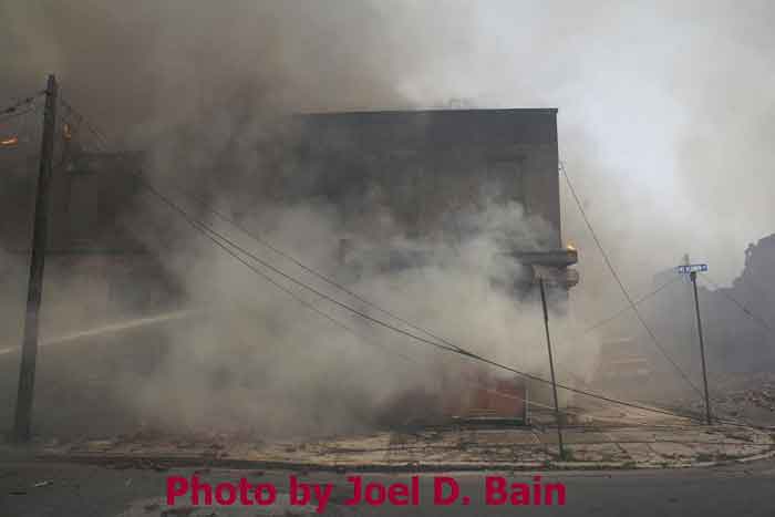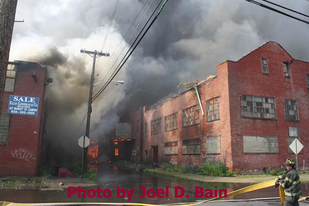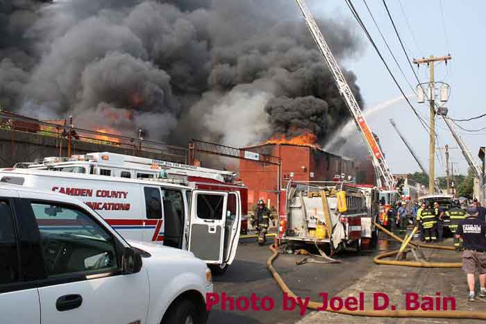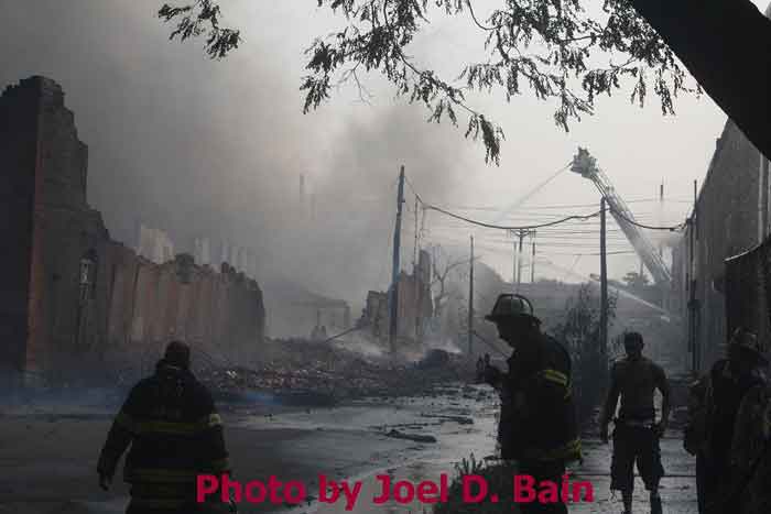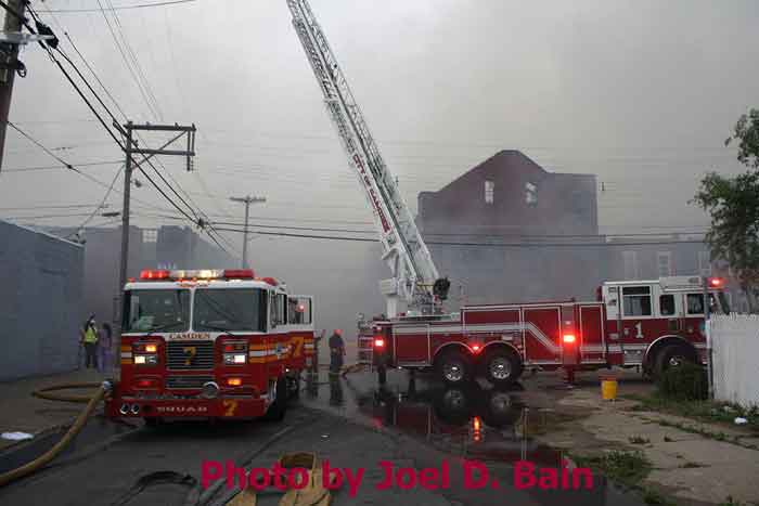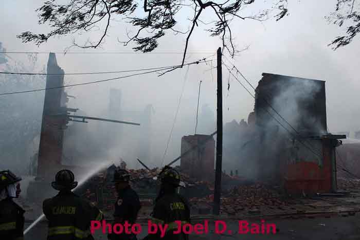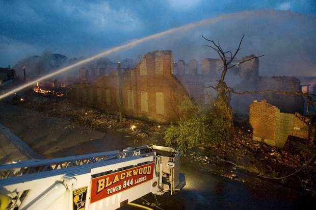 Massive fire destroys warehouse, ten houses in Camden Written by GEORGE MAST and LUCAS K. MURRAY CAMDEN — One of the largest fires in Camden's recent history roared through several blocks in the city's Gateway section Thursday, destroying an abandoned tire warehouse and damaging nearly a dozen homes on neighboring blocks. As dusk turned to darkness, more than five hours after the 12-alarm inferno broke out, blocks of brick buildings had been reduced to smoking rubble with flames still flickering. A burned-out van smoldered and flames licked at the tops of electric poles as well as a tree stump in a neighboring graveyard. The blocks bounded by Mount Vernon Street, Mount Ephraim Avenue, Chestnut Street and Louis Street looked like a war zone. "This is pretty bad," said Camden Fire Chief Michael Harper. "It just started spreading all over the place." Harper said firefighters struggled to find enough water sources to cover the engulfed area. At times, they sat for as long as 10 minutes waiting for water hoses strung throughout the area to receive pressure. Fire officials couldn't begin to tally the total damage done by Thursday night but estimated 10 homes had been destroyed and at least 20 residents displaced. Several of the homes were vacant. There was no word on what caused the fire. No residents were reported injured but at least one fire captain was treated at a local hospital for heat exhaustion. Calls for a three-story structure fire went out over city police radio around 4 p.m. The initial broadcast was for an abandoned apartment building, fully engulfed in flames, but responders soon arrived on the scene to find an abandoned tire distributor. The old Reliable Tire building, abandoned for more than a decade, is just off Mount Ephraim Avenue, between Chestnut and Mount Vernon streets. As firefighters struggled in record high temperatures to get water to all corners of the massive building, flames soon spread to homes on Mount Vernon, Orchard and Louis streets. Black, choking smoke hung like a fog for blocks and rained down sparks and debris as firefighters from as far as Gloucester and Burlington counties were called in for At the height of the blaze, all service was disrupted on the PATCO Hi-Speedline. Hundreds of residents gathered on all sides of the advancing flames to form a sea of spectators, some coming from the suburbs. "It's getting ready to be a disaster," Shakirah Battie said, watching as flames began shooting from the windows of homes on Louis Street. Hector Lopez was among a group of residents along Chestnut Street watching in fear as flames towered over the top of the warehouse and leaned in the wind toward the roofs of a string of row homes. "I'm heartbroken," the 27-year-old said. "(Those are) childhood memories." Lopez was among witnesses who questioned whether the situation would have been different had the city not laid off more than 60 firefighters earlier this year. "All those firefighters that they laid off, this is the reason that we need them," he said. Hours later, even after flames from the warehouse had been knocked down, Lopez wasn't sure of the state of his house, which had also been surrounded by flames in the back. As late as 5 p.m., a resident three homes down from where the blaze roared was out in her bare feet attempting to extinguish small fires along her sidewalk with water from a small pan. Within minutes, flames spread down her block, sending her and dozens of onlookers scrambling to escape rolling black smoke. The outside of Bundy's Joker's Wild Lounge on Haddon Avenue became a makeshift triage center for responders overcome by heat and smoke. To call the fire's aftermath "surreal" would be an understatement. On Haddon Avenue at around 8 p.m., a thin haze of smoke hung over the roadway hours after the fire started. Water cannons from firetrucks shot into the tall, unkempt grass of the Old Camden Cemetery to douse small brush fires sparked by flying cinders. Emergency lights from the dozens of ambulances, police cars and fire trucks that remained cut through the smoke and water, making for an eerie light show. That and the surrounding darkness largely masked the devastation, apparent only when seen up close at the fireground. A burning pick-up truck remained on Mount Vernon Street as a ladder truck from Oaklyn worked to cool off hot spots. Walls of old row homes continued to collapse, their mortar giving way from the intense heat that gutted them earlier. Orchard Street was nothing more than a yard of glowing bricks. The collapsed roof of the block-long main warehouse looked like a massive charcoal grill. Earlier in the evening, Deputy Chief Greg Murphy said propane tanks next to a nearby home had exploded in the fire. He was one of the first firefighters on the scene. Murphy said it was as bad a fire as he has ever seen in the city. As if the situation couldn't get any stranger, a quick-moving thunderstorm with a dramatic lightning display poured down. Firefighters taking a rest sought refuge underneath large open doors that protect the equipment on their trucks. "Right now our main concern is the safety of the residents and of the firefighters," City Spokesman Robert Corrales said. "We opened up one of our community centers and as firefighters rotate out, we bring them there to cool off. We're also bringing in displaced families, getting their information and connecting them with the Red Cross." City officials maintained water pressure was not an issue in fighting Thursday's fire. Seven families—a total of 26 people—were displaced as a result of the fire according to Camy Trinidad, executive director of the Camden County American Red Cross. They were evacuated to a shelter elsewhere in the city and later transferred to area hotels. "We'll have further assessment of their homes going forward," Trinidad said. "Some don't know how bad the fire was." The families were given gift cards for restaurants and clothing stores -- temporary assistance