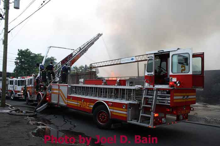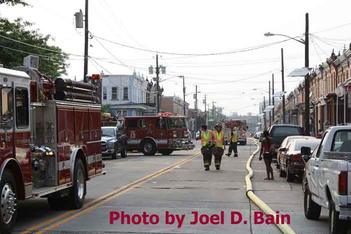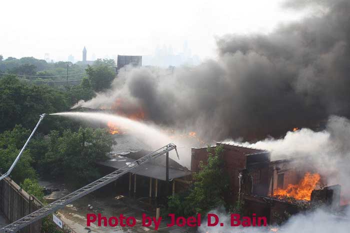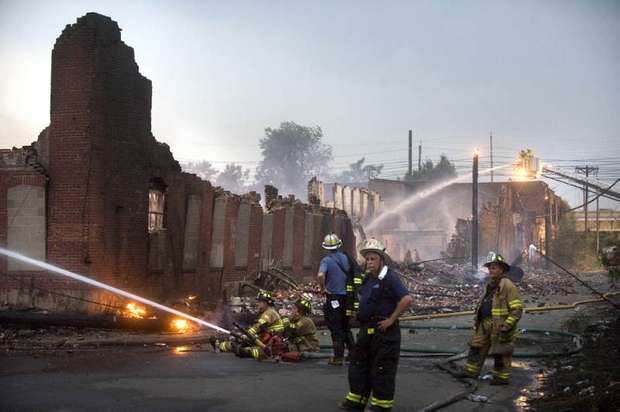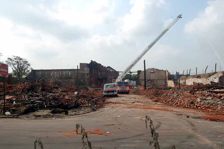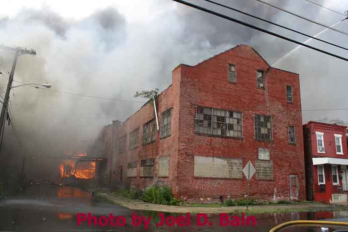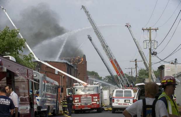 Just after 8 p.m., as storms rolled into the area, fire officials said the blaze had been contained. It was declared under control shortly after 9 p.m. At least three firefighters were hospitalized for heat exhaustion. The fire engulfed vacant buildings formerly used by Reliable Tire Distributors and the Board of Education in the area of Orchard Street and Mount Ephraim Avenue in Camden's Parkside neighborhood. [Friday morning, neighboring sections of Chestnut Street and Mount Ephraim Avenue were still closed to traffic, and investigators were at the scene.] The fire erupted around 4:30 p.m., city spokesman Robert Corrales said. Less than two hours later, fire officials struck a 12th alarm. Dark smoke could be seen for miles as flames spread to neighboring vacant homes. "It was like a firestorm," Camden Fire Chief Michael Harper said. Eleven displaced families were being aided by the Red Cross, Harper said. Several other families made their own arrangements for the night. The cause of the blaze was under investigation. Reliable Tire Distributors moved to Gloucester Township around 1999. A member of the Betz family, which had owned the company, declined to comment on the fire and referred a reporter to a lawyer who could not be reached. The abandoned buildings had become a nuisance, attracting thieves and vandals, said Richard Gaines, who lives above the three small businesses he owns on Haddon Avenue and Mount Vernon Street. "They took out pipes and copper, anything they could find," he said. The blistering afternoon heat and wind caused the fire to spread quickly, said Al Ashley, president of the union that represents superior officers in the Camden Fire Department. "I've been here 24 years and . . . I've never seen anything like that," he said. Firefighters also struggled because they did not have enough engine companies to provide water, Ashley said. "A lot of hydrants are on the same grid, so now we're [also] dealing with water pressure," he said, holding a walkie-talkie on Sycamore Street, where firefighters were pulling boards from closed-up vacant homes in case the fire spread further. Hector Lopez, 28, was sitting on his couch watching television when he smelled smoke and called 911. He said he and his family left the house and saw smoke coming from the vacant Board of Education building next door. Flames started to shoot from the old tire building two doors down, and "then it went everywhere," Lopez said. A PSE&G spokesperson said fire damage to wiring and poles caused the outage. The Red Cross also confirmed it is now assisting 55 displaced residents, including more than 20 children. Meanwhile, Gloucester Township-based Reliable Tire Company issued a statement today saying the media had incorrectly referred to the building that caught fire and spread to neighboring homes. Reliable says it merely leased the space from 1964 to 1999 but did not own it. "It is incorrect to refer to the building as The Reliable Tire Building," the statement said. "It is a misleading nickname and not legally accurate. " On June 16, 1999, Reliable Tire Company left the building as a tenant, leaving their space in broom-clean condition - clear of all inventory and equipment." |