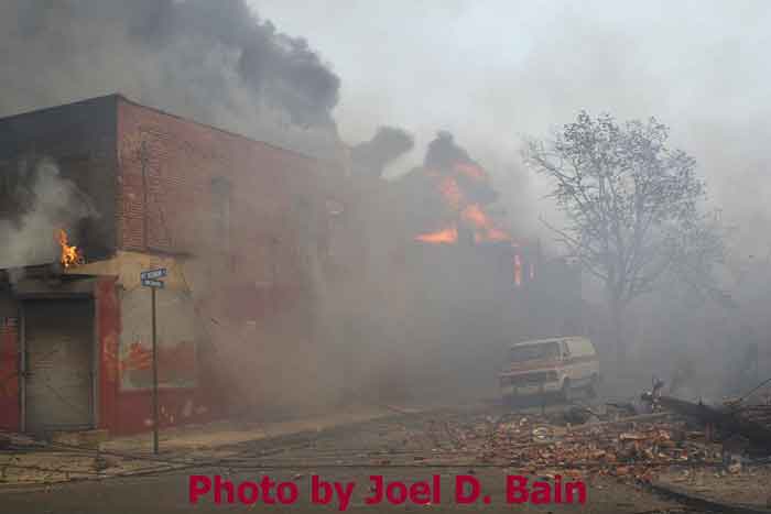 Fire at the "Reliable Tire" building, 1115 Chestnut Street, as seen from Louis Street and Chestnut Street - Photo by Ted Aurig |