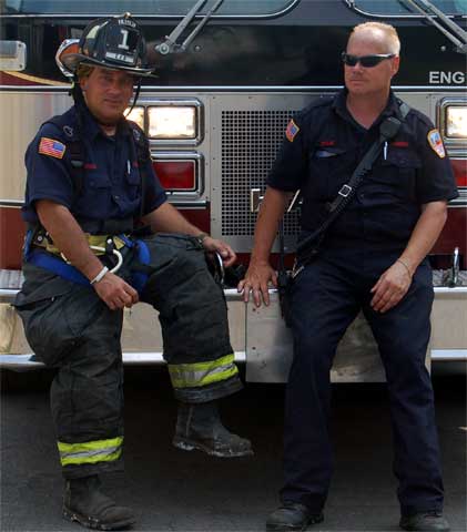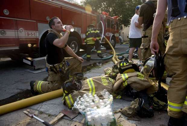 As temperatures near 100 degrees, firefighters catch their breath