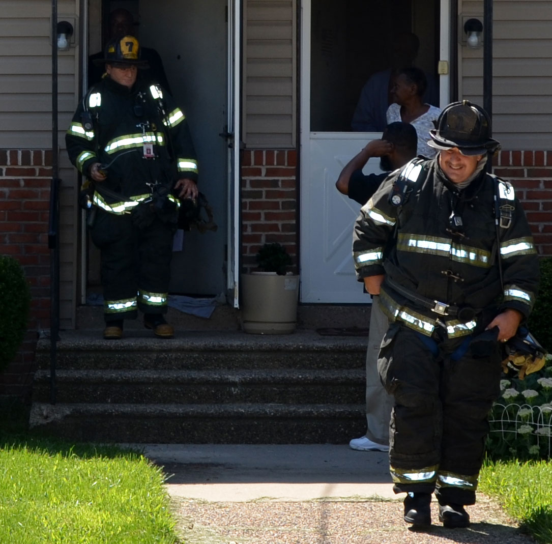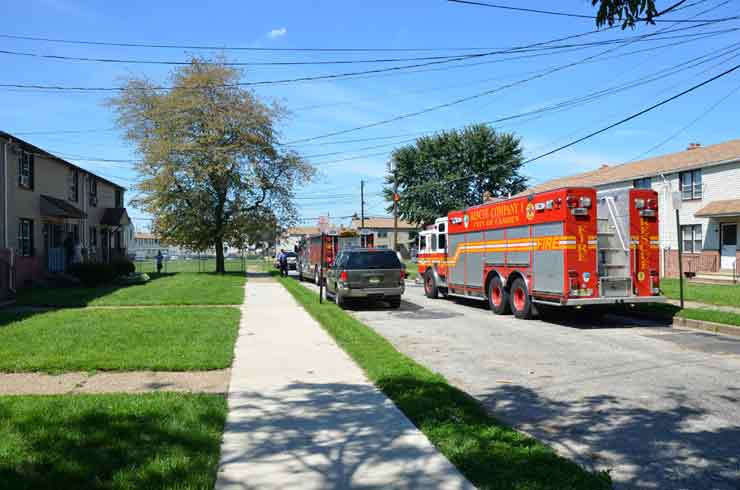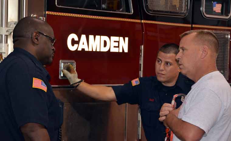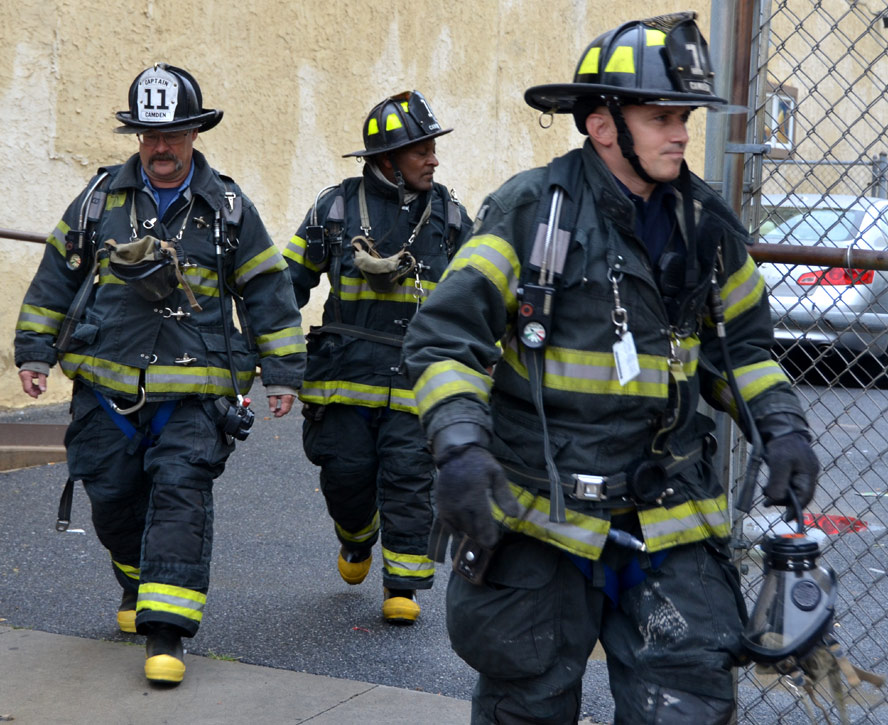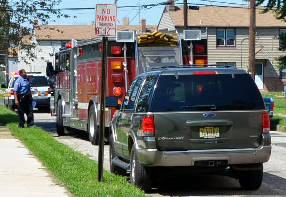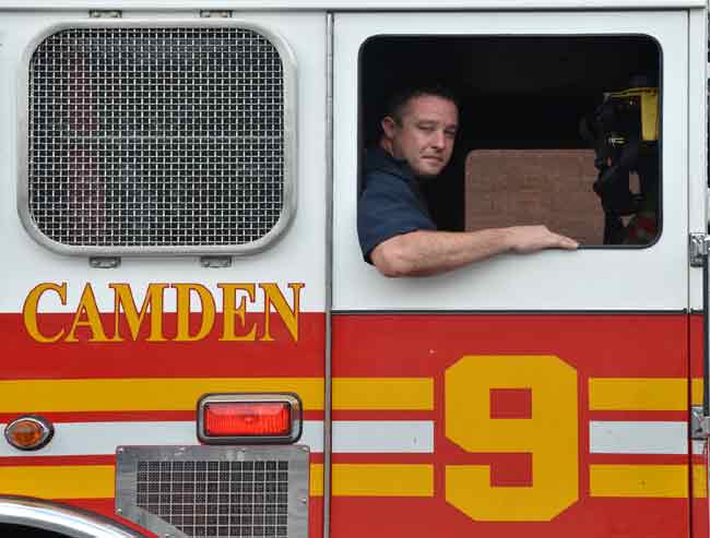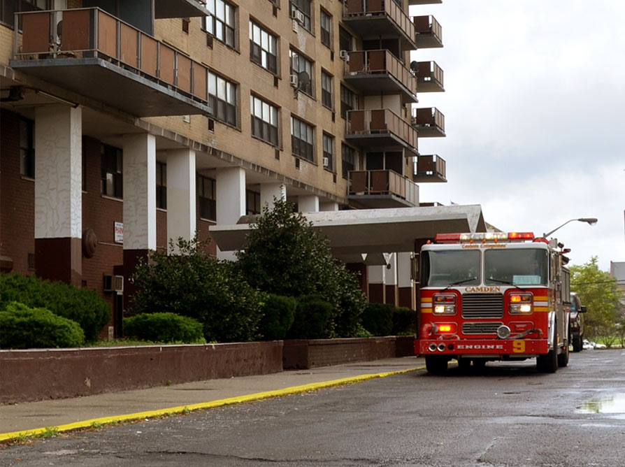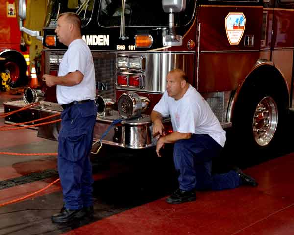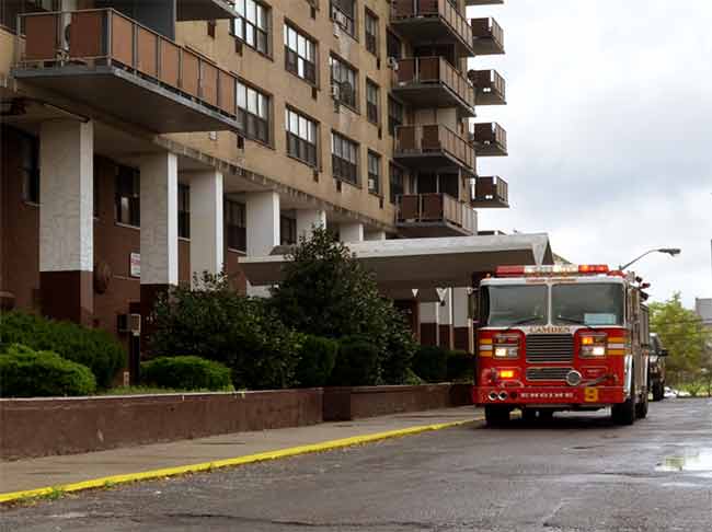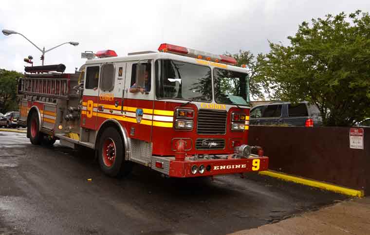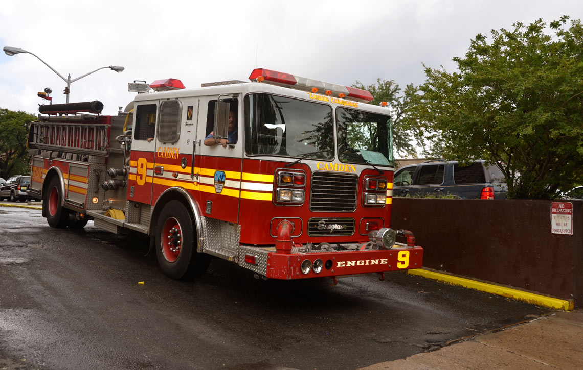 A day does not go by, and sometimes it seems like an hour has not passed, without a call for services at the Northgate I apartments, 433 North 7th Street. Often the call is in response to an alarm malfunction, sometimes an intentional false alarm, and then there are the calls for rescue service, fires in the trash chute, and the ever-popular "pot of meat"- careless cooking which triggers smoke and fire alarms. Each call must be thoroughly investigated and dealt with. In this case, during the morning hours of September 7, 2011 it was Engine Company 9, led by Captain Larry Buckingham, who was sent to investigate. Repeated alarm malfunctions on this day resulted in the alarm being taken off-line while repairs were being made. A Camden Fire Department inspectore arrived on scene monitor the repairs, and Engine 9 left to return to quarters. Before they got back to the East Camden firehouse, they would be sent on another run. |