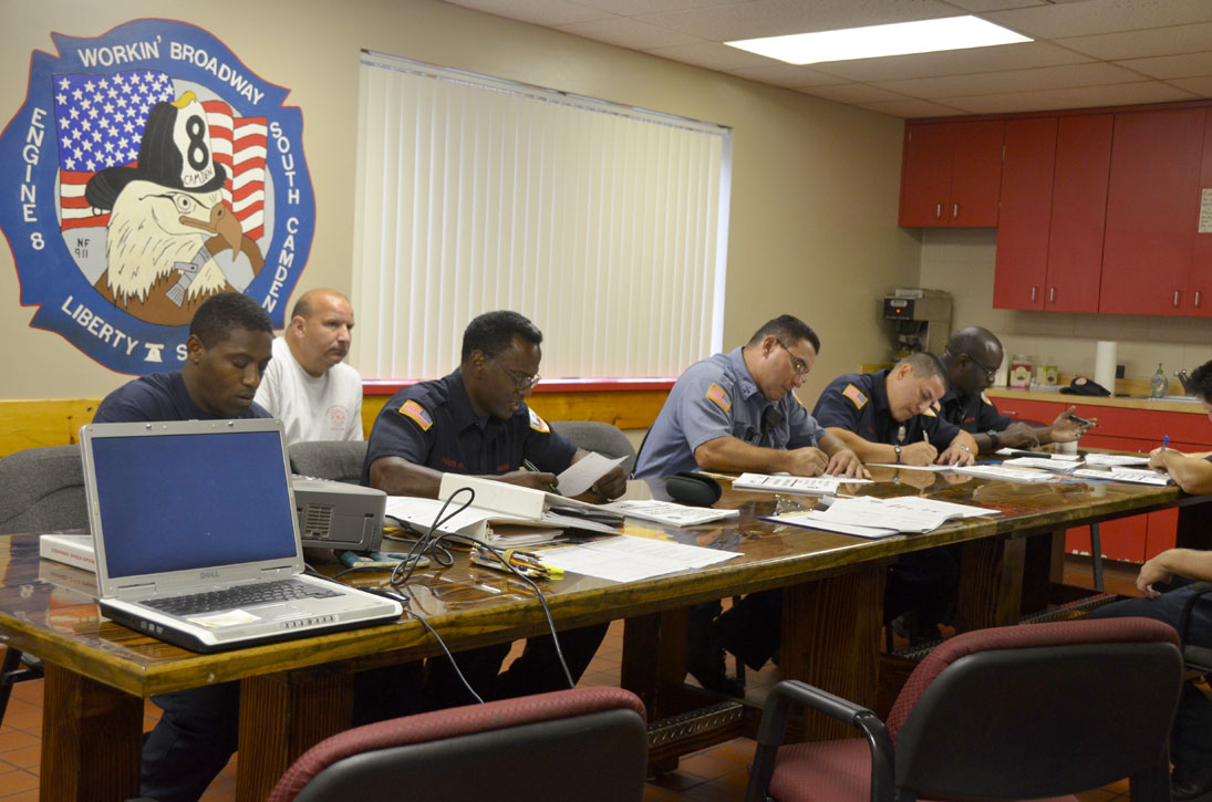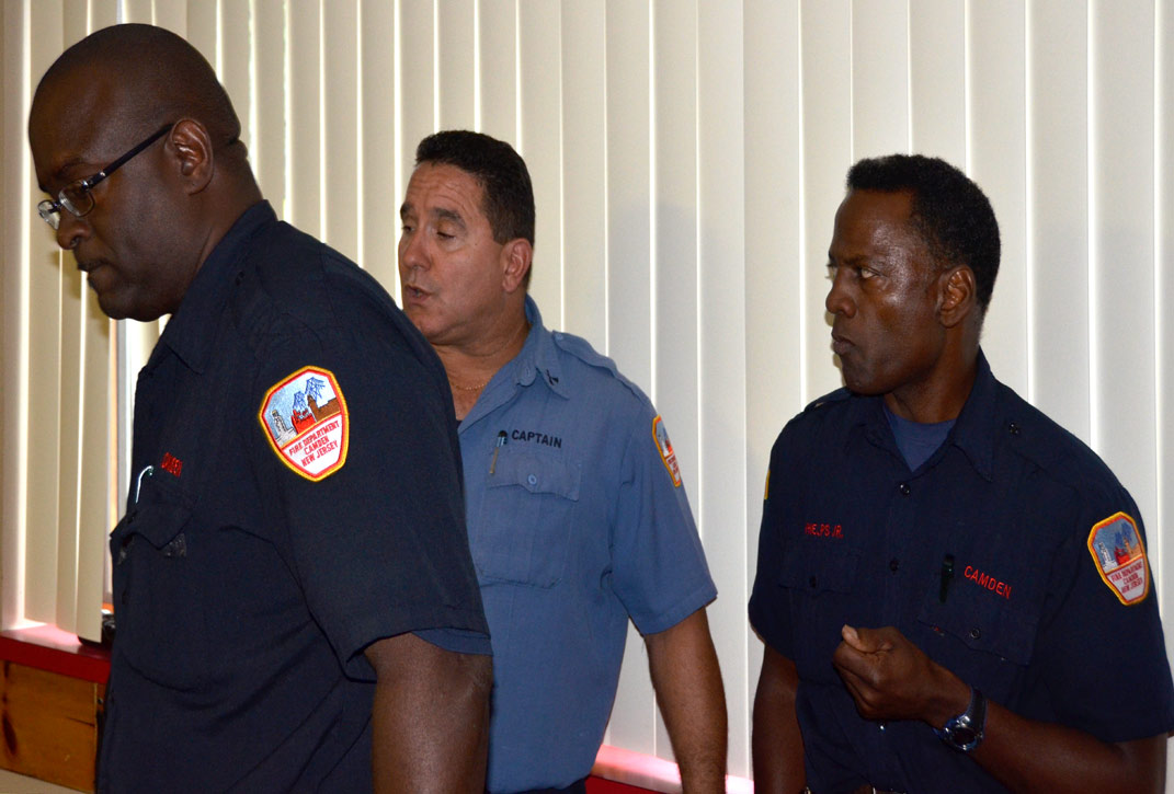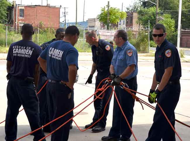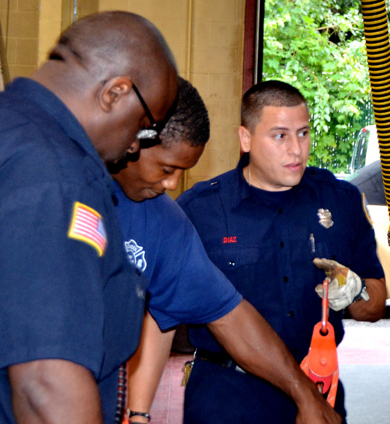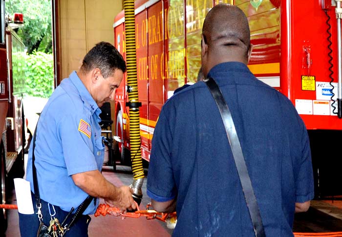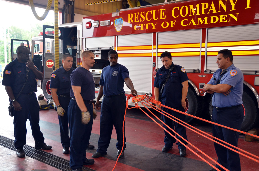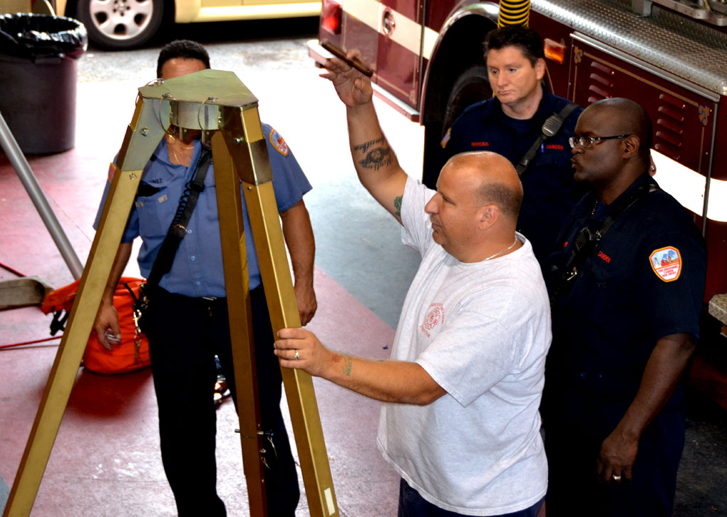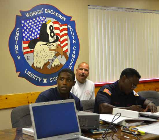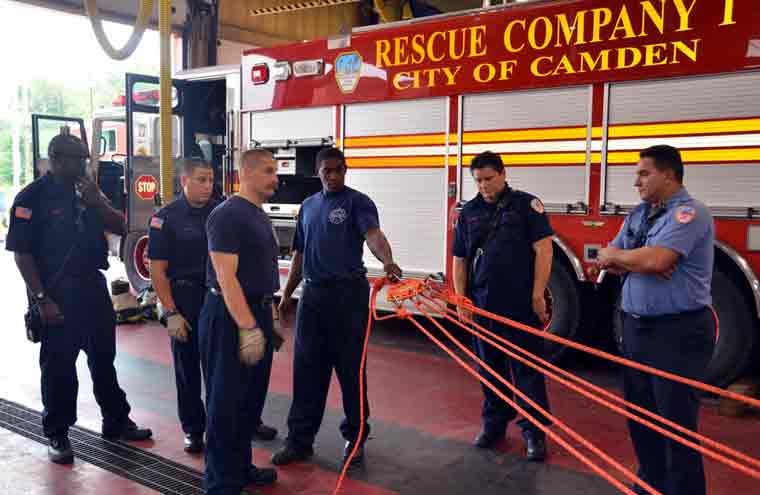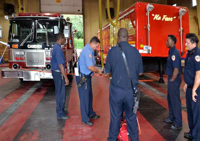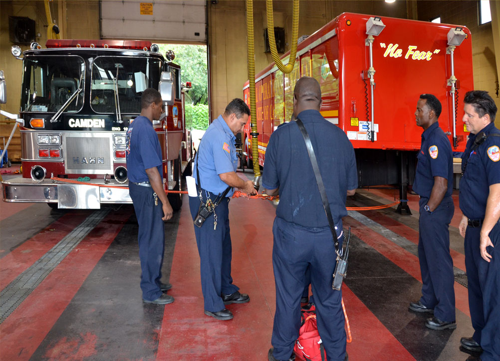 The continuous training that members of the Camden Fire Depart undergo for the most part goes unnoticed by the general public. Even when services are rendered as in the numerous call this summer to rescue drivers who drove their cars into high water, few if any give moment's thought to how the firefighters learned how to safely extricate them from their vehicles, and few give a moment's thought to the fact that the firefighter's oftentimes put themselves at risk to save the lives of others. As stated above, seven out of ten deaths involving rescue operations are suffered by those attempting the rescue, not the party who is the subject of the rescue. On September 8, 2011 I had the privilege to sit on on a training given at the Liberty Station firehouse, given to members of Squad Company 7, First Platoon concerning rescue operations in confined spaces. The instructors were Captains Frank Sandrock, David Dilks, and Herbert C. Leary. The members of Squad 7 being trained were Captain Manny Martinez and Firefighters, Lacy Phelps Jr., David Diaz, Kenneth White, Frank Thompson, and Gamalier Rivera. Firefighter Brian Beach, who was present that day, had already received the training. Later that evening, the members of Squad 7 put this training to use, extricating a motorist from his vehicle after he drove it into high water in South Camden. |