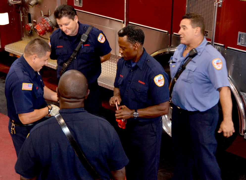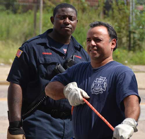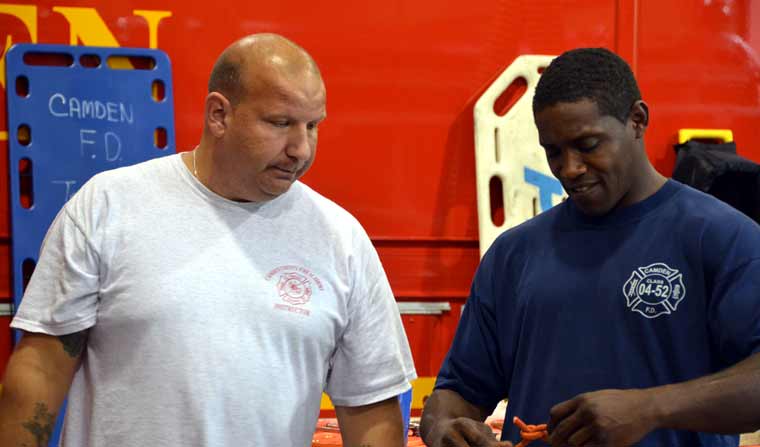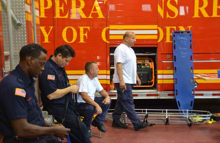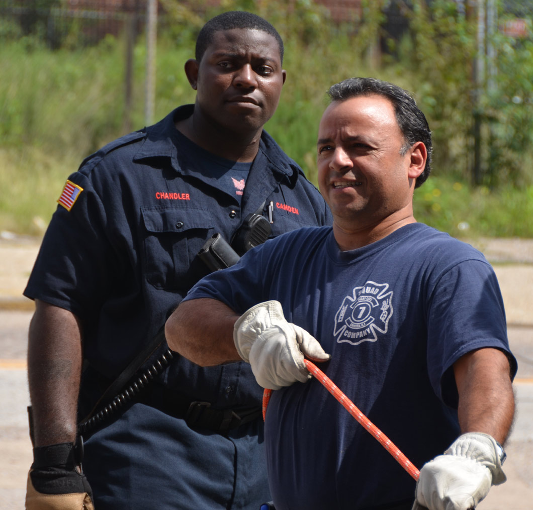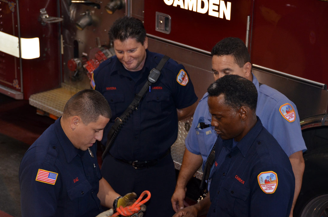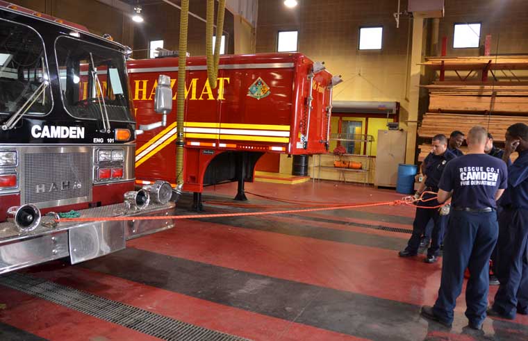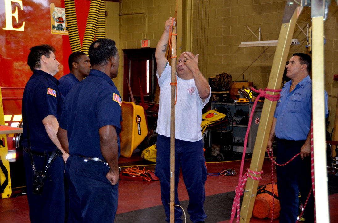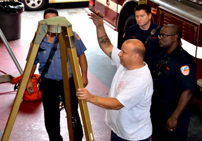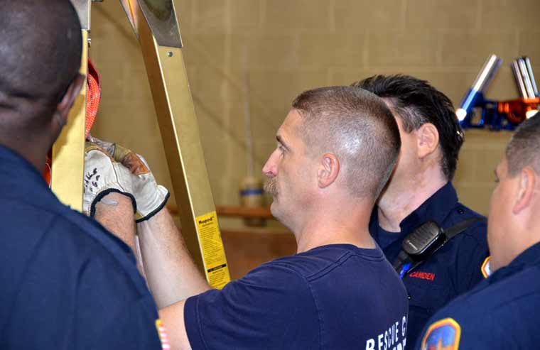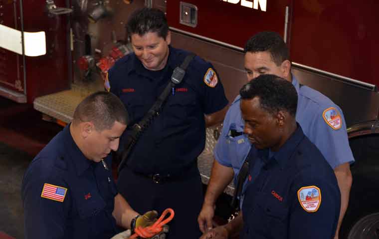 The continuous training that members of the Camden Fire Depart undergo for the most part goes unnoticed by the general public. Even when services are rendered as in the numerous call this summer to rescue drivers who drove their cars into high water, few if any give moment's thought to how the firefighters learned how to safely extricate them from their vehicles, and few give a moment's thought to the fact that the firefighter's oftentimes put themselves at risk to save the lives of others. As stated above, seven out of ten deaths involving rescue operations are suffered by those attempting the rescue, not the party who is the subject of the rescue. On September 8, 2011 I had the privilege to sit on on a training given at the Liberty Station firehouse, given to members of Squad Company 7, First Platoon concerning rescue operations in confined spaces. The instructors were Captains Frank Sandrock, David Dilks, and Herbert C. Leary. The members of Squad 7 being trained were Captain Manny Martinez and Firefighters, Lacy Phelps Jr., David Diaz, Kenneth White, Frank Thompson, and Gamalier Rivera. Firefighter Brian Beach, who was present that day, had already received the training. Later that evening, the members of Squad 7 put this training to use, extricating a motorist from his vehicle after he drove it into high water in South Camden. |