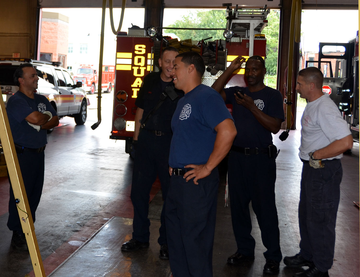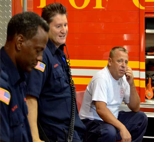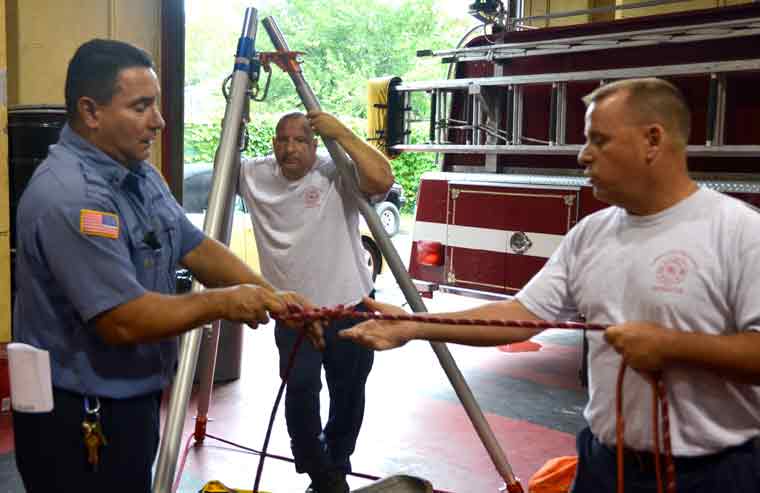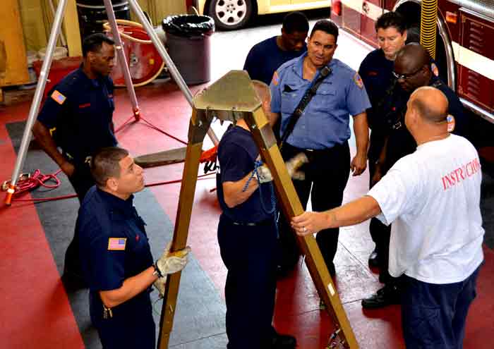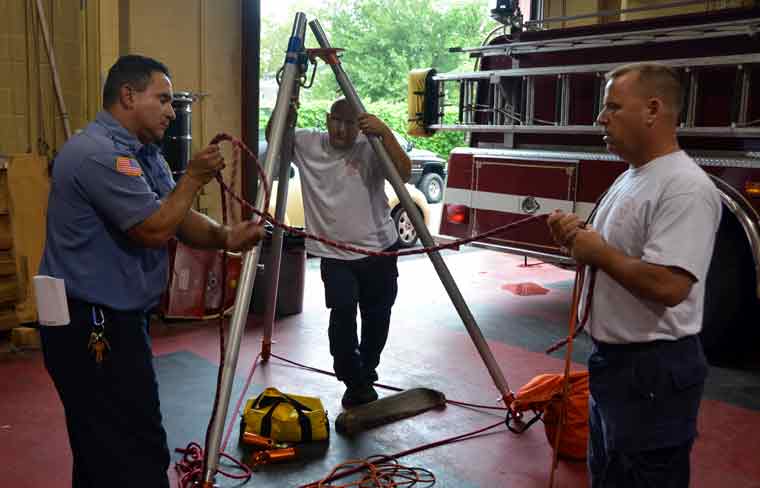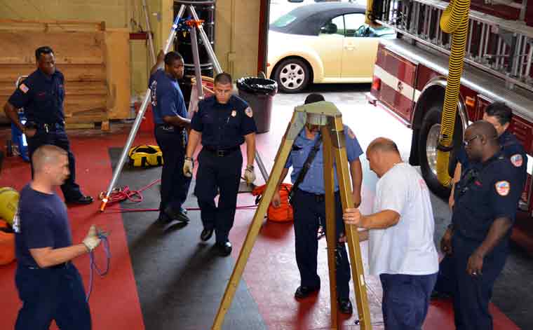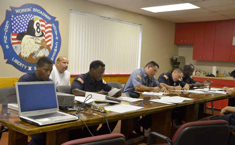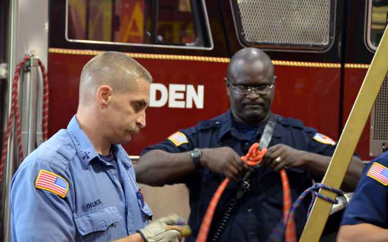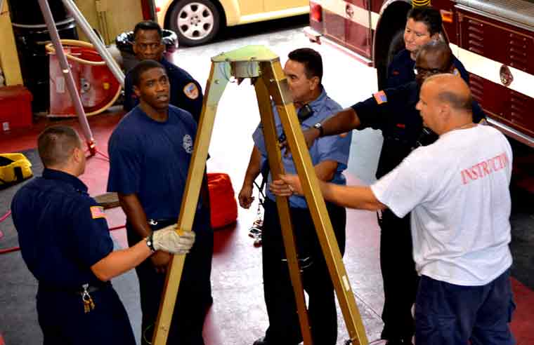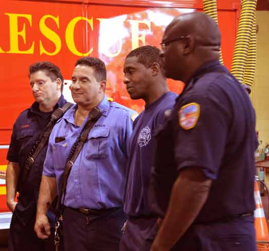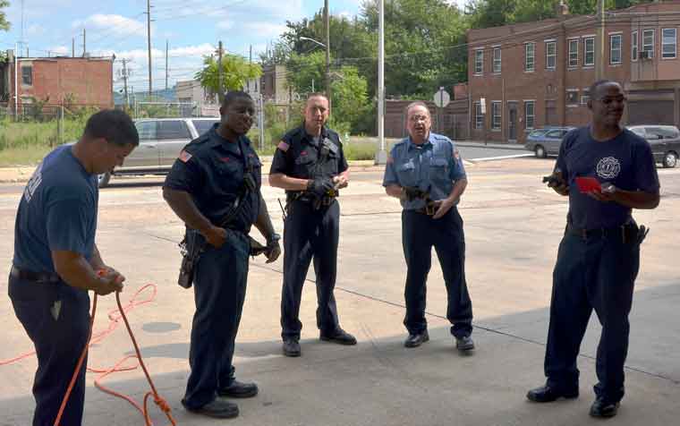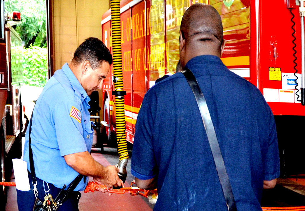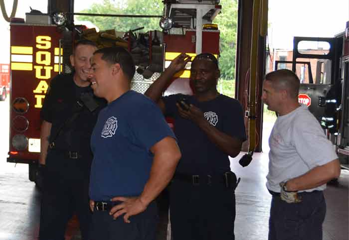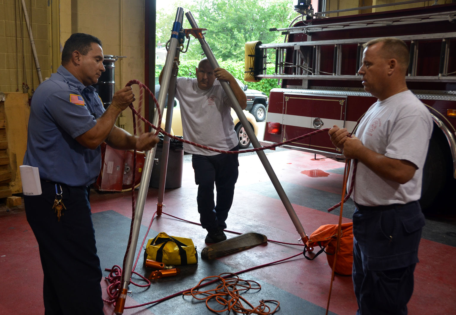 The continuous training that members of the Camden Fire Depart undergo for the most part goes unnoticed by the general public. Even when services are rendered as in the numerous call this summer to rescue drivers who drove their cars into high water, few if any give moment's thought to how the firefighters learned how to safely extricate them from their vehicles, and few give a moment's thought to the fact that the firefighter's oftentimes put themselves at risk to save the lives of others. As stated above, seven out of ten deaths involving rescue operations are suffered by those attempting the rescue, not the party who is the subject of the rescue. On September 8, 2011 I had the privilege to sit on on a training given at the Liberty Station firehouse, given to members of Squad Company 7, First Platoon concerning rescue operations in confined spaces. The instructors were Captains Frank Sandrock, David Dilks, and Herbert C. Leary. The members of Squad 7 being trained were Captain Manny Martinez and Firefighters, Lacy Phelps Jr., David Diaz, Kenneth White, Frank Thompson, and Gamalier Rivera. Firefighter Brian Beach, who was present that day, had already received the training. Later that evening, the members of Squad 7 put this training to use, extricating a motorist from his vehicle after he drove it into high water in South Camden. |