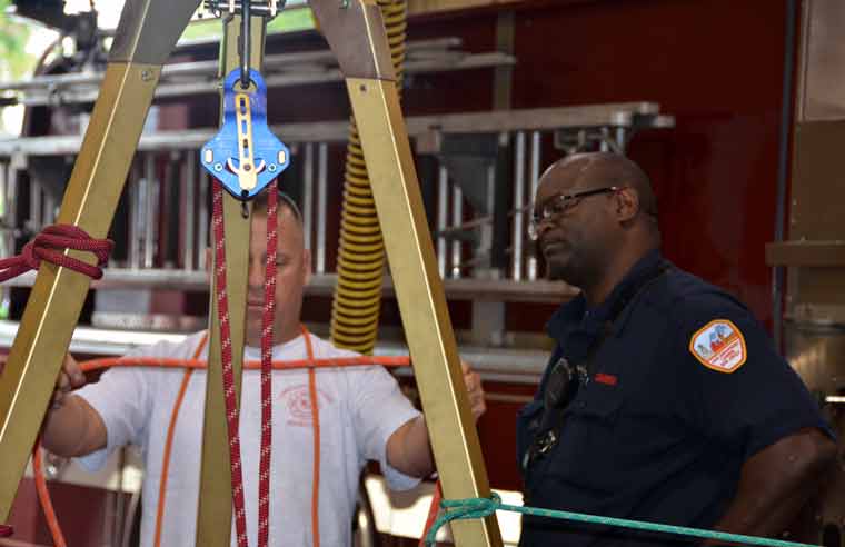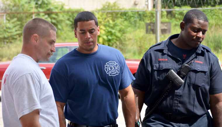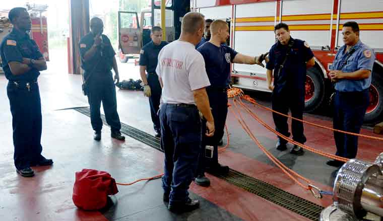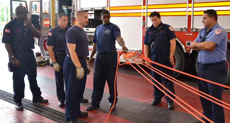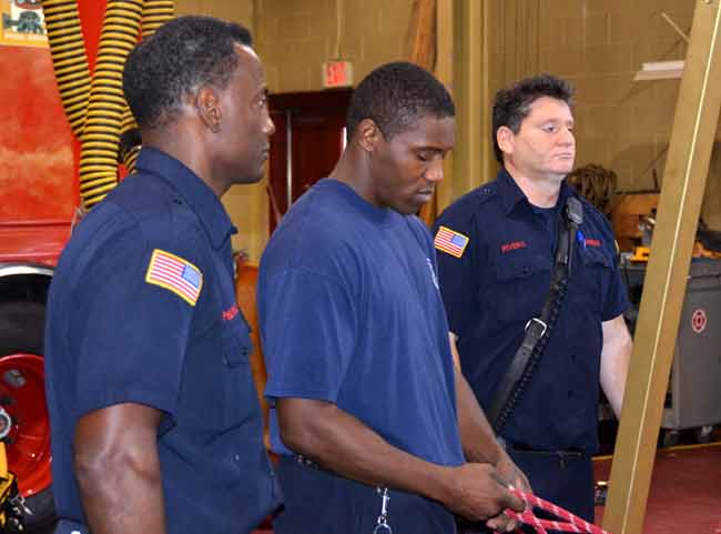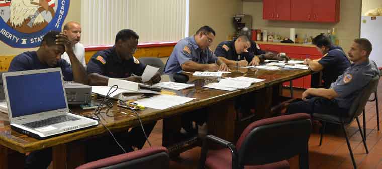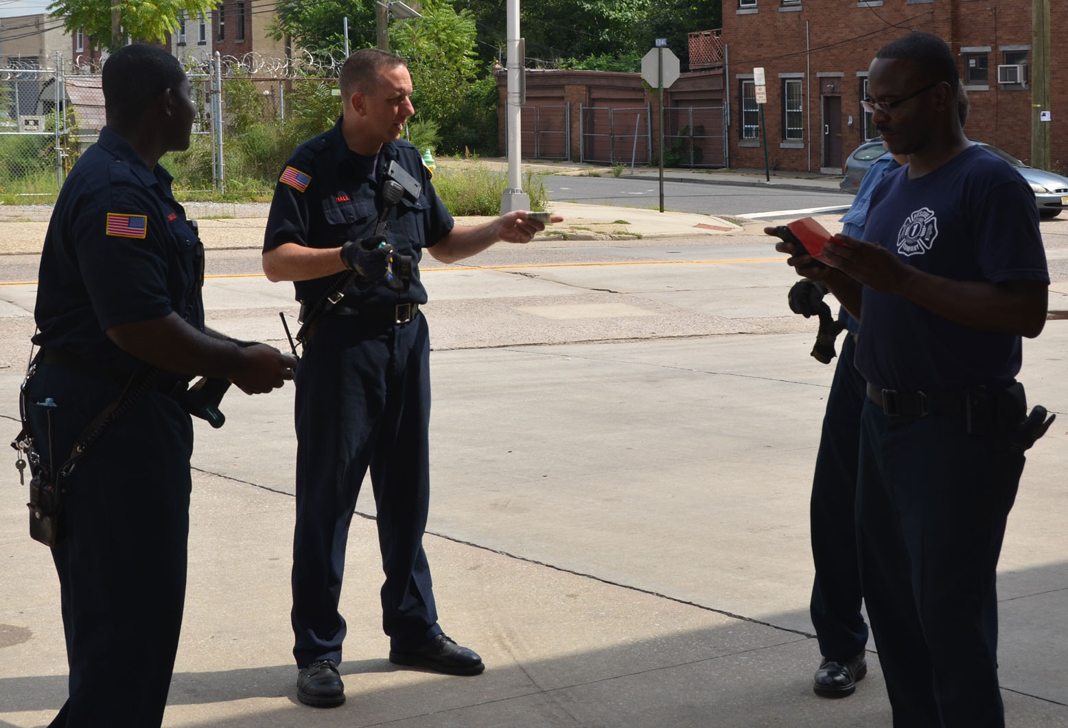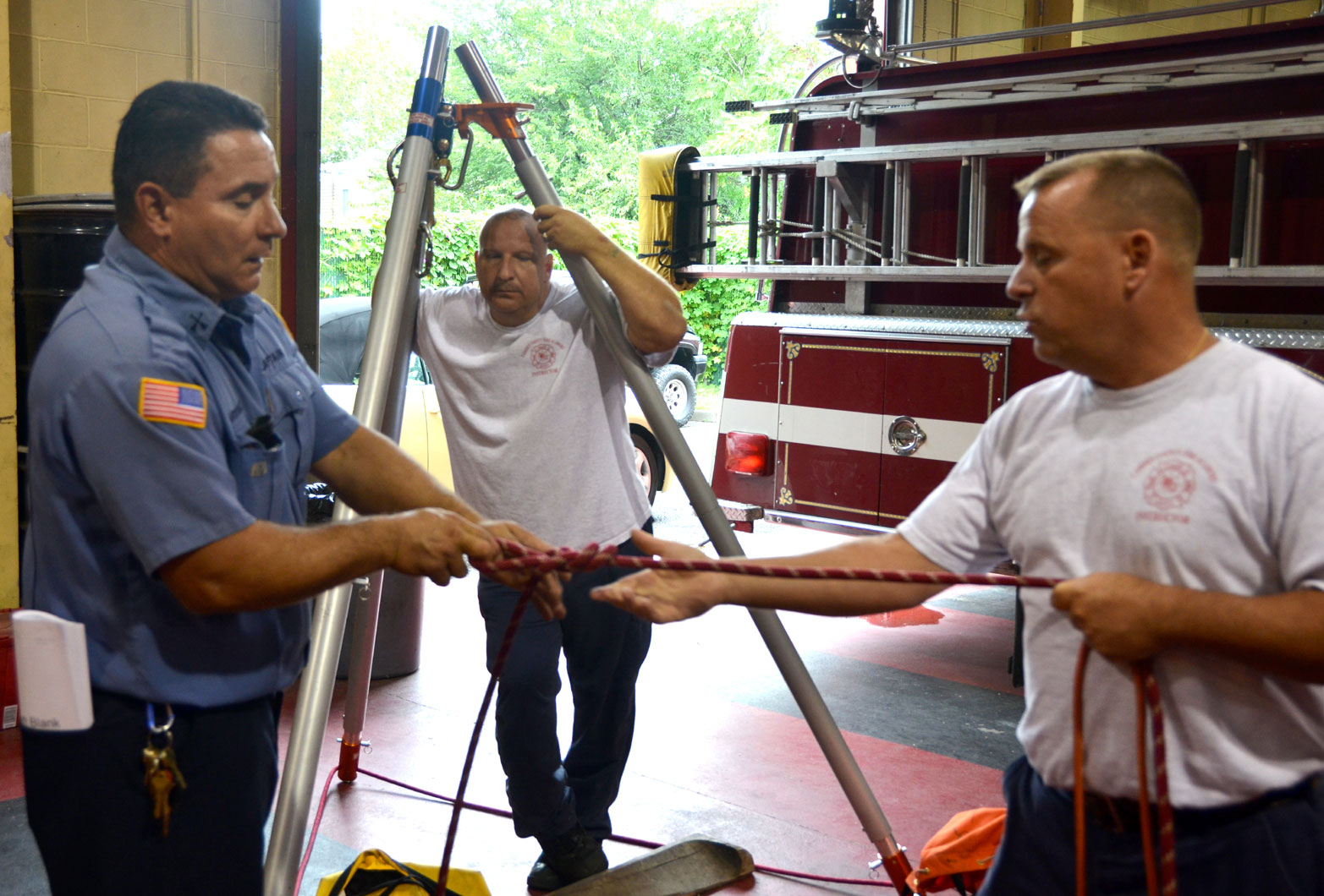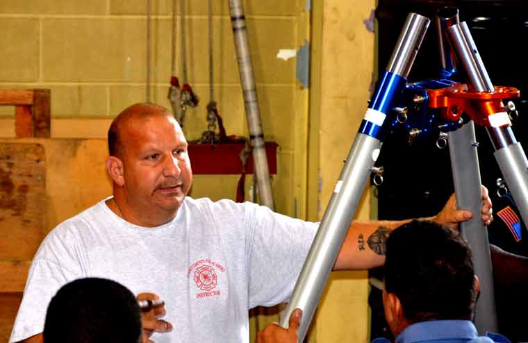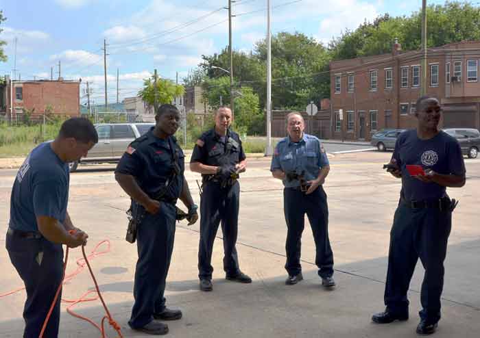 The continuous training that members of the Camden Fire Depart undergo for the most part goes unnoticed by the general public. Even when services are rendered as in the numerous call this summer to rescue drivers who drove their cars into high water, few if any give moment's thought to how the firefighters learned how to safely extricate them from their vehicles, and few give a moment's thought to the fact that the firefighter's oftentimes put themselves at risk to save the lives of others. As stated above, seven out of ten deaths involving rescue operations are suffered by those attempting the rescue, not the party who is the subject of the rescue. On September 8, 2011 I had the privilege to sit on on a training given at the Liberty Station firehouse, given to members of Squad Company 7, First Platoon concerning rescue operations in confined spaces. The instructors were Captains Frank Sandrock, David Dilks, and Herbert C. Leary. The members of Squad 7 being trained were Captain Manny Martinez and Firefighters, Lacy Phelps Jr., David Diaz, Kenneth White, Frank Thompson, and Gamalier Rivera. Firefighter Brian Beach, who was present that day, had already received the training. Later that evening, the members of Squad 7 put this training to use, extricating a motorist from his vehicle after he drove it into high water in South Camden. |