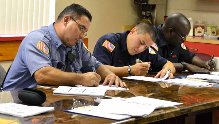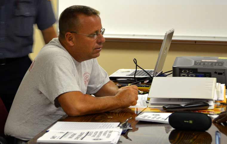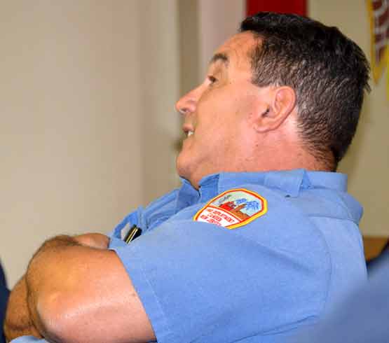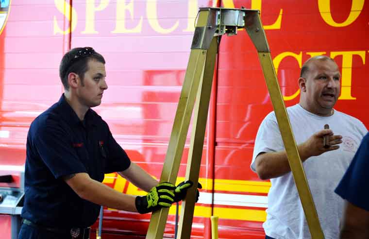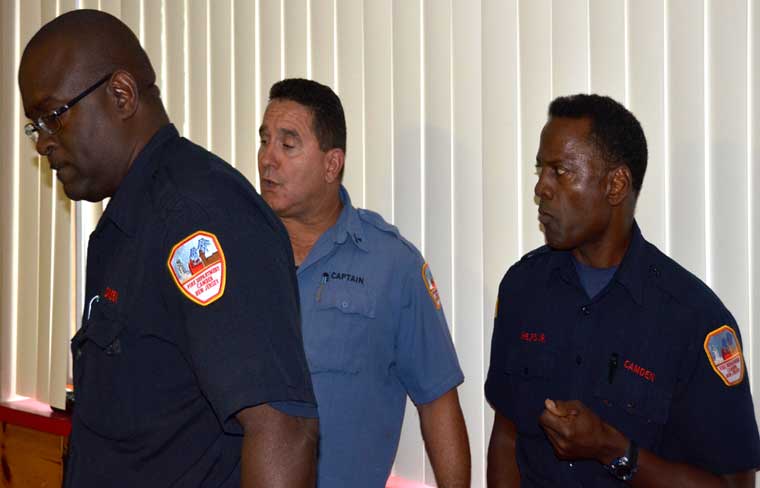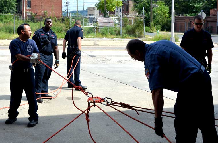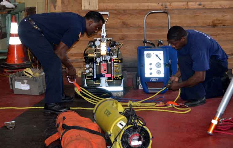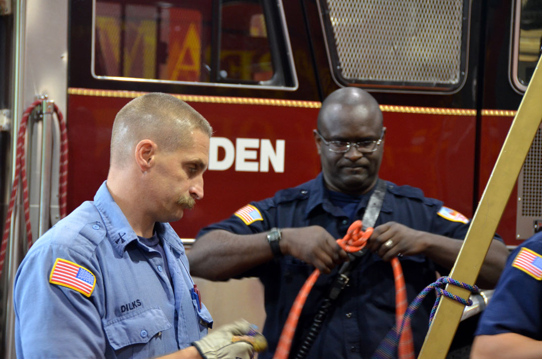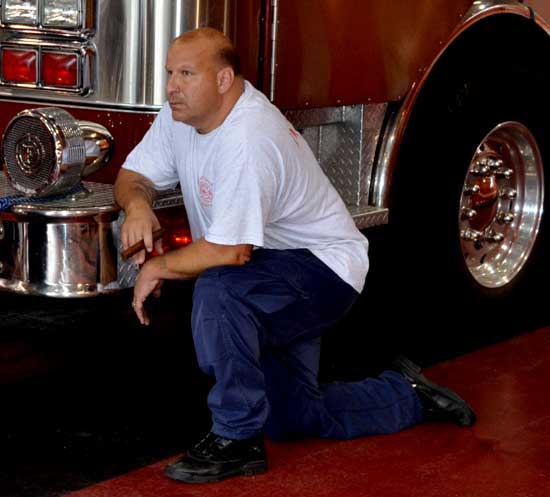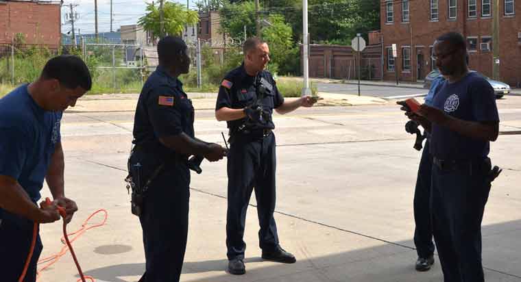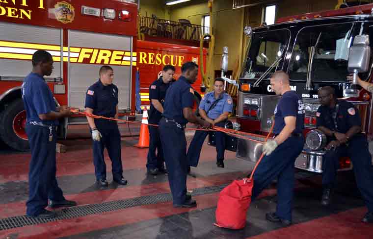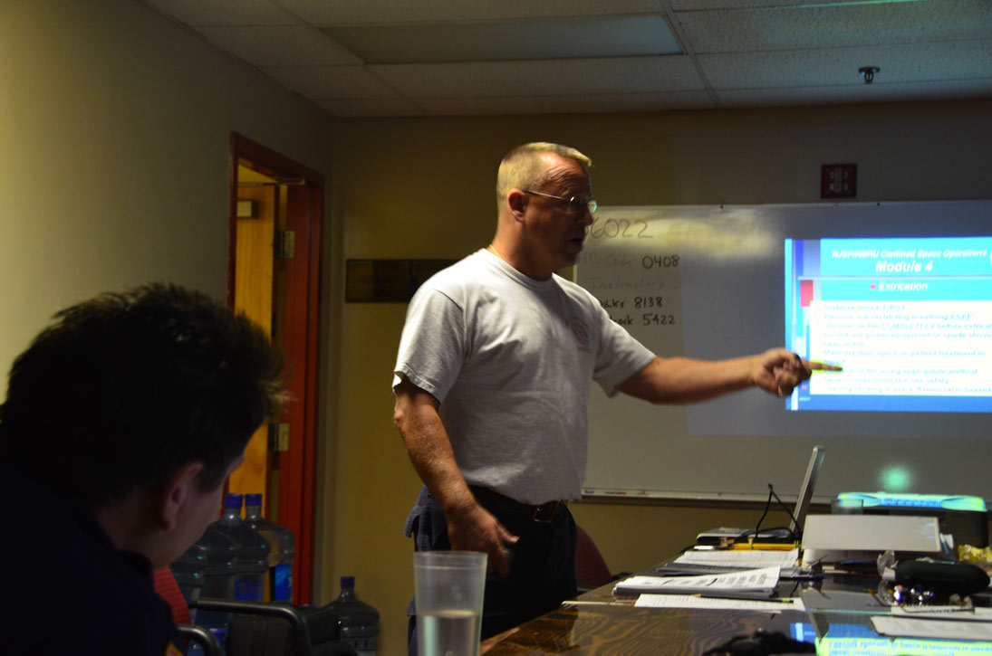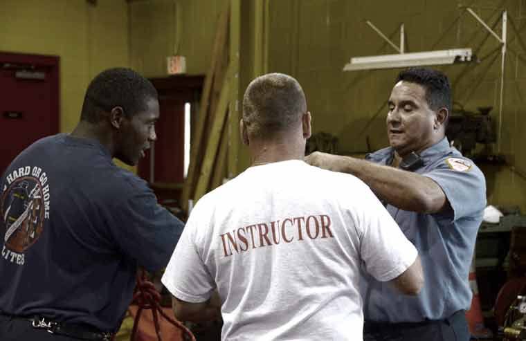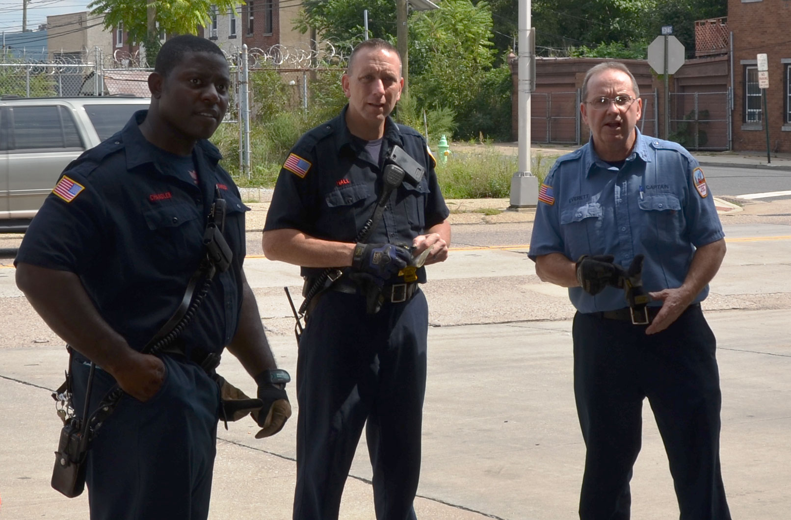 The continuous training that members of the Camden Fire Depart undergo for the most part goes unnoticed by the general public. Even when services are rendered as in the numerous call this summer to rescue drivers who drove their cars into high water, few if any give moment's thought to how the firefighters learned how to safely extricate them from their vehicles, and few give a moment's thought to the fact that the firefighter's oftentimes put themselves at risk to save the lives of others. As stated above, seven out of ten deaths involving rescue operations are suffered by those attempting the rescue, not the party who is the subject of the rescue. On September 8, 2011 I had the privilege to sit on on a training given at the Liberty Station firehouse, given to members of Squad Company 7, First Platoon concerning rescue operations in confined spaces. The instructors were Captains Frank Sandrock, David Dilks, and Herbert C. Leary. The members of Squad 7 being trained were Captain Manny Martinez and Firefighters, Lacy Phelps Jr., David Diaz, Kenneth White, Frank Thompson, and Gamalier Rivera. Firefighter Brian Beach, who was present that day, had already received the training. Later that evening, the members of Squad 7 put this training to use, extricating a motorist from his vehicle after he drove it into high water in South Camden. |