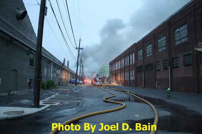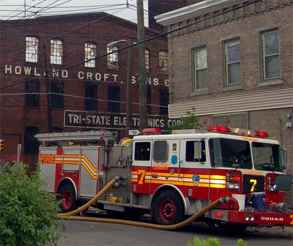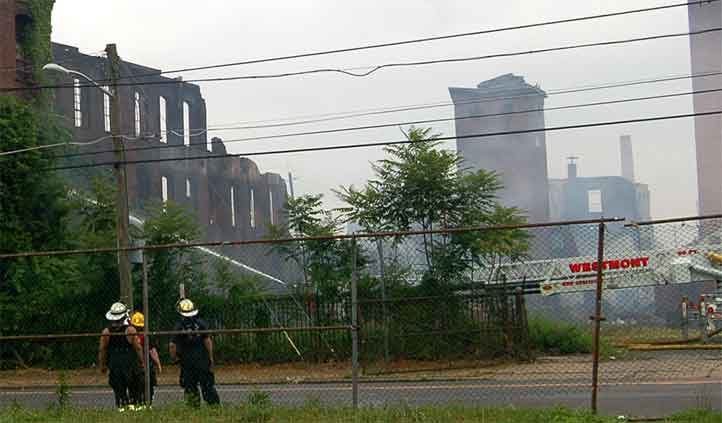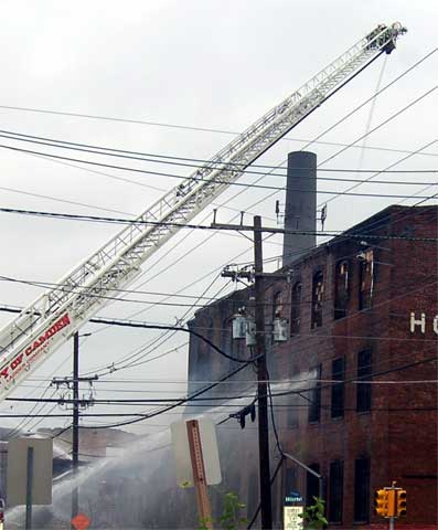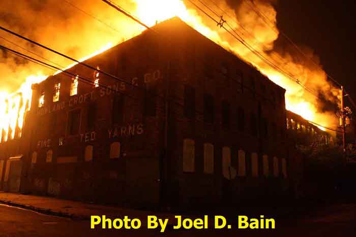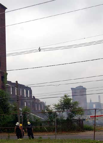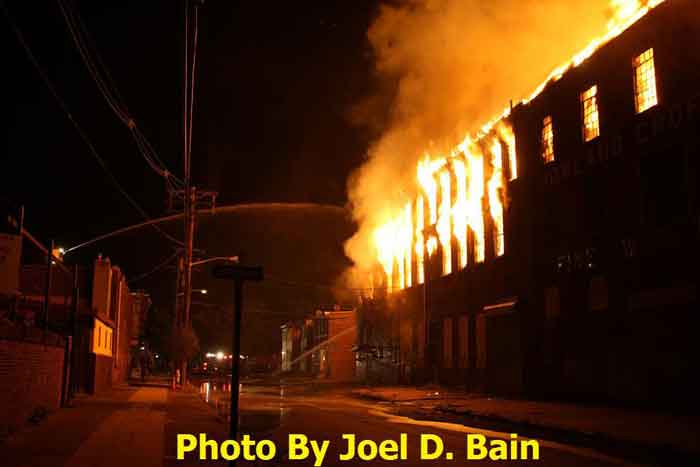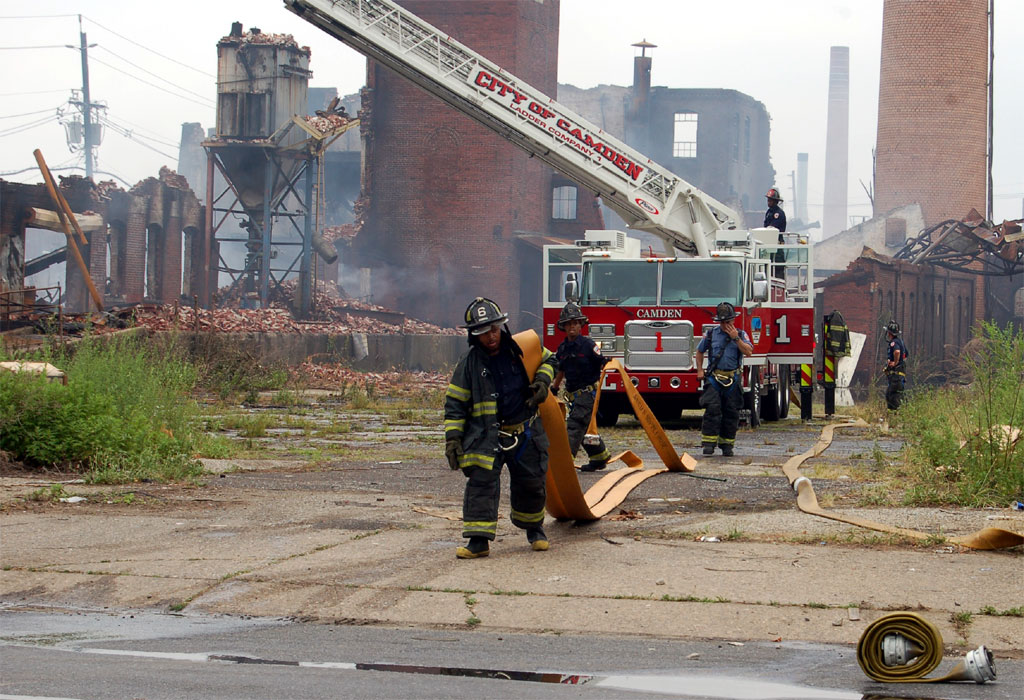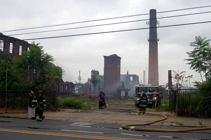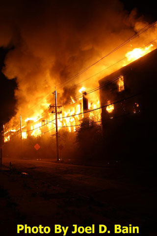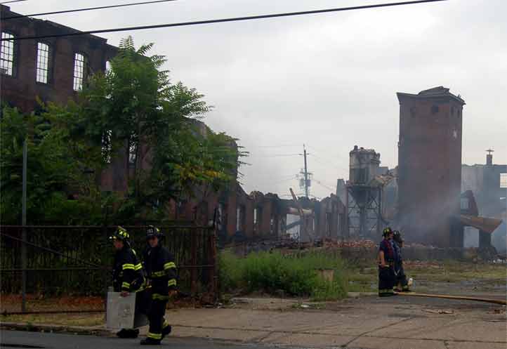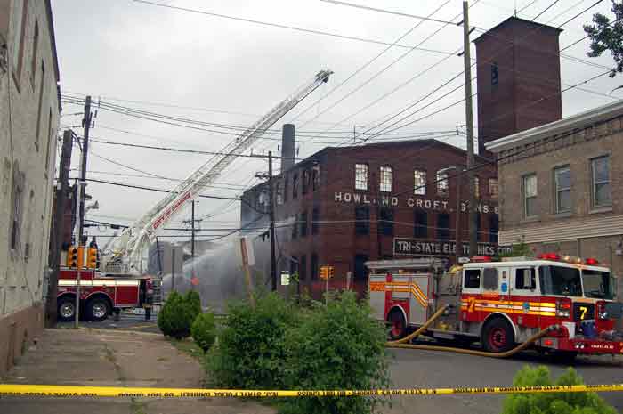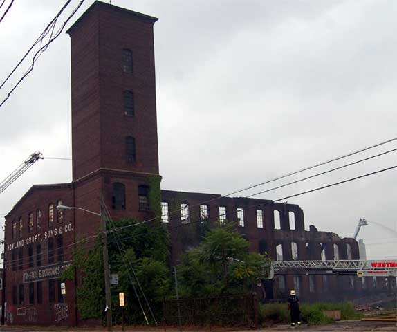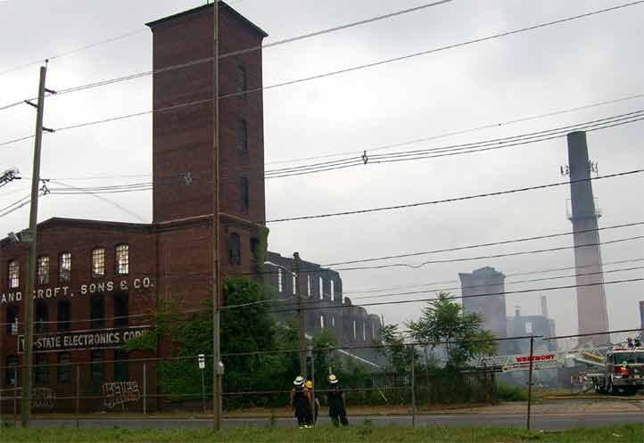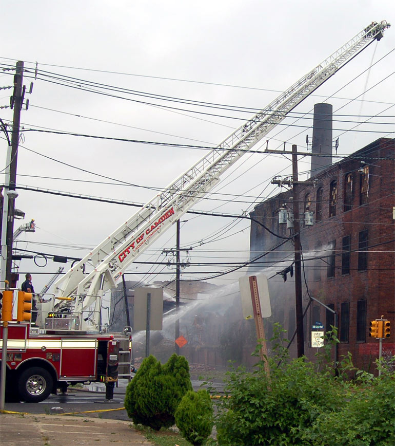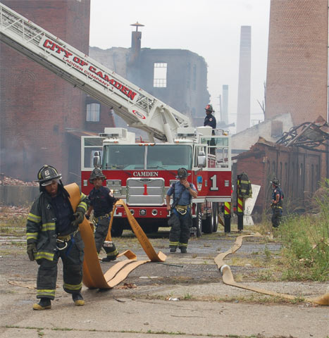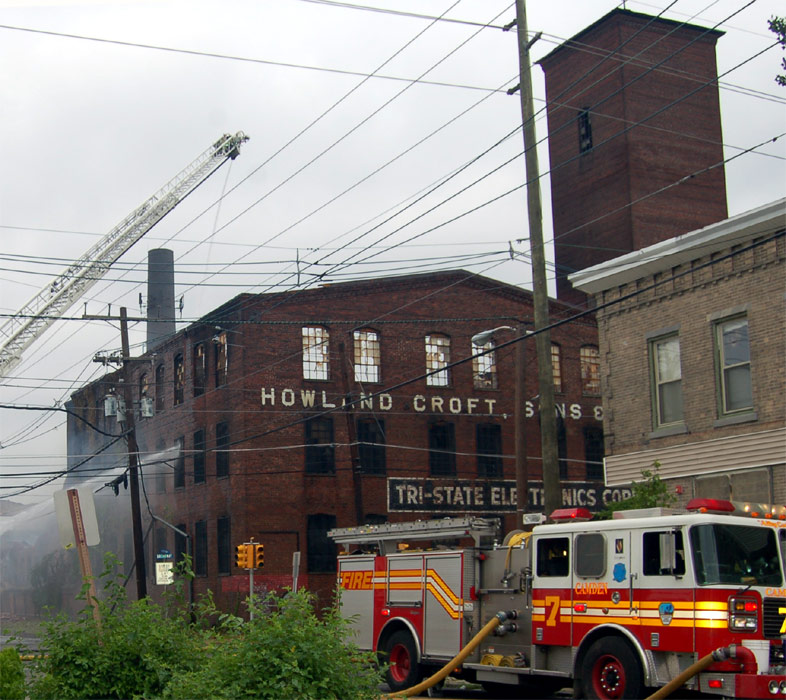 Inferno Ravages City by Lucas K. Murray & Joe Cooney CAMDEN — Just as the Camden Fire Department was catching its collective breath from a massive blaze Thursday, crews responded to a second inferno early Saturday morning. Fire Chief Michael Harper said the department was dispatched at 2:26 a.m. to the rear of the old Howland Croft, Sons & Co. building at 4th and Winslow streets. The fire grew to eight alarms before it was brought under control around 6 a.m. No injuries were reported. Retired Cherry Hill Fire Capt. Larry Colacicco was manning a rehab station on Broadway a couple blocks north of the fire scene around noon on Saturday. The former member of the Fire Marshal's Office said it was unusual to have two large fires so close together. "Two huge vacant building fires in three days seems a little weird to me," Colacicco said. "(If I were still working) I'd be in that building right now looking around for clues." "The three-story building that was at the corner of 4th and Winslow had a cattle chute that connected to another section," Harper reported. "When crews arrived it was localized back there, and they tried to cut it off." Harper explained that firefighters immediately began to attack the fire, but told him it was the "fastest-moving fire they'd ever seen." "When they looked up, the fire was already out to Broadway." The 130-year-old building that housed Croft's Linden Worsted Mills manufactured yarn and other textiles up until about 1950. A block long and a block wide, the L-shaped building is similar to the one that went up in flames Thursday about a mile away in the city's Gateway section. The 12-alarm fire at an abandoned tire warehouse required 59 other departments from three counties. Saturday's fire brought in 20 companies. Harper said the issues that faced firefighters Thursday—heat and broken fire hydrants—weren't significant Saturday. "This is the best place to have a fire," he explained. "We have plenty of water on Broadway, there's a large water main on 4th street in the back. But because we had to use so many aerial streams, we had to special call the Philadelphia Fire Department's fireboat." |