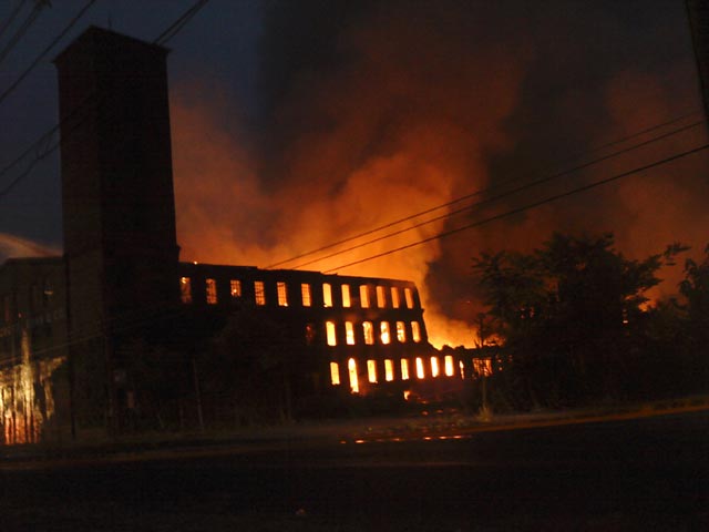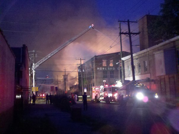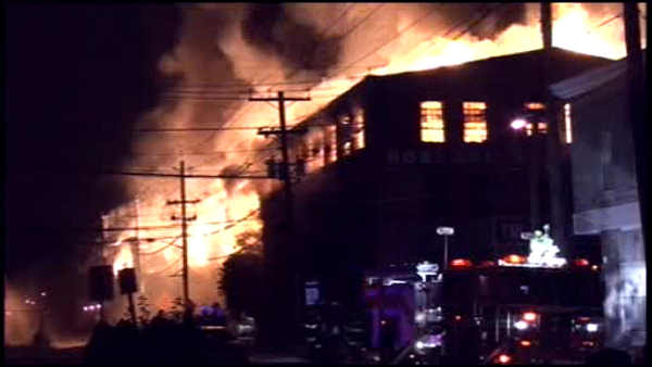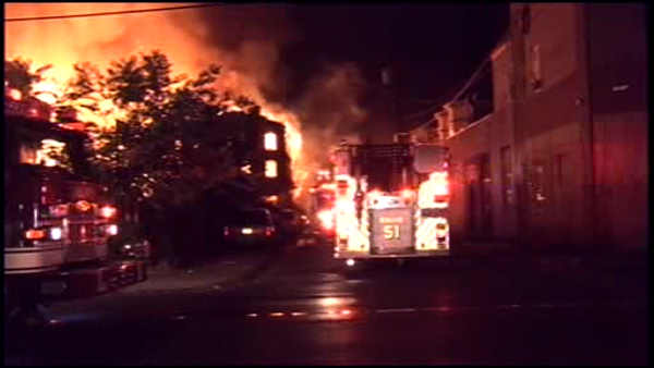 Massive Fire in Camden by Amy Buckman CAMDEN, NJ - June 11, 2011 (WPVI) -- Camden Fire officials are investigating the second multi-alarm fire in Camden in three days. The 8-alarm fire destroyed a warehouse in Camden, just a mile away from another devastating blaze. Officials are questioning the possibility of links between the two fires and the suspicious nature of both. Some of the same firefighters who fought Thursday's vacant warehouse fire in Camden were back on the front lines again Saturday morning fighting an 8-alarm blaze in the 400 block of Winslow Court. "It is pretty unusual for us to have fires of this magnitude within a couple of days of each other," said Chief Michael Harper. The fire broke out shortly after 2:00am in the Howland Croft building, a 132-year-old former textile factory that was being used to store computer components and building supplies. Those items and the structure's timber beam construction made the blaze fierce and spectacular, igniting metal street signs and power lines. Firefighters found flames shooting from a 4 story vacant building, that occupies an entire city block. The fire spread very quickly and firefighters struck additional alarms. Fire crews drafted water from the Delaware River to assist firefighters at the scene. Camden City Firefighters also called in a fireboat from the Philadelphia Fire Department to assist in fighting the fire. Around 3:25am, the fire went to a 5th and 6th and 8th alarm bringing numerous fire companies from Camden and Gloucester county to the scene. Several nearby homes were evacuated and power was shut off to the neighborhood. Though firefighters did manage to contain the fire to the warehouse and bring it under control before 6:00am, it was an anxious morning for residents. "Somebody was banging on the door, and when my grandma opened the door there were flames, and she couldn't see, she couldn't breathe. We just grabbed my daughter and my grandma and got out through the alley," explained Des Torres. "I came out of the store and it was just a little window on fire. Next thing we know, the whole side of the building lit up. It just started really fast. The poles across the street caught on fire near the houses. It was terrible," said Theresa Alicea. With the morning fire coming so close on the heels of the fire earlier in the week in Camden, many people are wondering out loud whether there is an arsonist on the loose. "This is ridiculous back to back," said Michalae Dios. "It's not making any sense. I don't even know for sure if I have a home right now." "It is a concern of our too," said Chief Harper. "Our fire marshal is going to do an investigation on it in coordination with the county fire marshal's office, the Camden Police Department, and they are going to try and get to the bottom of it." The Red Cross will be helping residents who have been displaced by the fire. Firefighters were able to bring the fire under control shortly before 6 this morning.