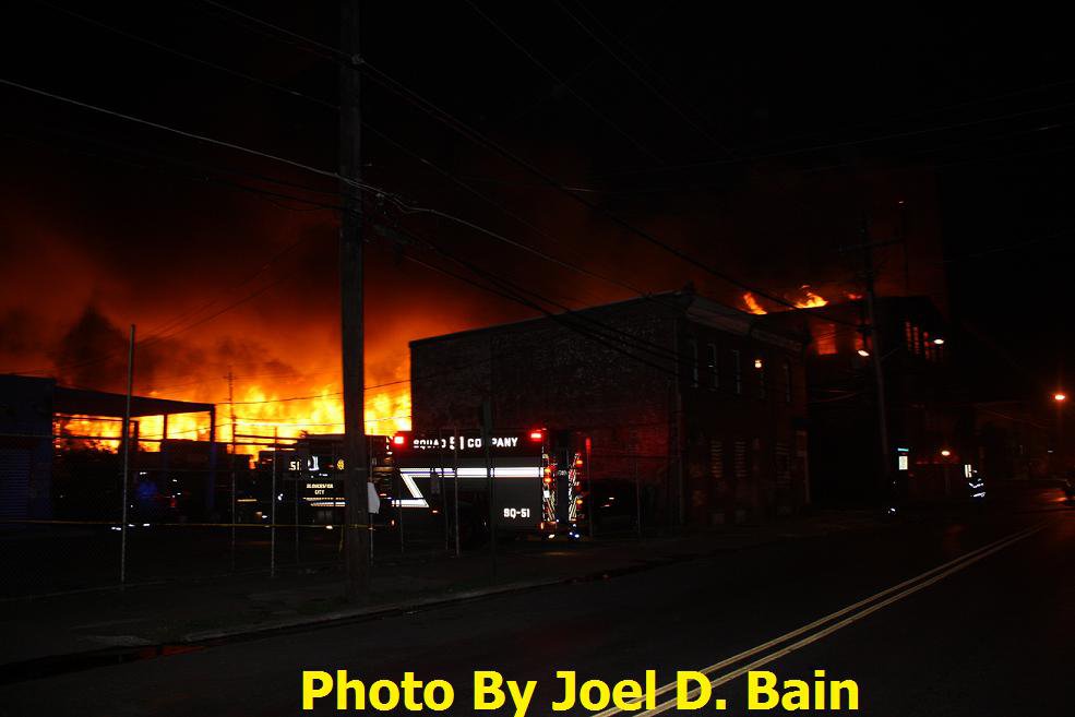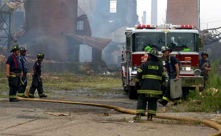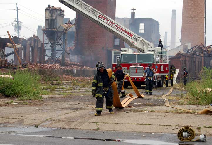 — An eight-alarm fire engulfed a three-story warehouse in Camden overnight. The blaze at an abandoned factory on Winslow Street near Broadway in South Camden broke out shortly before 2:30 a.m. and raged out of control for three hours. It was the second major fire in the city in two days. On Thursday, a 12-alarm inferno leveled an abandoned tire business and most of the two surrounding city blocks. Read Sunday's Courier-Post for more details on both blazes. |