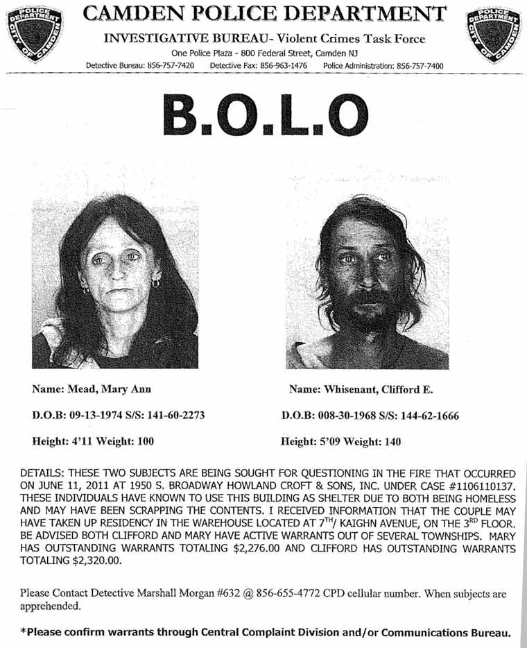 Late in August of 2011, the Camden Police Department put out a "Be On The Look Out" for two fugitives who had been squatting in vacant buildings in South Camden for several months in connection with the Howland Croft fire.. The sad part is that both of these persons were wanted and had outstanding warrants for their arrest prior to the Howland Croft fire, and by rights should have been picked up and incarcerated long before the fire was set. Once again, expediency and the unwillingness to deal with the criminal population, using the excuse "the homeless are the victims" resulted in innocent and law-abiding families being forced from their homes. A government that willingly refuses to protect its citizens has become a de facto accomplice in crimes against them. |
