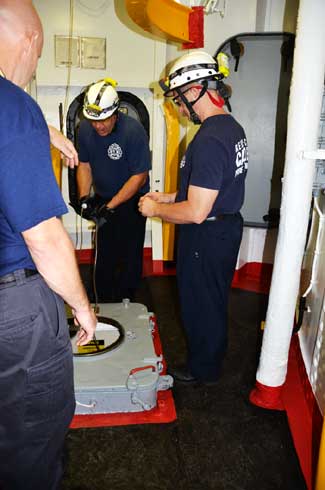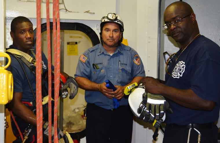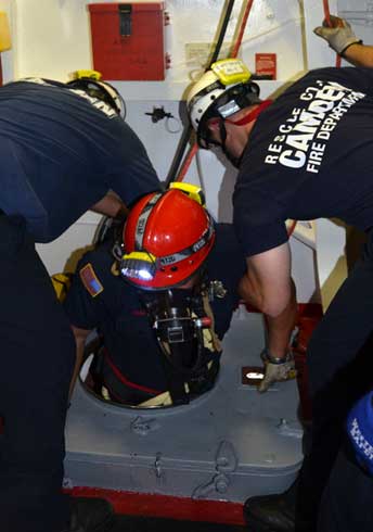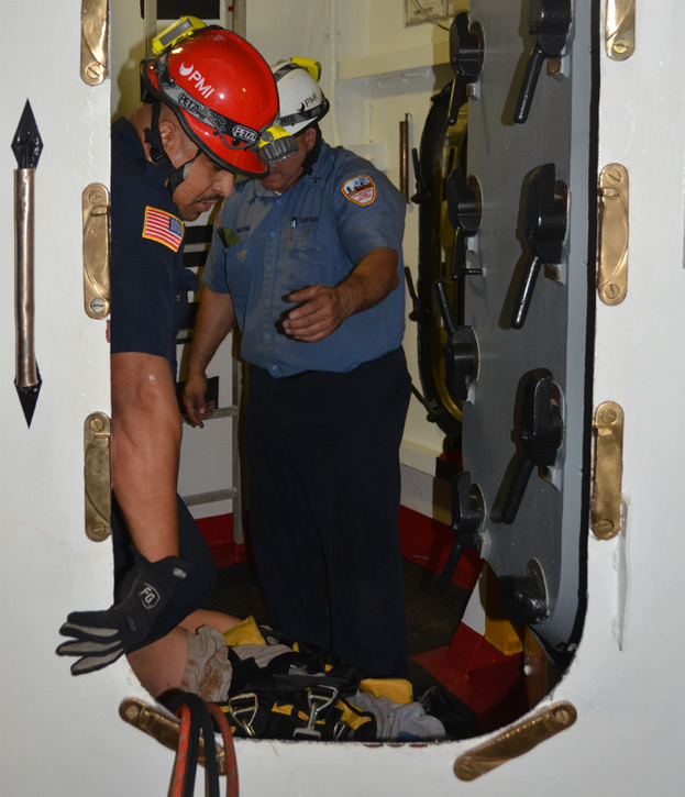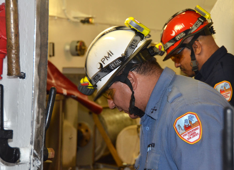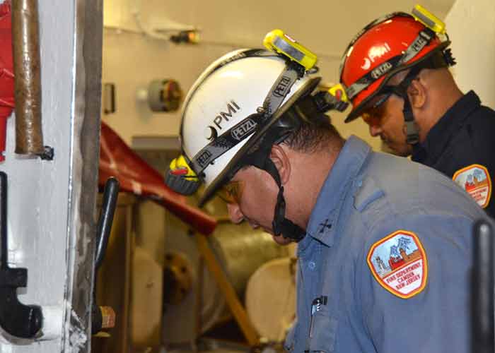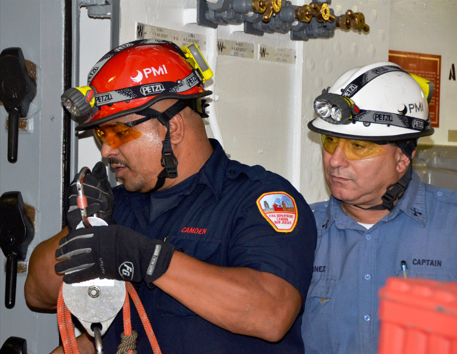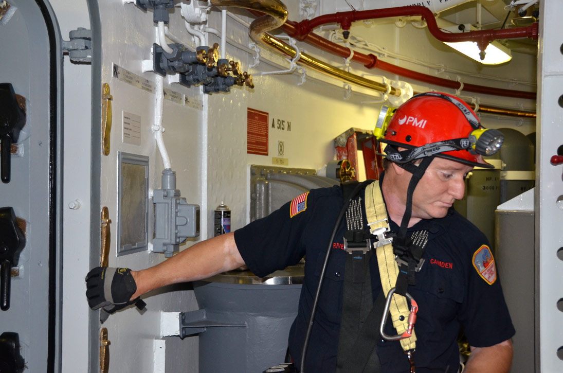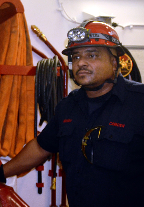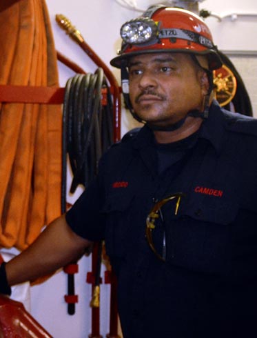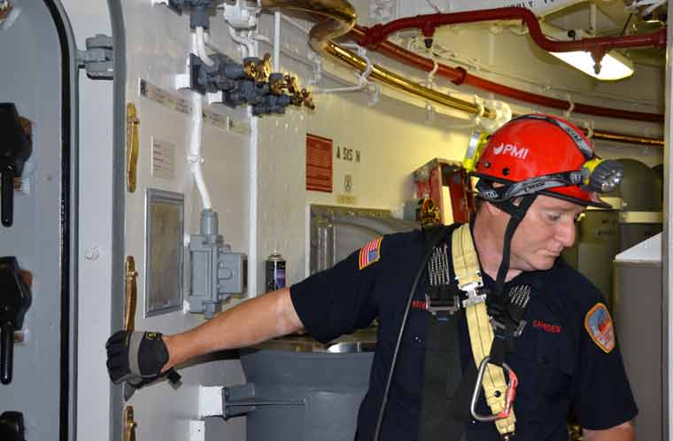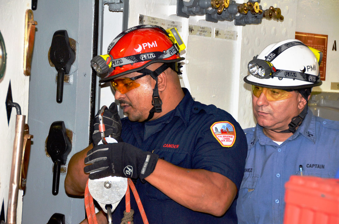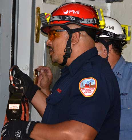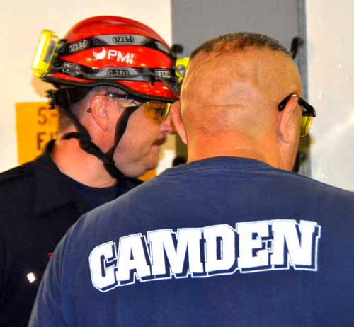 Each and every time the call comes to the Camden Fire Department, it's men and women face what may be potentially life-threatening circumstances. Standards and practices to ensure the safety of the public and first responders have been developed over the past 160-odd years, and while many at City Hall and elsewhere in State and County government may believe corners can be cut, far too many examples.. fatalities and injuries… have proven that is a falsehood. Firefighting and rescue is a dangerous business… roughly 70% of all deaths occurring in rescue operations are those of rescuers, not of rescuees. As part of ongoing training, Camden Fire Department personnel were given training in confined space rescue operations over the course of several days in September of 2011, first at Liberty Station on Broadway, followed by sessions on the battleship USS New Jersey BB-62, which is docked along the Camden waterfront. I was privileged to be allowed to monitor both parts of the course given. On September 12 I accompanied Battalion Chief Donald Johnson and Captains Frank Sandrock and David Dilks, who were conducting the class, aboard the USS New Jersey. Two groups of Camden firefighters took the training. The morning group consisted of Firefighters Brian Beach, David Diaz, Orland Nunez, and Lacy Phelps. The afternoon session attended by Captain Manny Martinez and Firefighters Efi Mercado, Gamalier Rivera, Frank Thompson, and Ken White. I have captioned some of the photos and attempted to describe what was occurring, and may well have either got it wrong or used improper terminology. If any interested party would like to assist, please comment at the bottom of the page. September 14, 2011 |