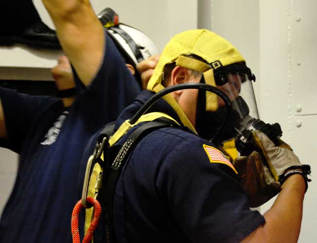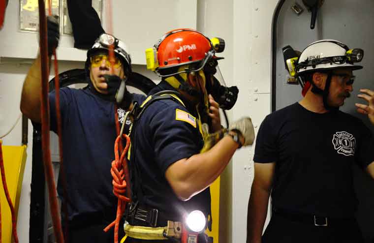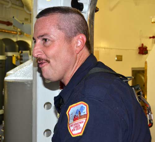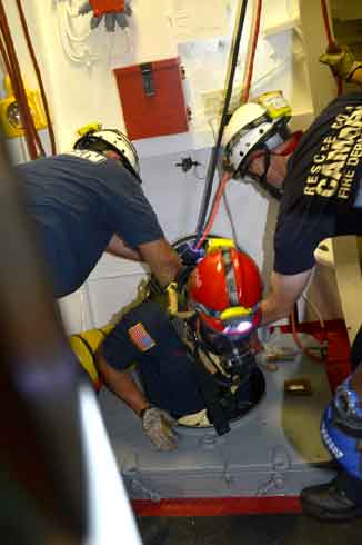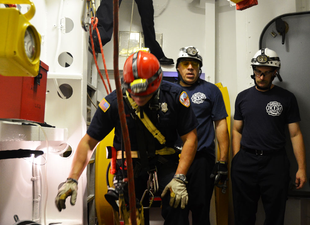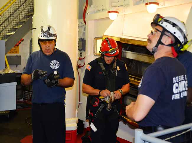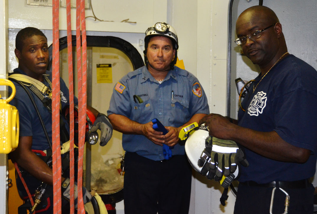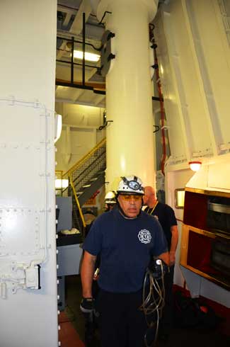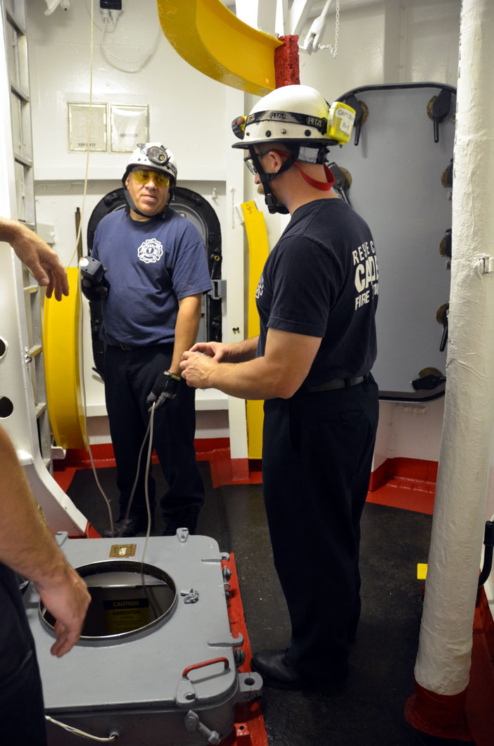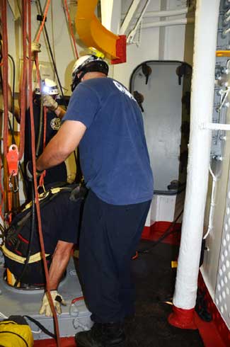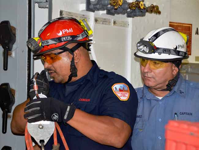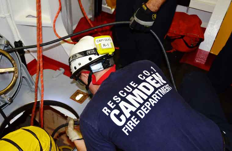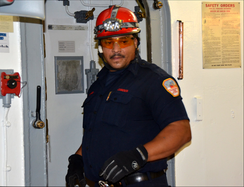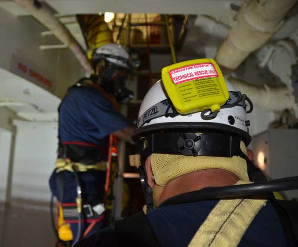 Each and every time the call comes to the Camden Fire Department, it's men and women face what may be potentially life-threatening circumstances. Standards and practices to ensure the safety of the public and first responders have been developed over the past 160-odd years, and while many at City Hall and elsewhere in State and County government may believe corners can be cut, far too many examples.. fatalities and injuries… have proven that is a falsehood. Firefighting and rescue is a dangerous business… roughly 70% of all deaths occurring in rescue operations are those of rescuers, not of rescuees. As part of ongoing training, Camden Fire Department personnel were given training in confined space rescue operations over the course of several days in September of 2011, first at Liberty Station on Broadway, followed by sessions on the battleship USS New Jersey BB-62, which is docked along the Camden waterfront. I was privileged to be allowed to monitor both parts of the course given. On September 12 I accompanied Battalion Chief Donald Johnson and Captains Frank Sandrock and David Dilks, who were conducting the class, aboard the USS New Jersey. Two groups of Camden firefighters took the training. The morning group consisted of Firefighters Brian Beach, David Diaz, Orland Nunez, and Lacy Phelps. The afternoon session attended by Captain Manny Martinez and Firefighters Efi Mercado, Gamalier Rivera, Frank Thompson, and Ken White. I have captioned some of the photos and attempted to describe what was occurring, and may well have either got it wrong or used improper terminology. If any interested party would like to assist, please comment at the bottom of the page. September 14, 2011 |