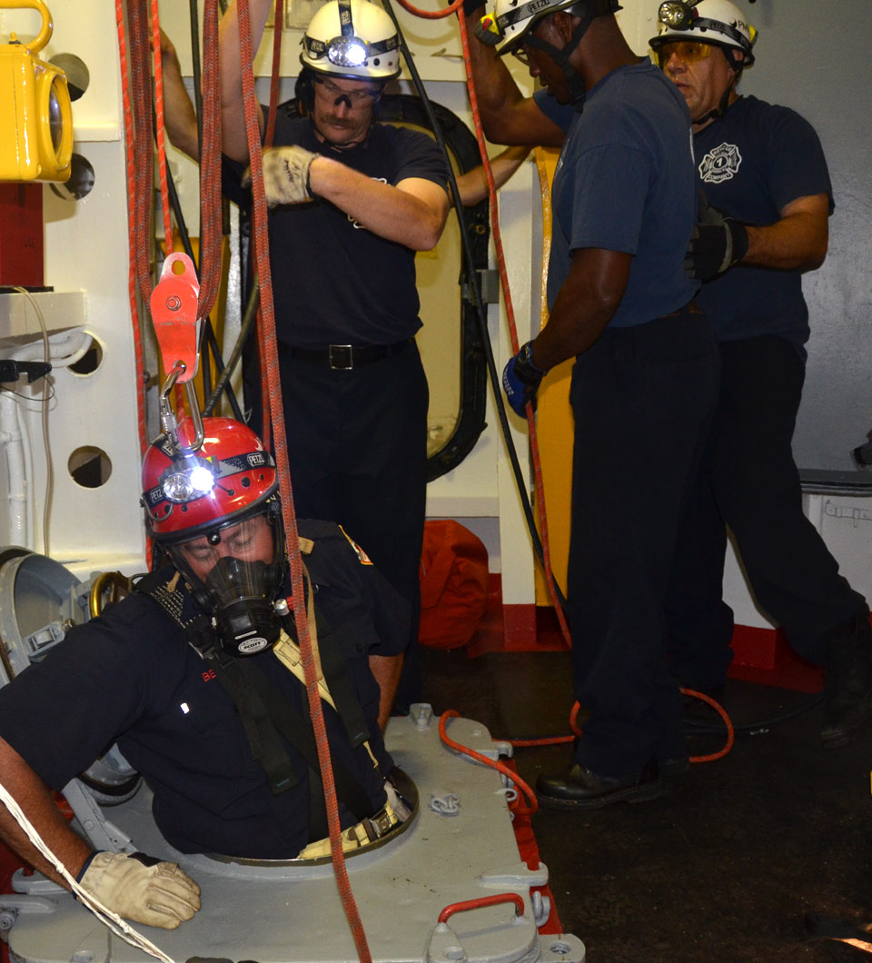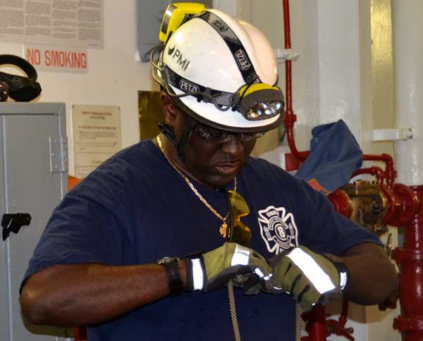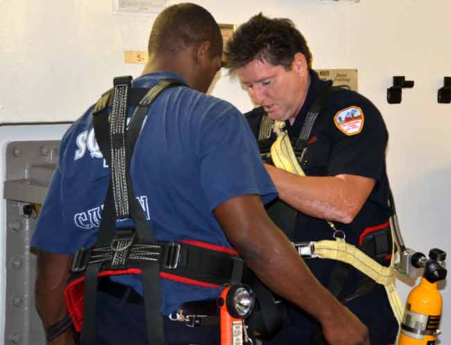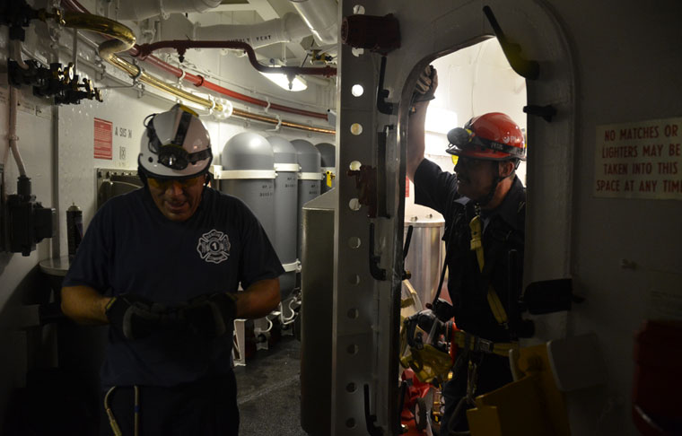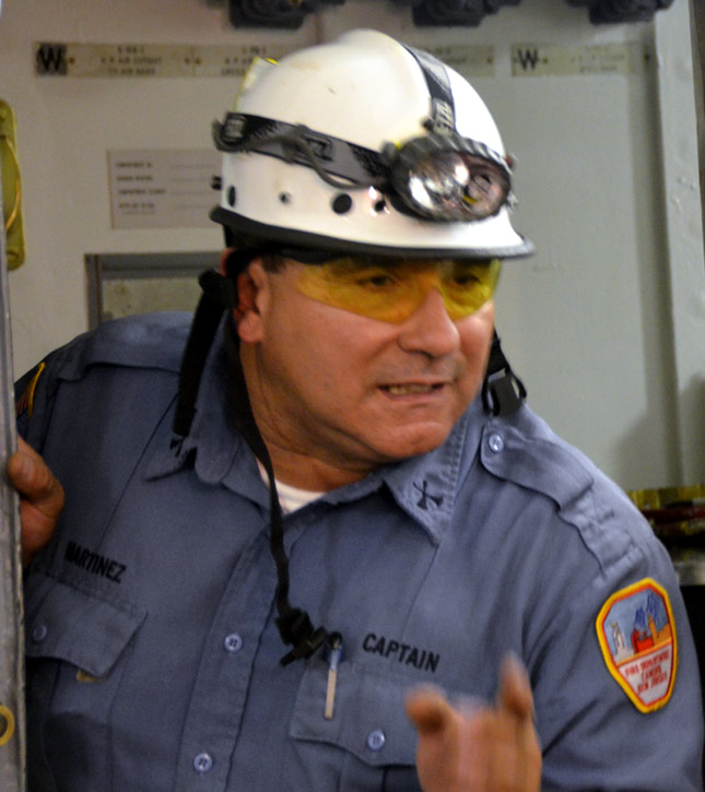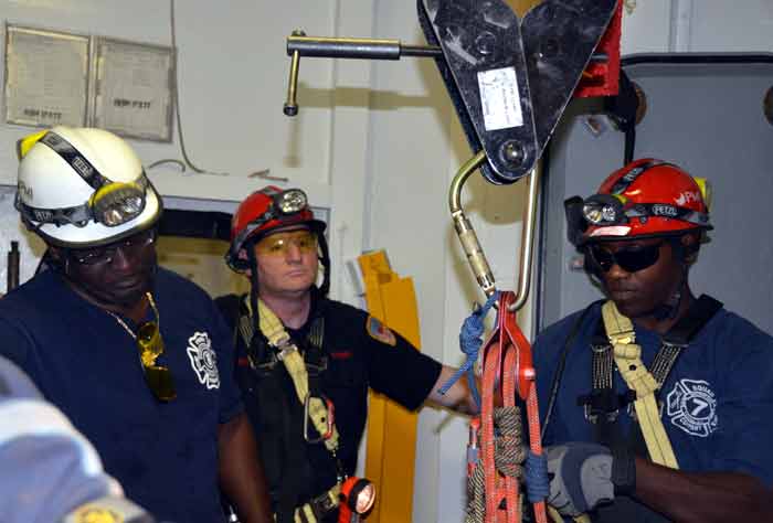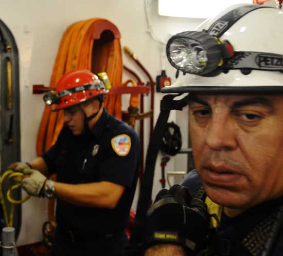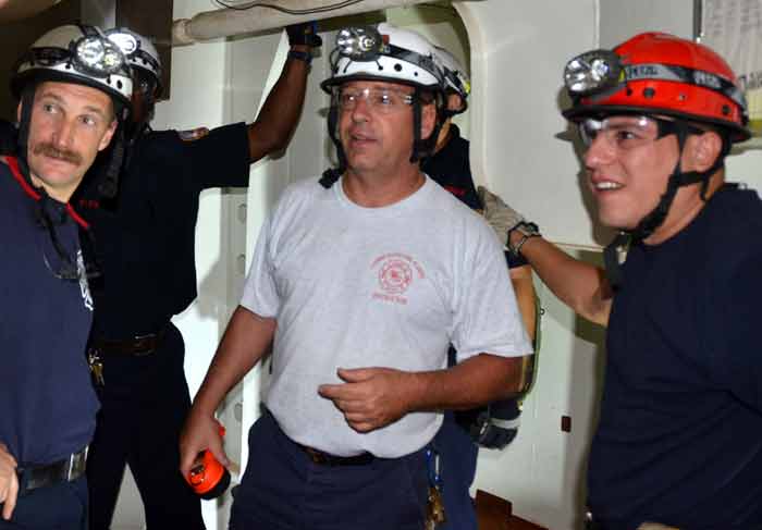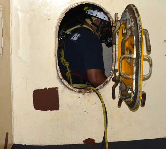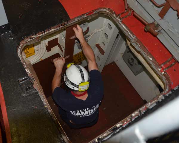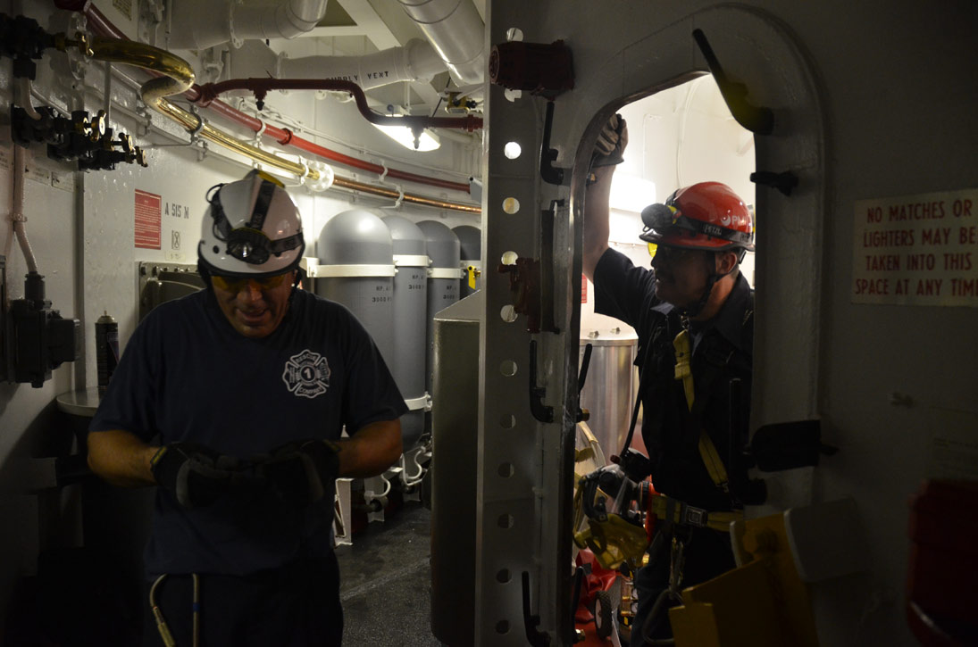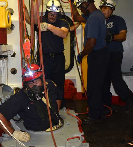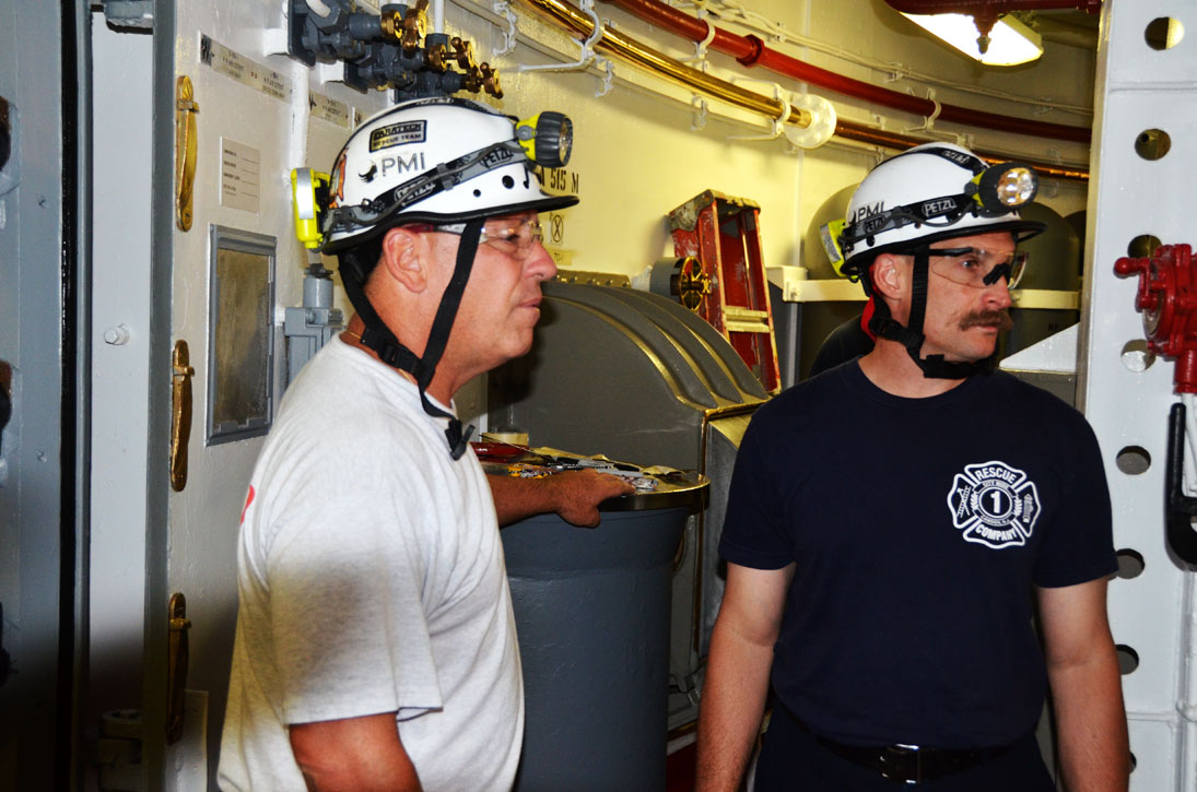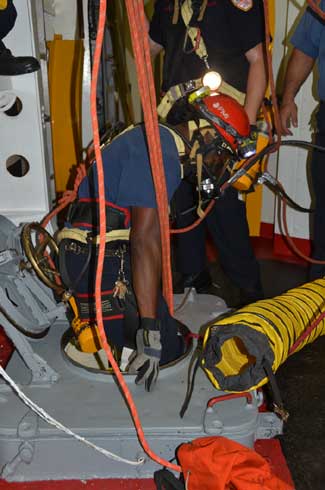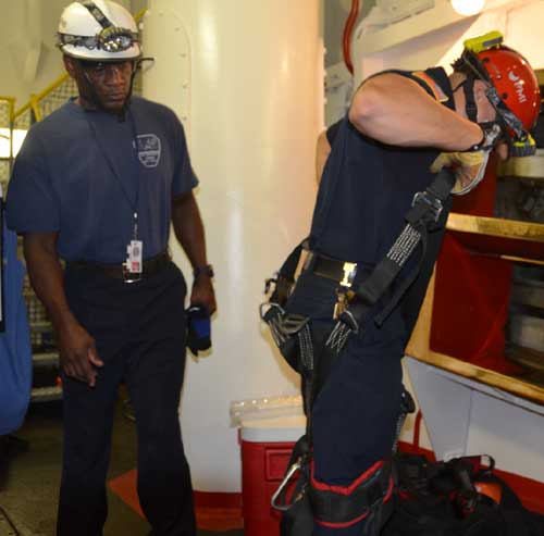 Each and every time the call comes to the Camden Fire Department, it's men and women face what may be potentially life-threatening circumstances. Standards and practices to ensure the safety of the public and first responders have been developed over the past 160-odd years, and while many at City Hall and elsewhere in State and County government may believe corners can be cut, far too many examples.. fatalities and injuries… have proven that is a falsehood. Firefighting and rescue is a dangerous business… roughly 70% of all deaths occurring in rescue operations are those of rescuers, not of rescuees. As part of ongoing training, Camden Fire Department personnel were given training in confined space rescue operations over the course of several days in September of 2011, first at Liberty Station on Broadway, followed by sessions on the battleship USS New Jersey BB-62, which is docked along the Camden waterfront. I was privileged to be allowed to monitor both parts of the course given. On September 12 I accompanied Battalion Chief Donald Johnson and Captains Frank Sandrock and David Dilks, who were conducting the class, aboard the USS New Jersey. Two groups of Camden firefighters took the training. The morning group consisted of Firefighters Brian Beach, David Diaz, Orland Nunez, and Lacy Phelps. The afternoon session attended by Captain Manny Martinez and Firefighters Efi Mercado, Gamalier Rivera, Frank Thompson, and Ken White. I have captioned some of the photos and attempted to describe what was occurring, and may well have either got it wrong or used improper terminology. If any interested party would like to assist, please comment at the bottom of the page. September 14, 2011 |