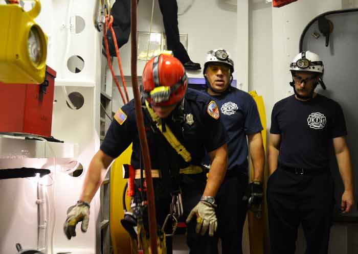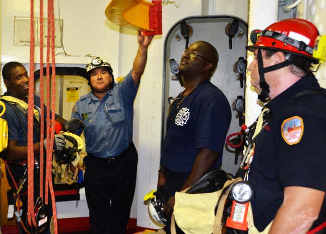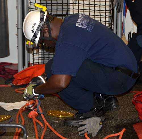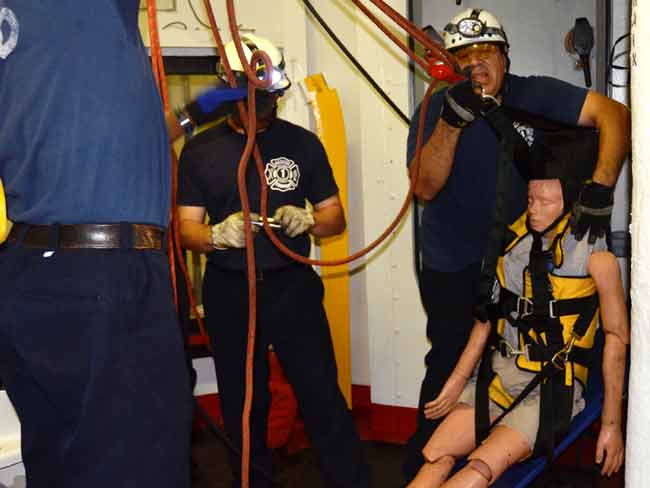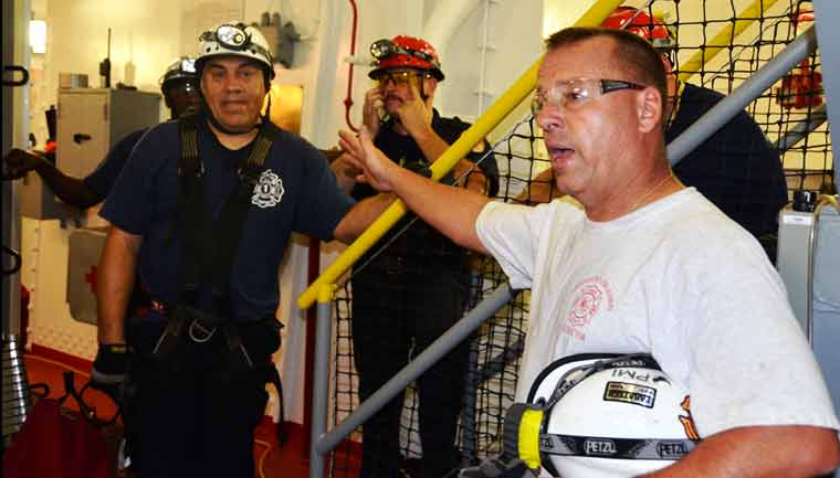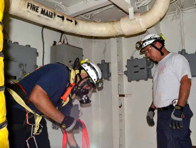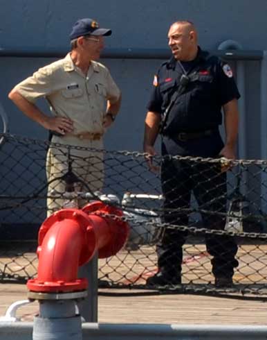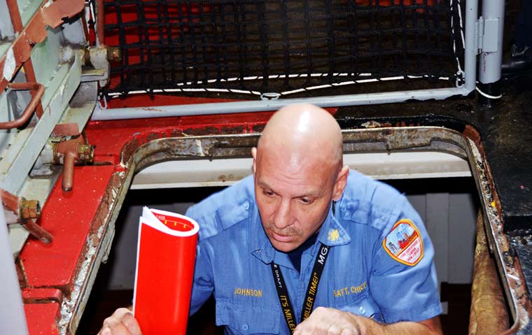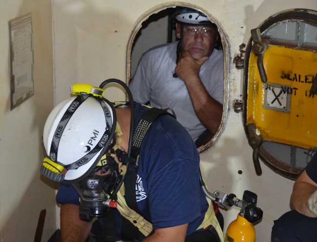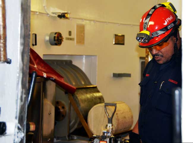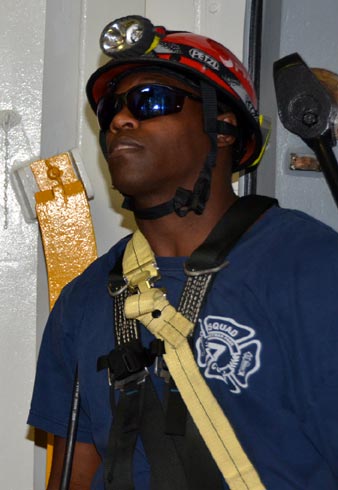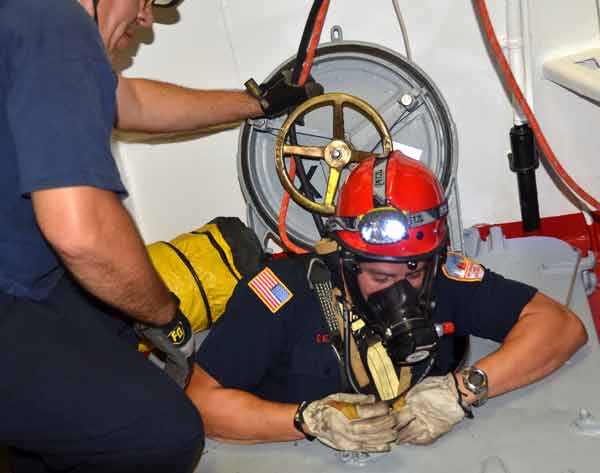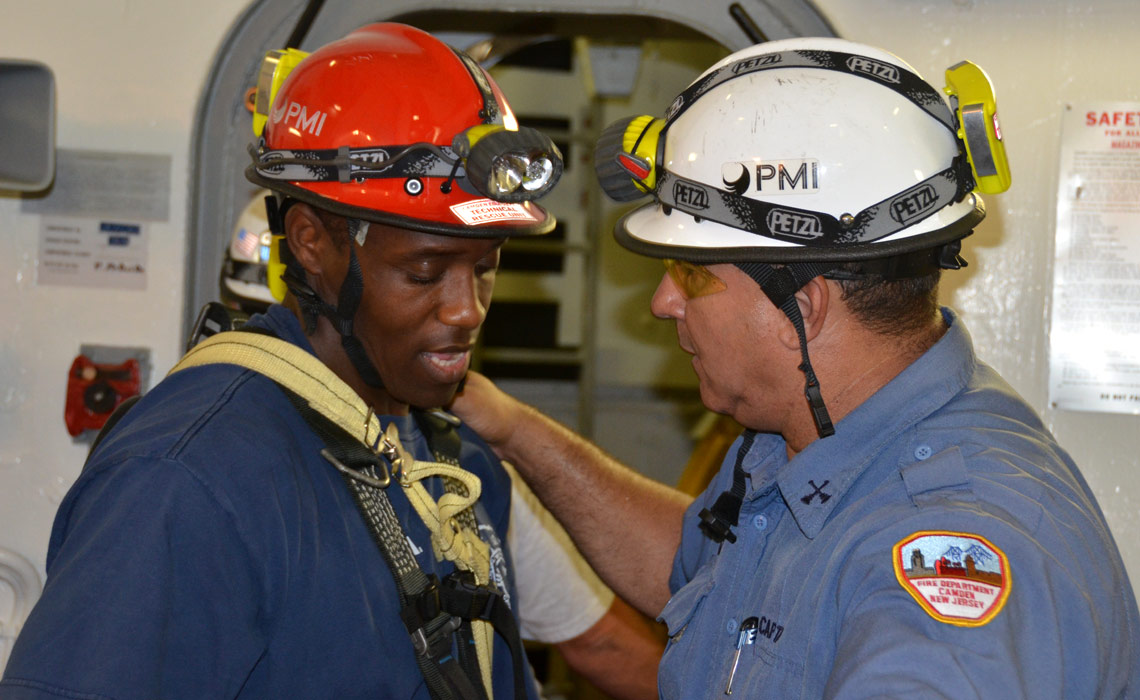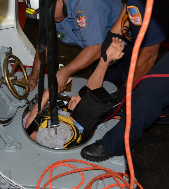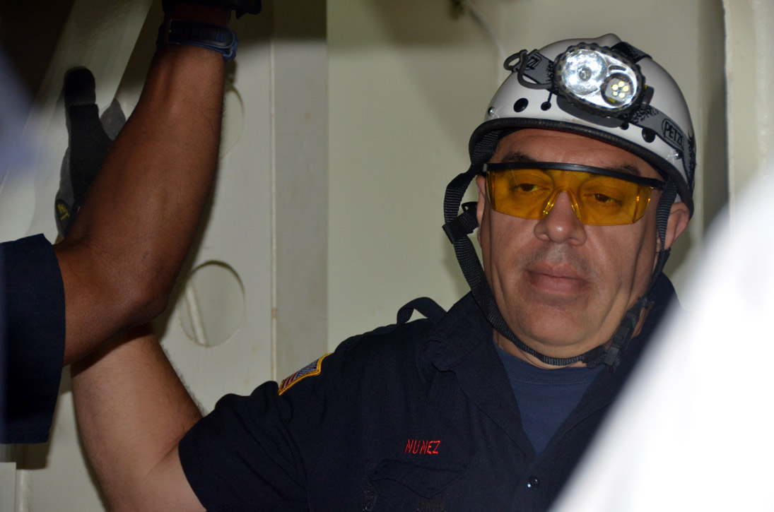 Each and every time the call comes to the Camden Fire Department, it's men and women face what may be potentially life-threatening circumstances. Standards and practices to ensure the safety of the public and first responders have been developed over the past 160-odd years, and while many at City Hall and elsewhere in State and County government may believe corners can be cut, far too many examples.. fatalities and injuries… have proven that is a falsehood. Firefighting and rescue is a dangerous business… roughly 70% of all deaths occurring in rescue operations are those of rescuers, not of rescuees. As part of ongoing training, Camden Fire Department personnel were given training in confined space rescue operations over the course of several days in September of 2011, first at Liberty Station on Broadway, followed by sessions on the battleship USS New Jersey BB-62, which is docked along the Camden waterfront. I was privileged to be allowed to monitor both parts of the course given. On September 12 I accompanied Battalion Chief Donald Johnson and Captains Frank Sandrock and David Dilks, who were conducting the class, aboard the USS New Jersey. Two groups of Camden firefighters took the training. The morning group consisted of Firefighters Brian Beach, David Diaz, Orland Nunez, and Lacy Phelps. The afternoon session attended by Captain Manny Martinez and Firefighters Efi Mercado, Gamalier Rivera, Frank Thompson, and Ken White. I have captioned some of the photos and attempted to describe what was occurring, and may well have either got it wrong or used improper terminology. If any interested party would like to assist, please comment at the bottom of the page. September 14, 2011 |