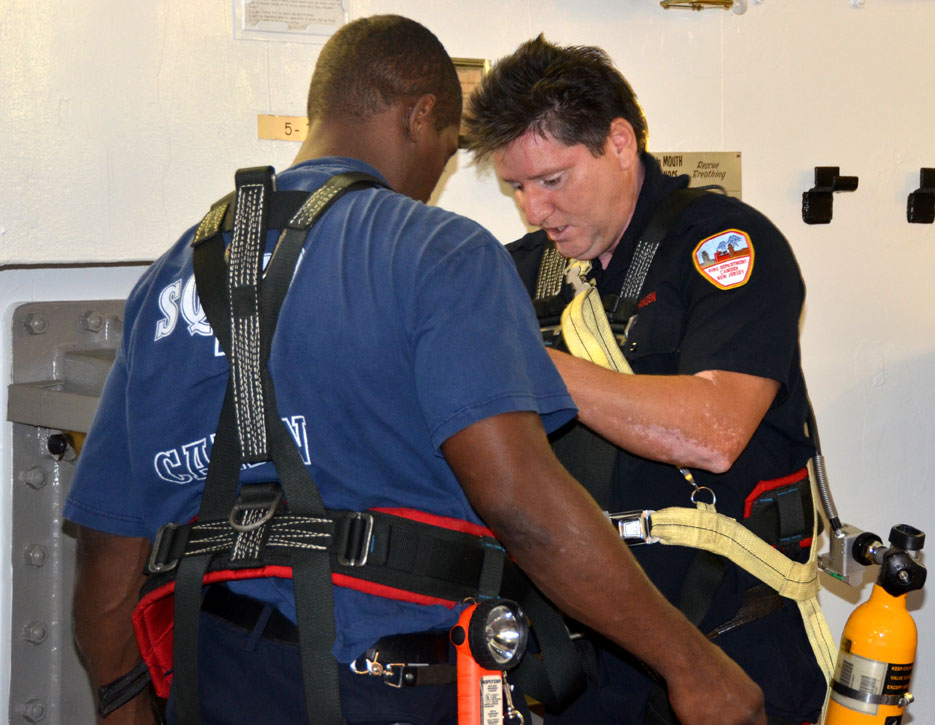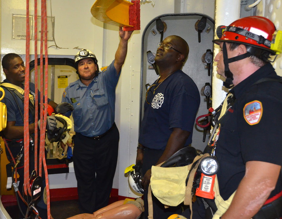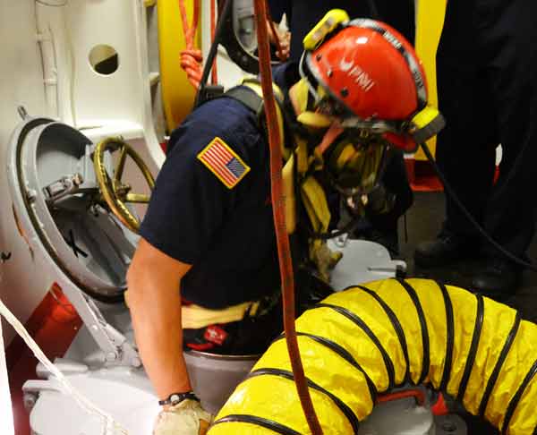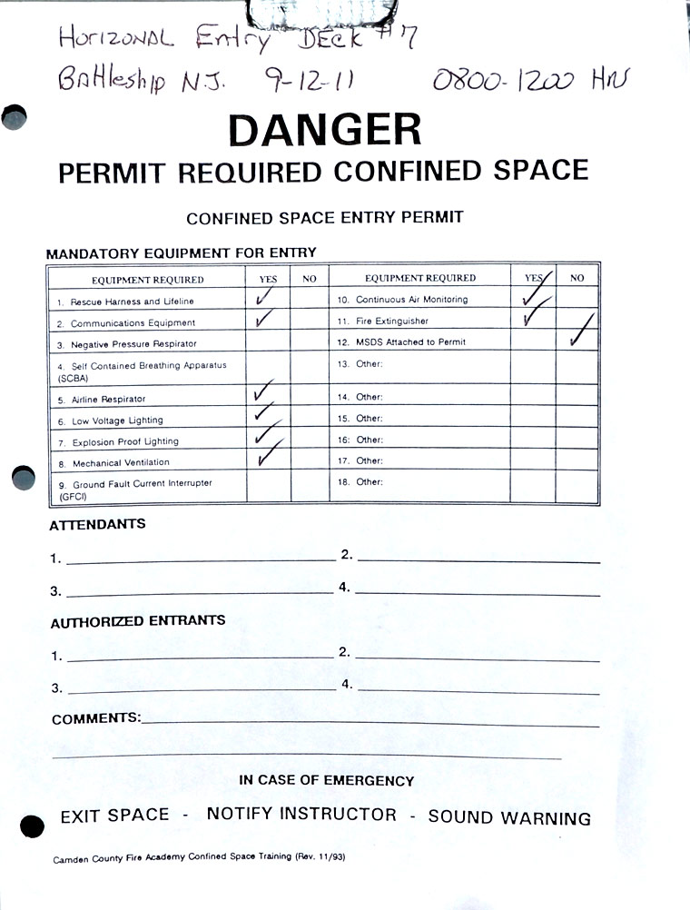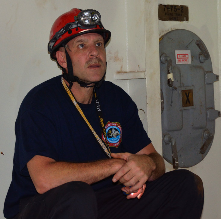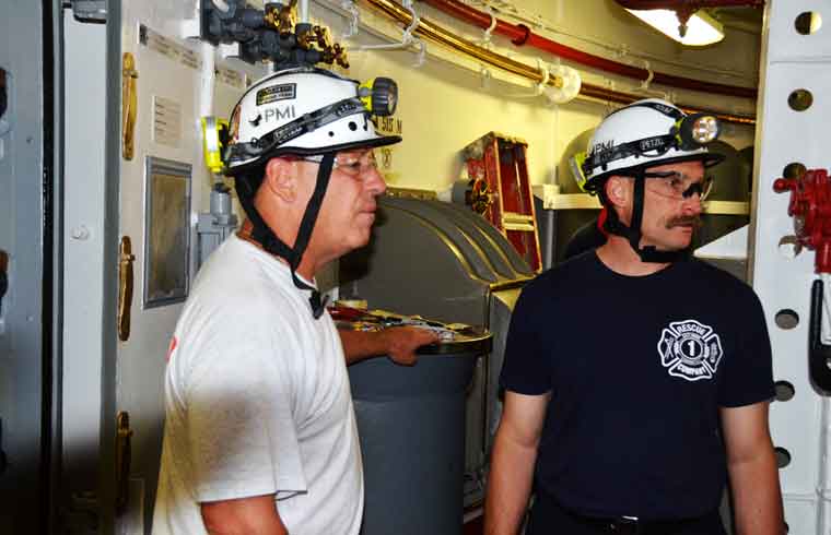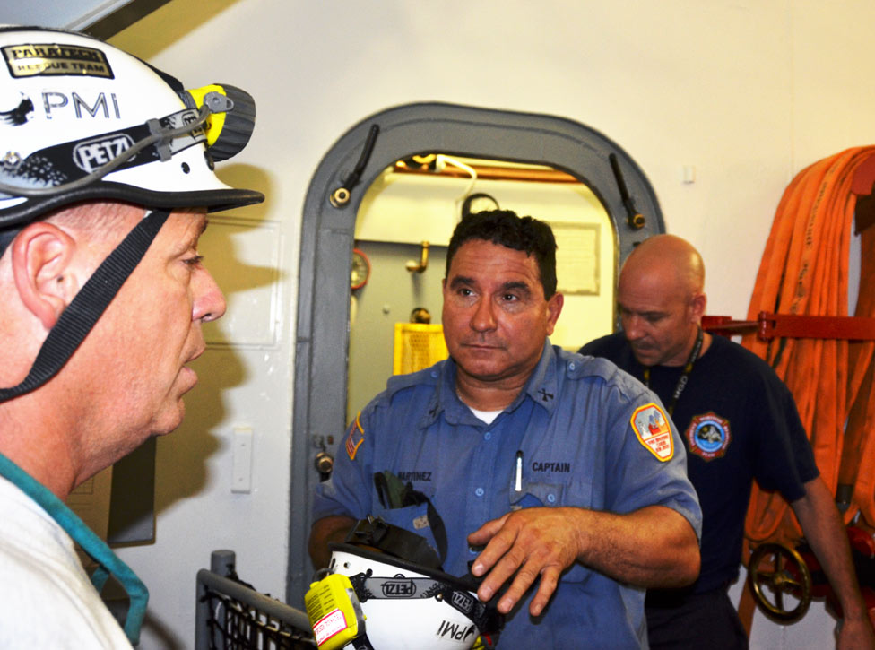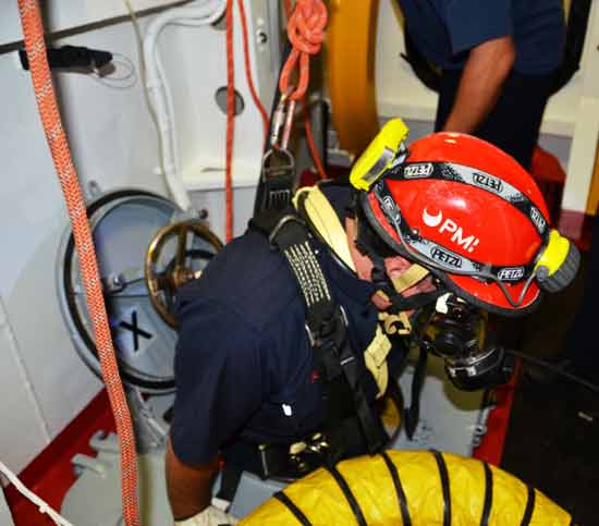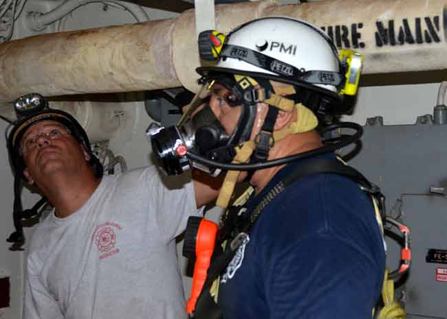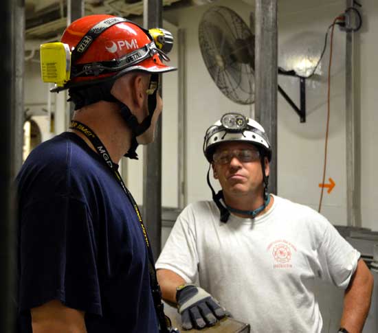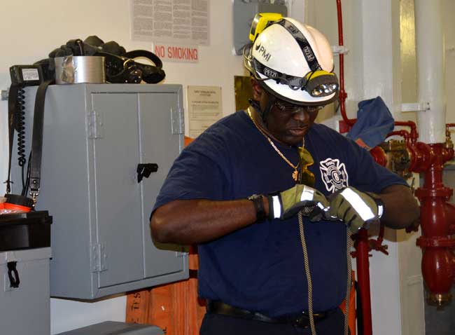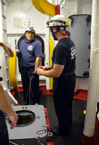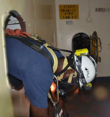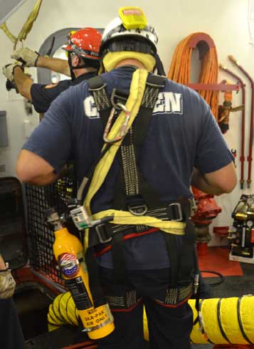 Each and every time the call comes to the Camden Fire Department, it's men and women face what may be potentially life-threatening circumstances. Standards and practices to ensure the safety of the public and first responders have been developed over the past 160-odd years, and while many at City Hall and elsewhere in State and County government may believe corners can be cut, far too many examples.. fatalities and injuries… have proven that is a falsehood. Firefighting and rescue is a dangerous business… roughly 70% of all deaths occurring in rescue operations are those of rescuers, not of rescuees. As part of ongoing training, Camden Fire Department personnel were given training in confined space rescue operations over the course of several days in September of 2011, first at Liberty Station on Broadway, followed by sessions on the battleship USS New Jersey BB-62, which is docked along the Camden waterfront. I was privileged to be allowed to monitor both parts of the course given. On September 12 I accompanied Battalion Chief Donald Johnson and Captains Frank Sandrock and David Dilks, who were conducting the class, aboard the USS New Jersey. Two groups of Camden firefighters took the training. The morning group consisted of Firefighters Brian Beach, David Diaz, Orland Nunez, and Lacy Phelps. The afternoon session attended by Captain Manny Martinez and Firefighters Efi Mercado, Gamalier Rivera, Frank Thompson, and Ken White. I have captioned some of the photos and attempted to describe what was occurring, and may well have either got it wrong or used improper terminology. If any interested party would like to assist, please comment at the bottom of the page. September 14, 2011 |