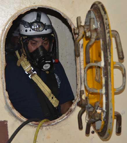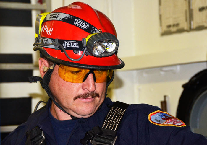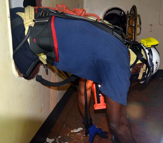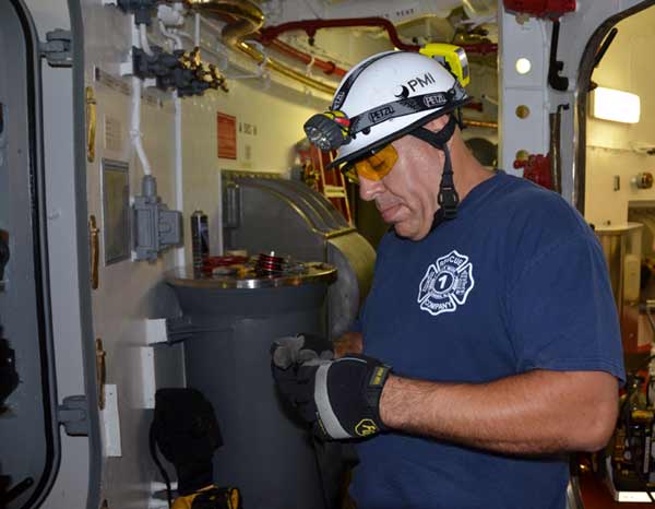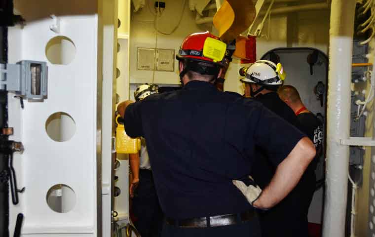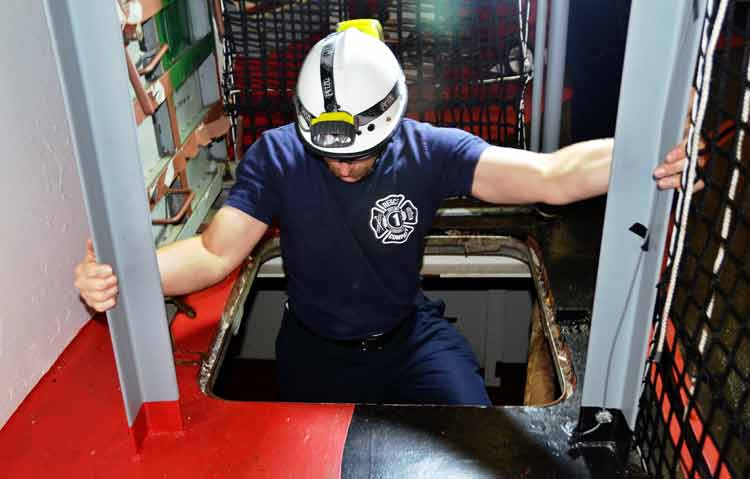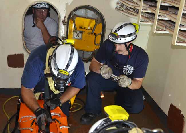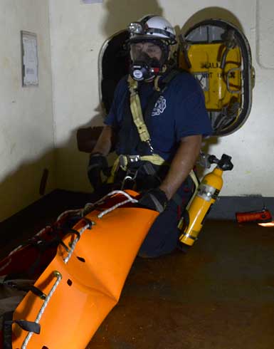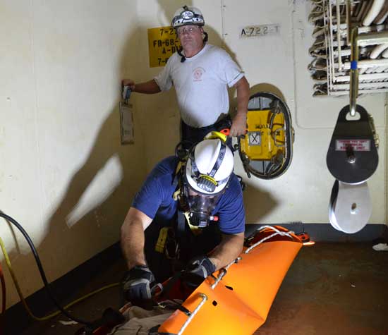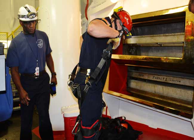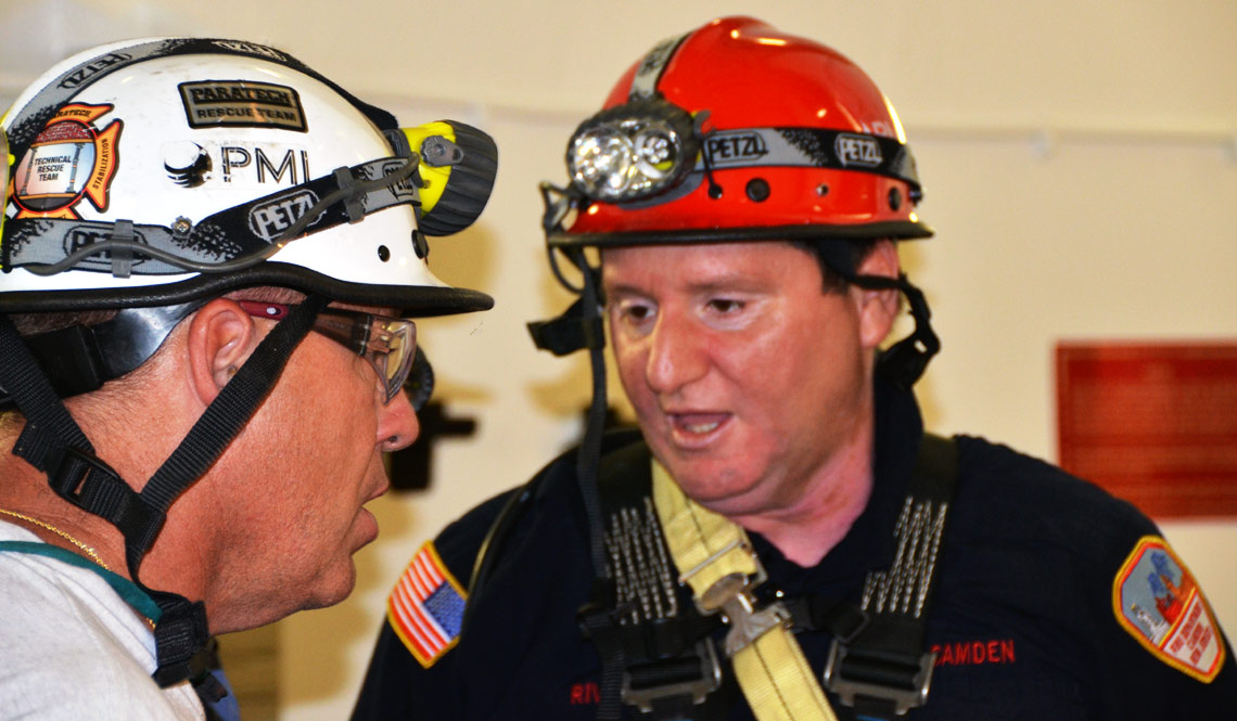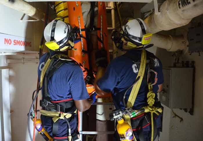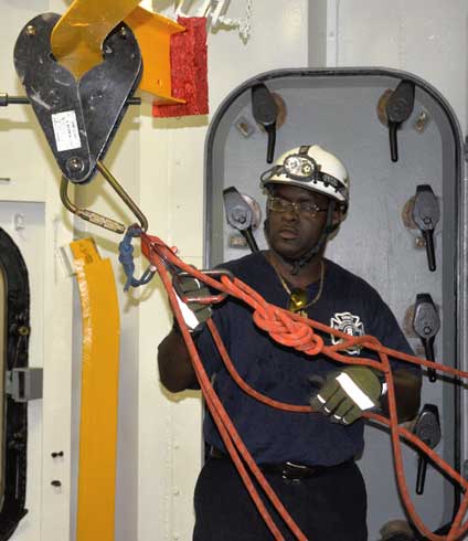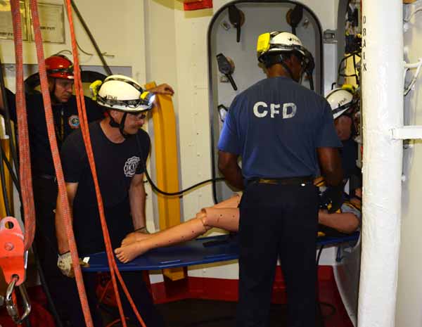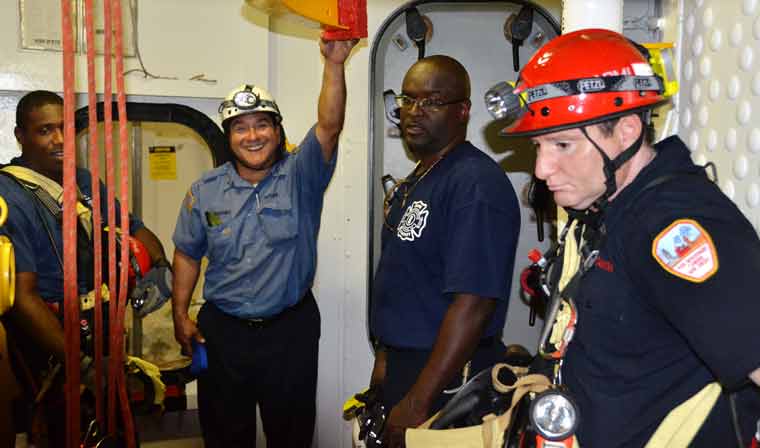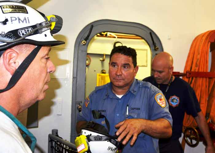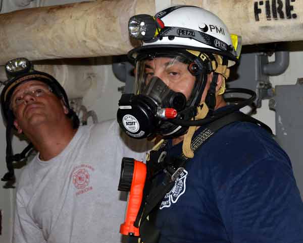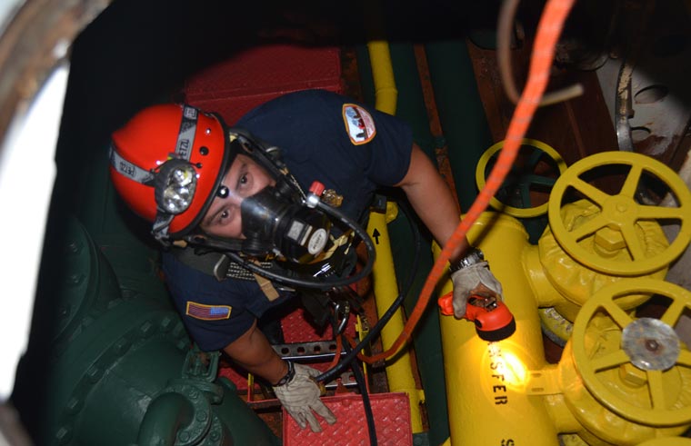 Each and every time the call comes to the Camden Fire Department, it's men and women face what may be potentially life-threatening circumstances. Standards and practices to ensure the safety of the public and first responders have been developed over the past 160-odd years, and while many at City Hall and elsewhere in State and County government may believe corners can be cut, far too many examples.. fatalities and injuries… have proven that is a falsehood. Firefighting and rescue is a dangerous business… roughly 70% of all deaths occurring in rescue operations are those of rescuers, not of rescuees. As part of ongoing training, Camden Fire Department personnel were given training in confined space rescue operations over the course of several days in September of 2011, first at Liberty Station on Broadway, followed by sessions on the battleship USS New Jersey BB-62, which is docked along the Camden waterfront. I was privileged to be allowed to monitor both parts of the course given. On September 12 I accompanied Battalion Chief Donald Johnson and Captains Frank Sandrock and David Dilks, who were conducting the class, aboard the USS New Jersey. Two groups of Camden firefighters took the training. The morning group consisted of Firefighters Brian Beach, David Diaz, Orland Nunez, and Lacy Phelps. The afternoon session attended by Captain Manny Martinez and Firefighters Efi Mercado, Gamalier Rivera, Frank Thompson, and Ken White. I have captioned some of the photos and attempted to describe what was occurring, and may well have either got it wrong or used improper terminology. If any interested party would like to assist, please comment at the bottom of the page. September 14, 2011 |
