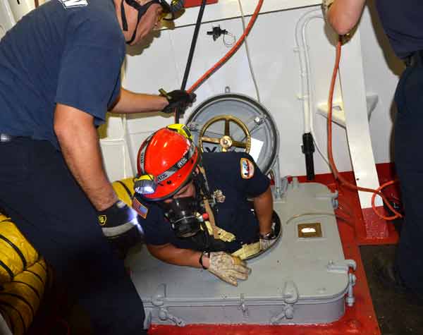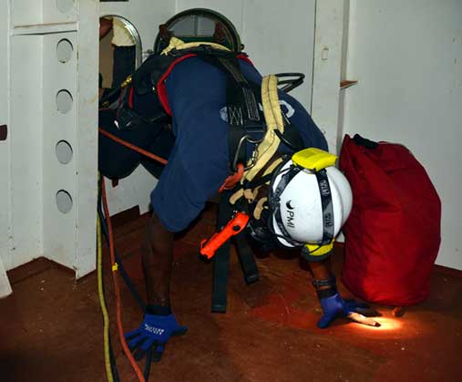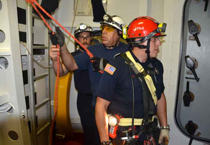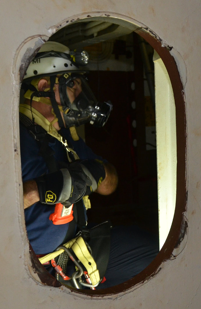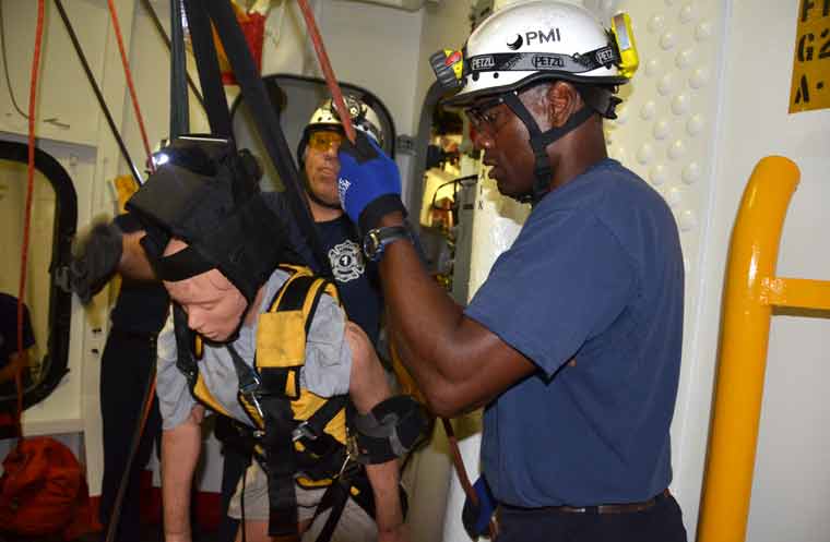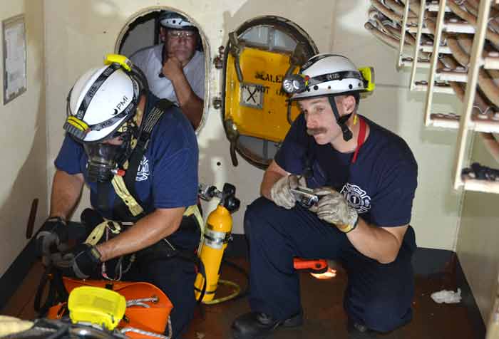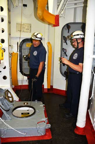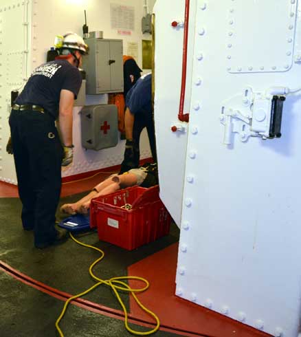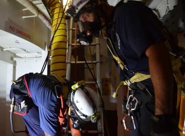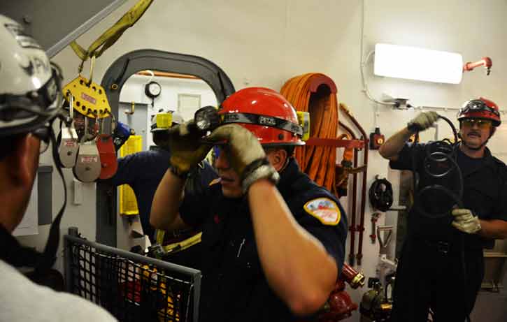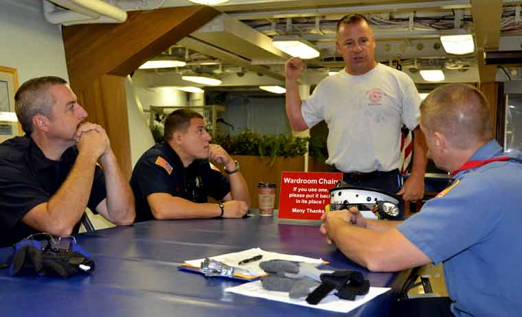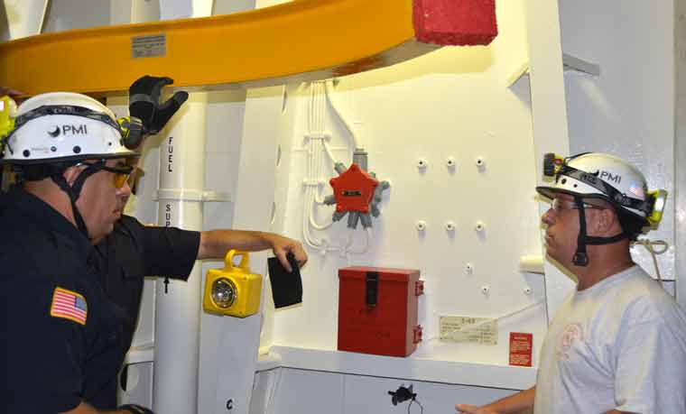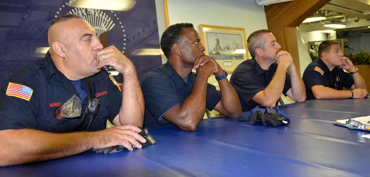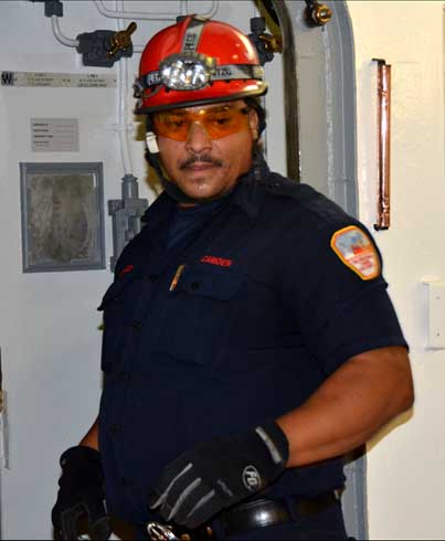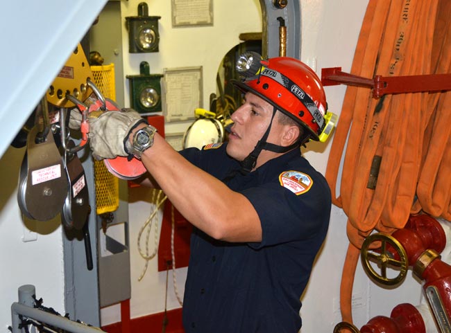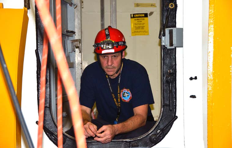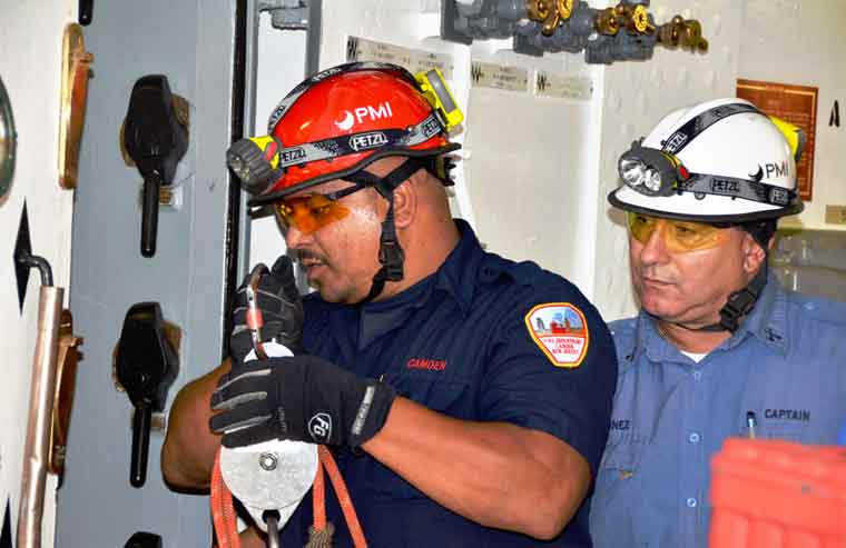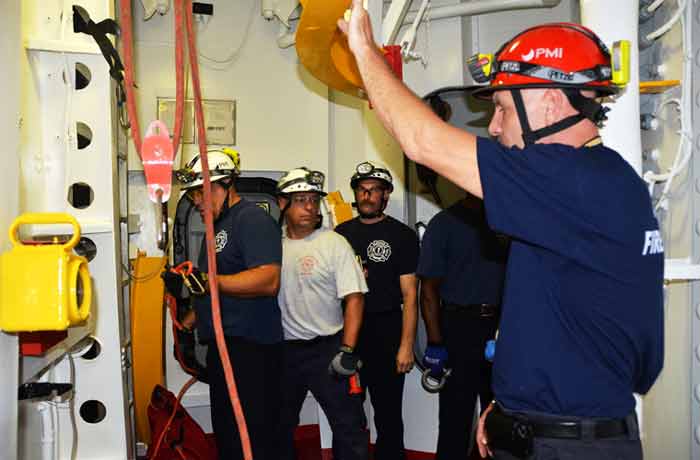 Each and every time the call comes to the Camden Fire Department, it's men and women face what may be potentially life-threatening circumstances. Standards and practices to ensure the safety of the public and first responders have been developed over the past 160-odd years, and while many at City Hall and elsewhere in State and County government may believe corners can be cut, far too many examples.. fatalities and injuries… have proven that is a falsehood. Firefighting and rescue is a dangerous business… roughly 70% of all deaths occurring in rescue operations are those of rescuers, not of rescuees. As part of ongoing training, Camden Fire Department personnel were given training in confined space rescue operations over the course of several days in September of 2011, first at Liberty Station on Broadway, followed by sessions on the battleship USS New Jersey BB-62, which is docked along the Camden waterfront. I was privileged to be allowed to monitor both parts of the course given. On September 12 I accompanied Battalion Chief Donald Johnson and Captains Frank Sandrock and David Dilks, who were conducting the class, aboard the USS New Jersey. Two groups of Camden firefighters took the training. The morning group consisted of Firefighters Brian Beach, David Diaz, Orland Nunez, and Lacy Phelps. The afternoon session attended by Captain Manny Martinez and Firefighters Efi Mercado, Gamalier Rivera, Frank Thompson, and Ken White. I have captioned some of the photos and attempted to describe what was occurring, and may well have either got it wrong or used improper terminology. If any interested party would like to assist, please comment at the bottom of the page. September 14, 2011 |