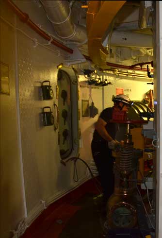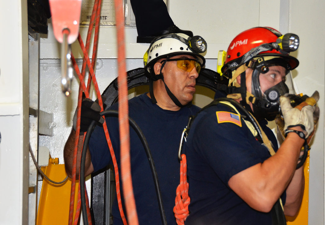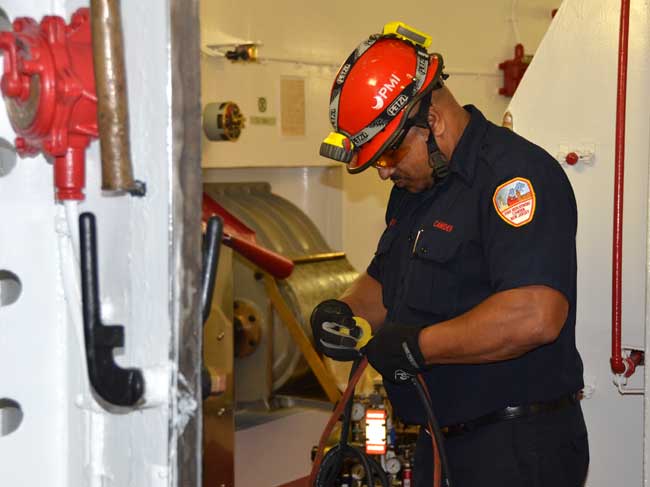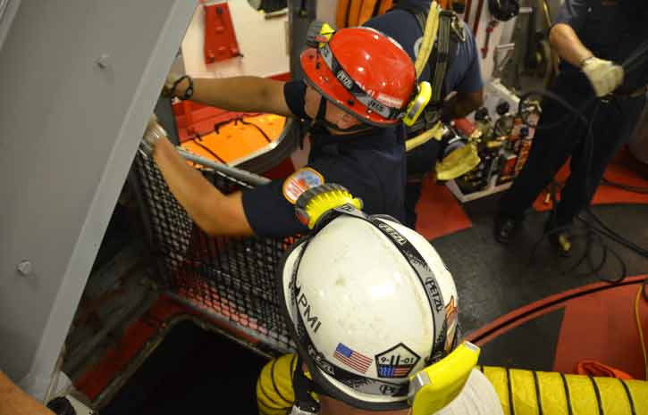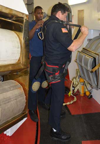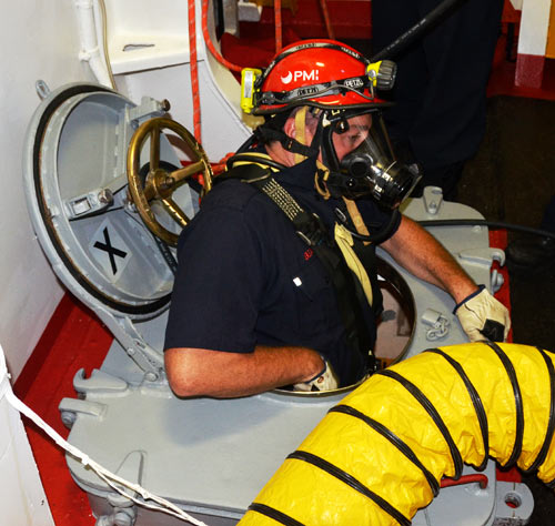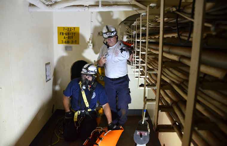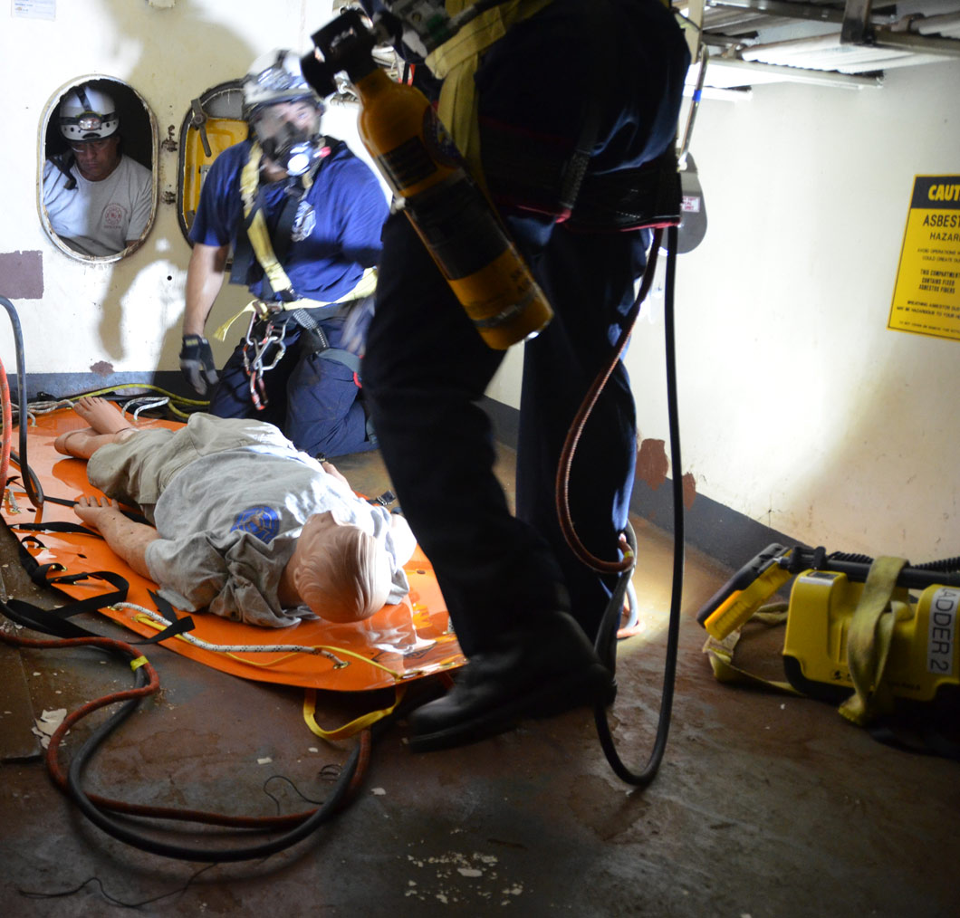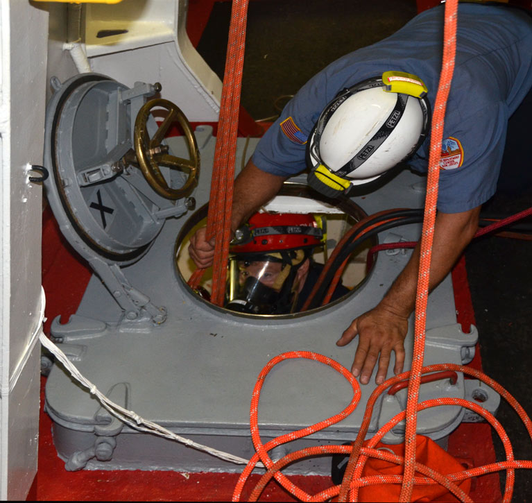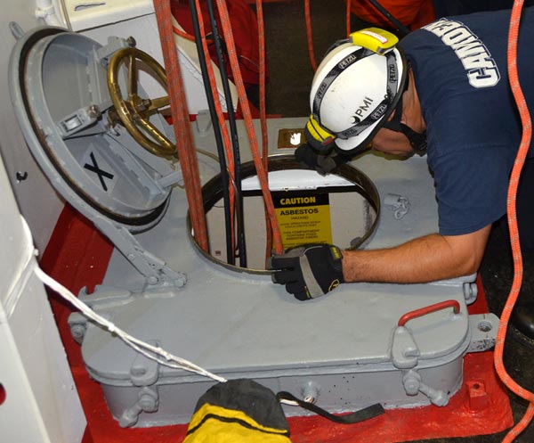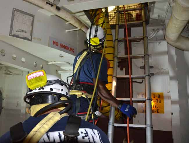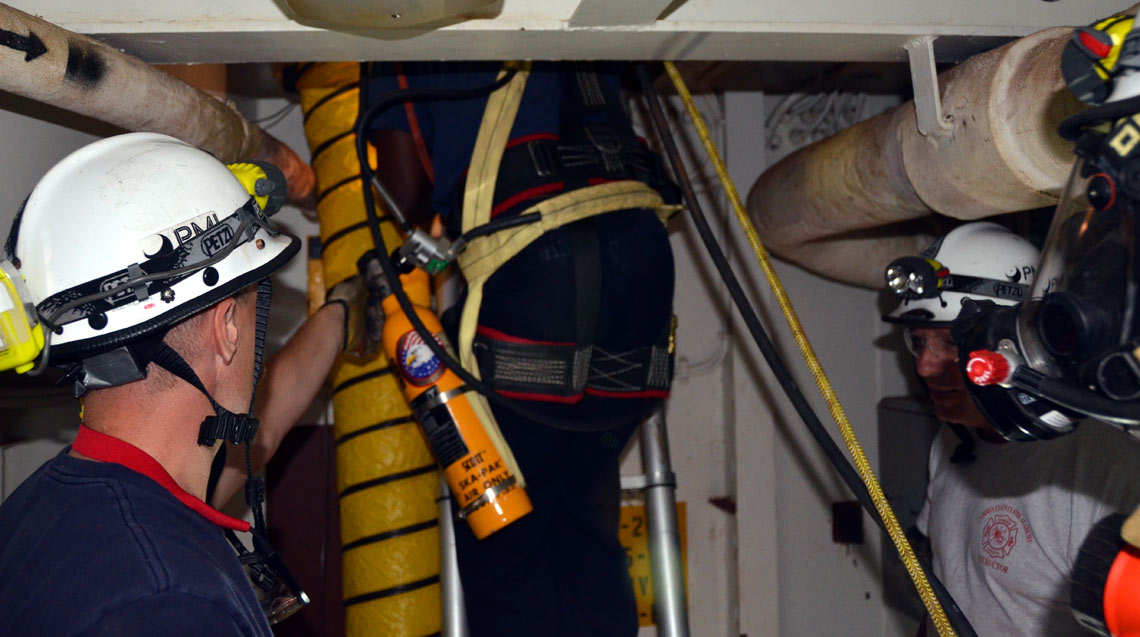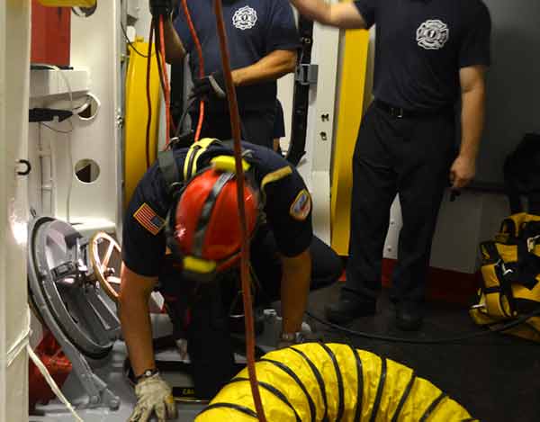 Each and every time the call comes to the Camden Fire Department, it's men and women face what may be potentially life-threatening circumstances. Standards and practices to ensure the safety of the public and first responders have been developed over the past 160-odd years, and while many at City Hall and elsewhere in State and County government may believe corners can be cut, far too many examples.. fatalities and injuries… have proven that is a falsehood. Firefighting and rescue is a dangerous business… roughly 70% of all deaths occurring in rescue operations are those of rescuers, not of rescuees. As part of ongoing training, Camden Fire Department personnel were given training in confined space rescue operations over the course of several days in September of 2011, first at Liberty Station on Broadway, followed by sessions on the battleship USS New Jersey BB-62, which is docked along the Camden waterfront. I was privileged to be allowed to monitor both parts of the course given. On September 12 I accompanied Battalion Chief Donald Johnson and Captains Frank Sandrock and David Dilks, who were conducting the class, aboard the USS New Jersey. Two groups of Camden firefighters took the training. The morning group consisted of Firefighters Brian Beach, David Diaz, Orland Nunez, and Lacy Phelps. The afternoon session attended by Captain Manny Martinez and Firefighters Efi Mercado, Gamalier Rivera, Frank Thompson, and Ken White. I have captioned some of the photos and attempted to describe what was occurring, and may well have either got it wrong or used improper terminology. If any interested party would like to assist, please comment at the bottom of the page. September 14, 2011 |
