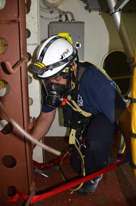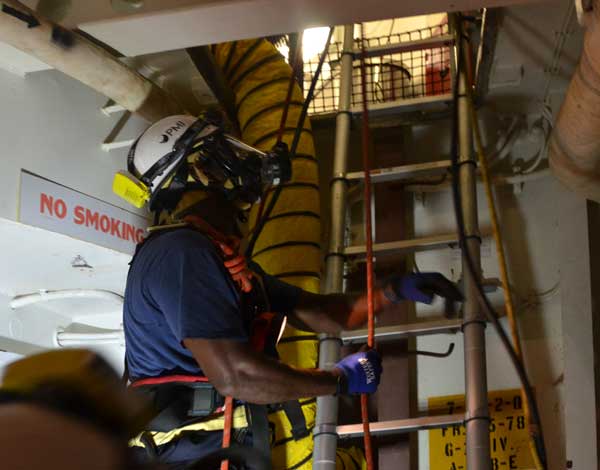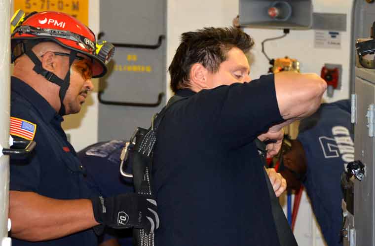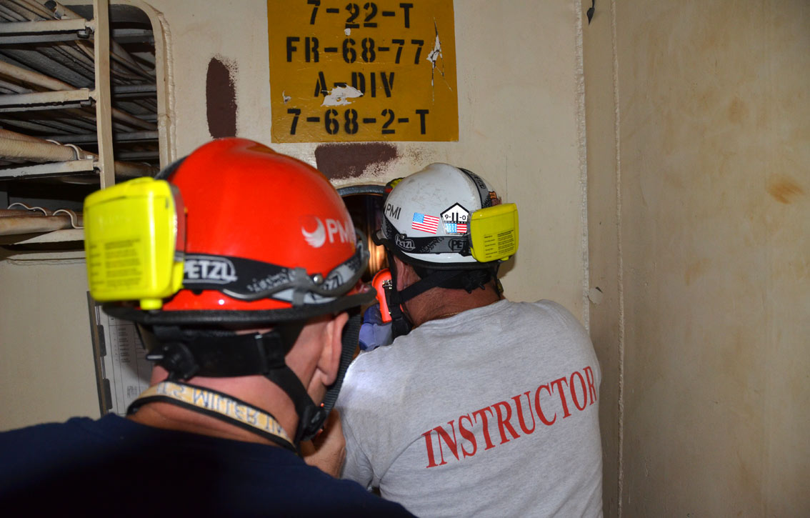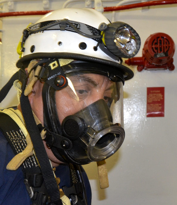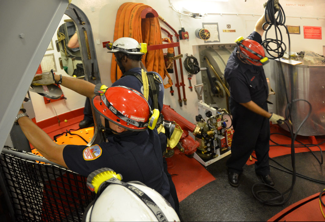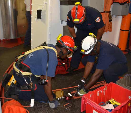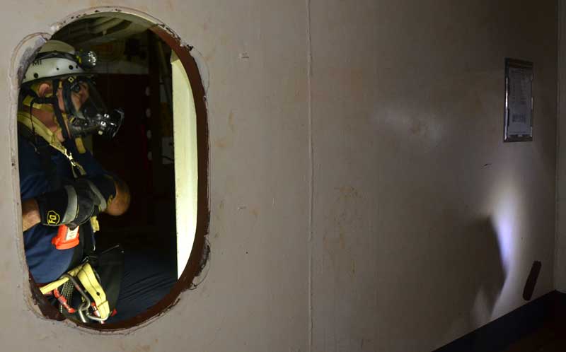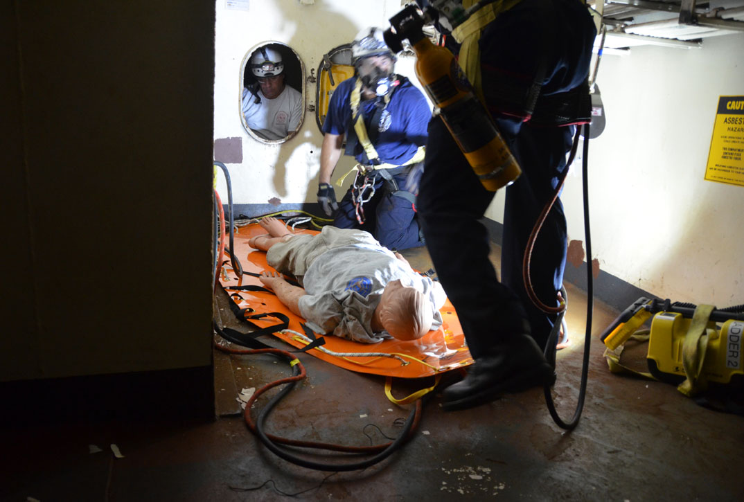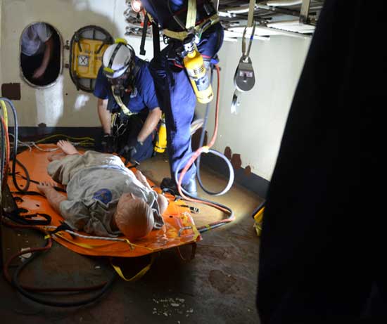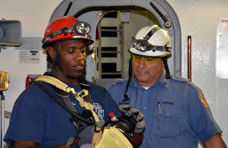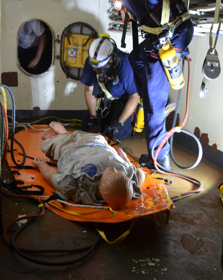 Each and every time the call comes to the Camden Fire Department, it's men and women face what may be potentially life-threatening circumstances. Standards and practices to ensure the safety of the public and first responders have been developed over the past 160-odd years, and while many at City Hall and elsewhere in State and County government may believe corners can be cut, far too many examples.. fatalities and injuries… have proven that is a falsehood. Firefighting and rescue is a dangerous business… roughly 70% of all deaths occurring in rescue operations are those of rescuers, not of rescuees. As part of ongoing training, Camden Fire Department personnel were given training in confined space rescue operations over the course of several days in September of 2011, first at Liberty Station on Broadway, followed by sessions on the battleship USS New Jersey BB-62, which is docked along the Camden waterfront. I was privileged to be allowed to monitor both parts of the course given. On September 12 I accompanied Battalion Chief Donald Johnson and Captains Frank Sandrock and David Dilks, who were conducting the class, aboard the USS New Jersey. Two groups of Camden firefighters took the training. The morning group consisted of Firefighters Brian Beach, David Diaz, Orland Nunez, and Lacy Phelps. The afternoon session attended by Captain Manny Martinez and Firefighters Efi Mercado, Gamalier Rivera, Frank Thompson, and Ken White. I have captioned some of the photos and attempted to describe what was occurring, and may well have either got it wrong or used improper terminology. If any interested party would like to assist, please comment at the bottom of the page. September 14, 2011 |