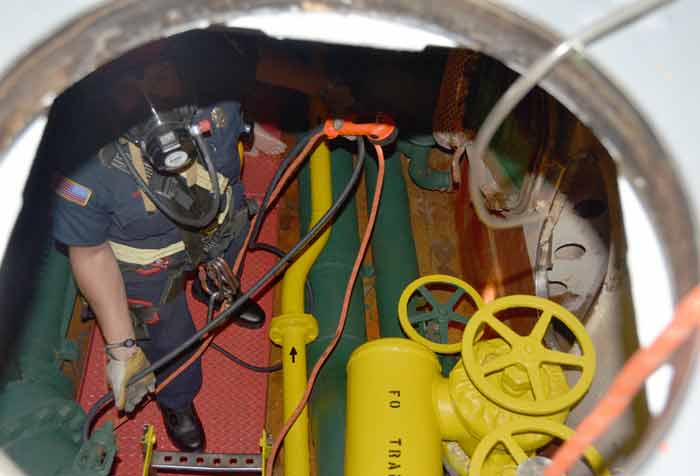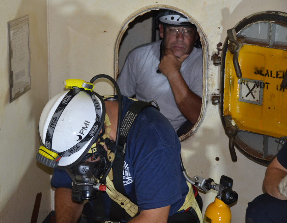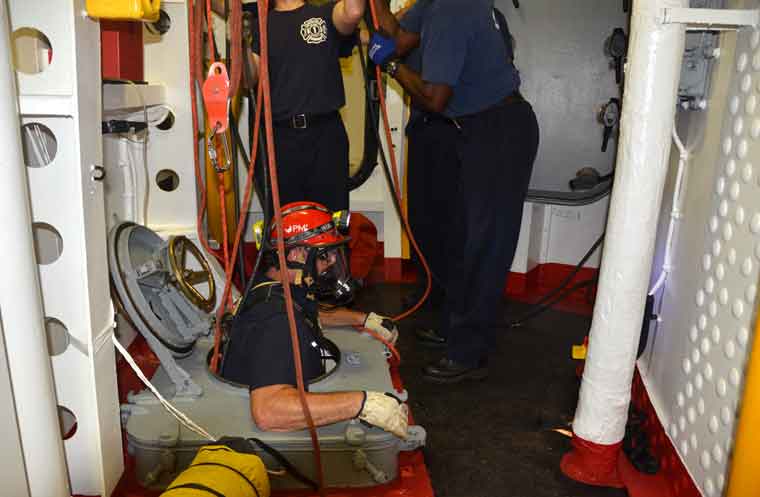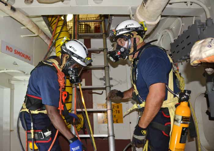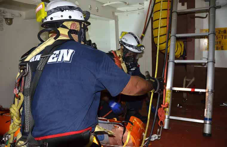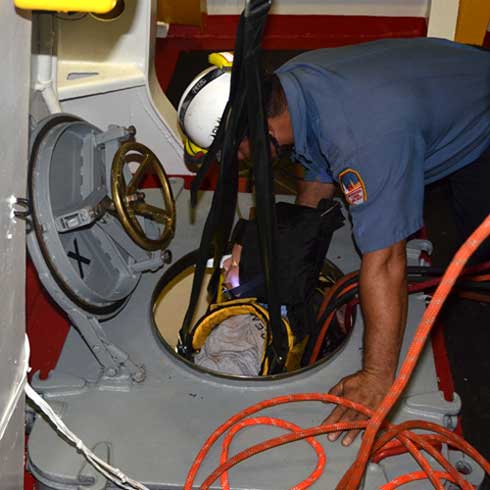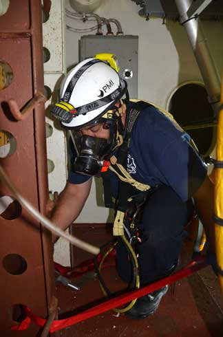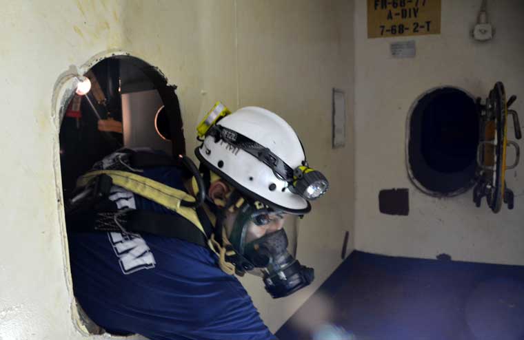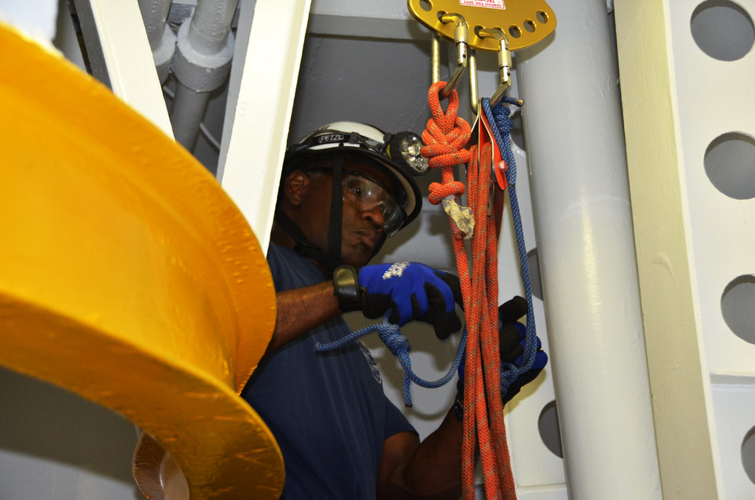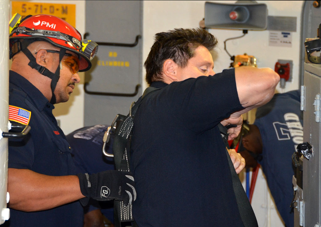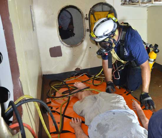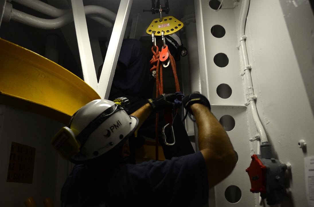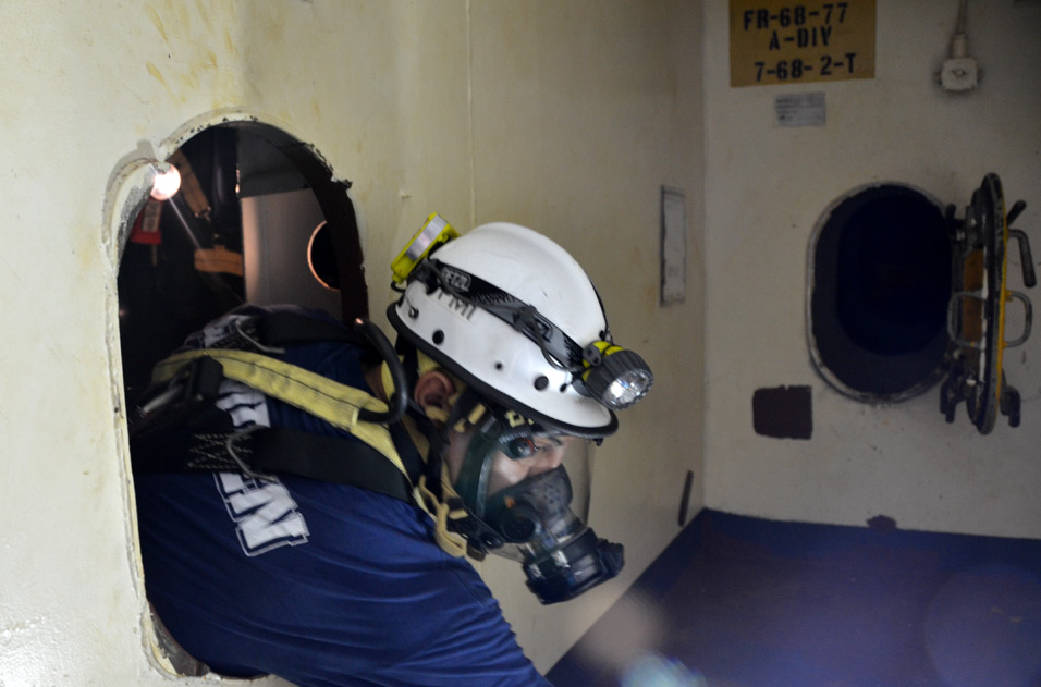 Each and every time the call comes to the Camden Fire Department, it's men and women face what may be potentially life-threatening circumstances. Standards and practices to ensure the safety of the public and first responders have been developed over the past 160-odd years, and while many at City Hall and elsewhere in State and County government may believe corners can be cut, far too many examples.. fatalities and injuries… have proven that is a falsehood. Firefighting and rescue is a dangerous business… roughly 70% of all deaths occurring in rescue operations are those of rescuers, not of rescuees. As part of ongoing training, Camden Fire Department personnel were given training in confined space rescue operations over the course of several days in September of 2011, first at Liberty Station on Broadway, followed by sessions on the battleship USS New Jersey BB-62, which is docked along the Camden waterfront. I was privileged to be allowed to monitor both parts of the course given. On September 12 I accompanied Battalion Chief Donald Johnson and Captains Frank Sandrock and David Dilks, who were conducting the class, aboard the USS New Jersey. Two groups of Camden firefighters took the training. The morning group consisted of Firefighters Brian Beach, David Diaz, Orland Nunez, and Lacy Phelps. The afternoon session attended by Captain Manny Martinez and Firefighters Efi Mercado, Gamalier Rivera, Frank Thompson, and Ken White. I have captioned some of the photos and attempted to describe what was occurring, and may well have either got it wrong or used improper terminology. If any interested party would like to assist, please comment at the bottom of the page. September 14, 2011 |