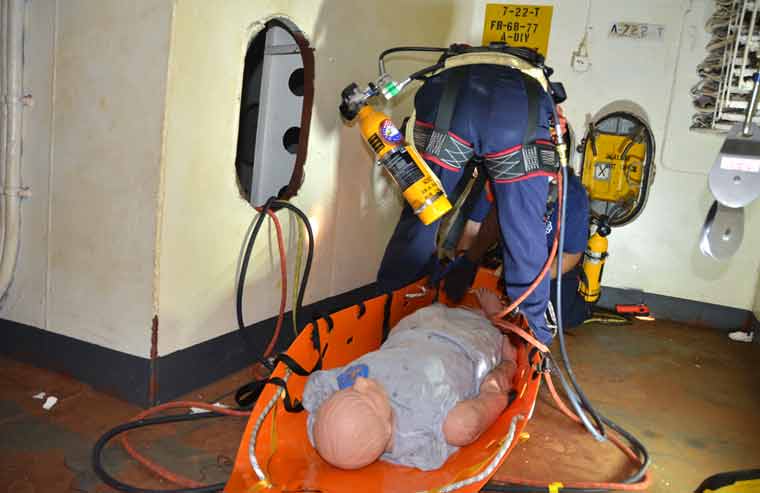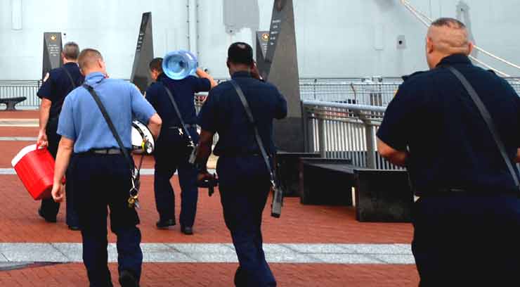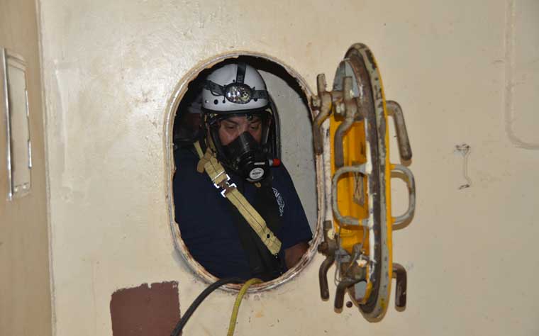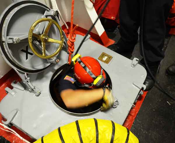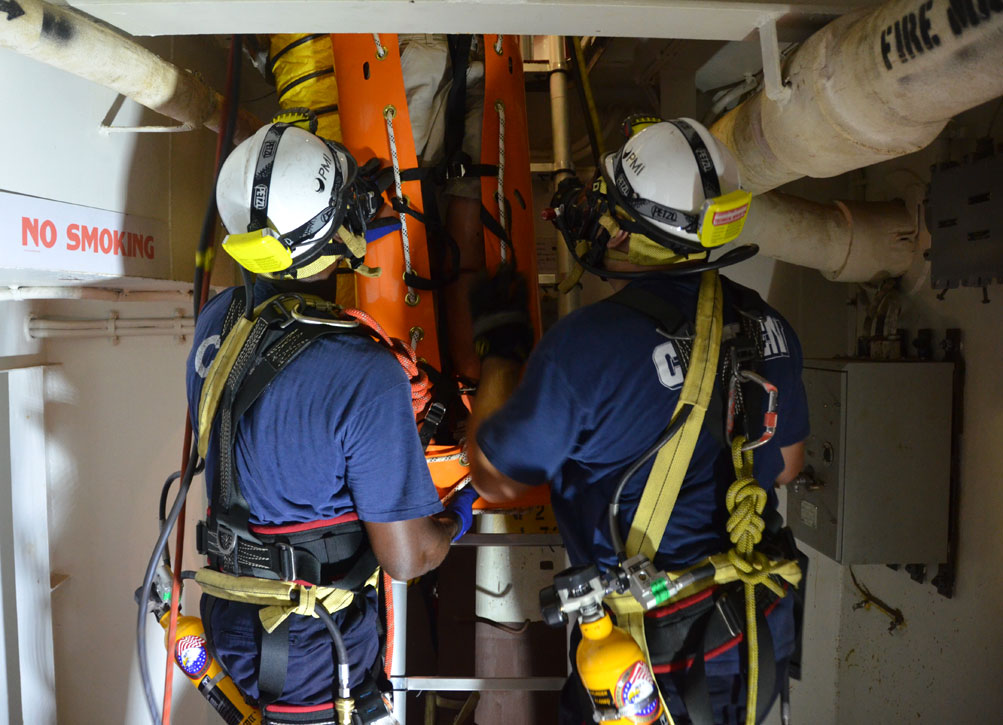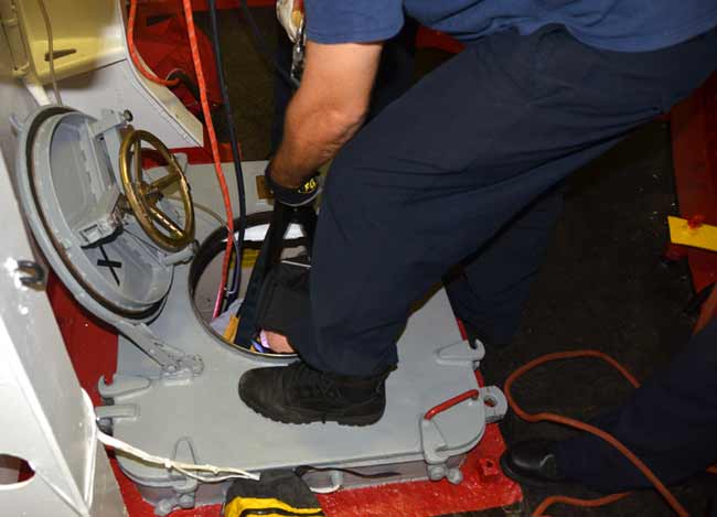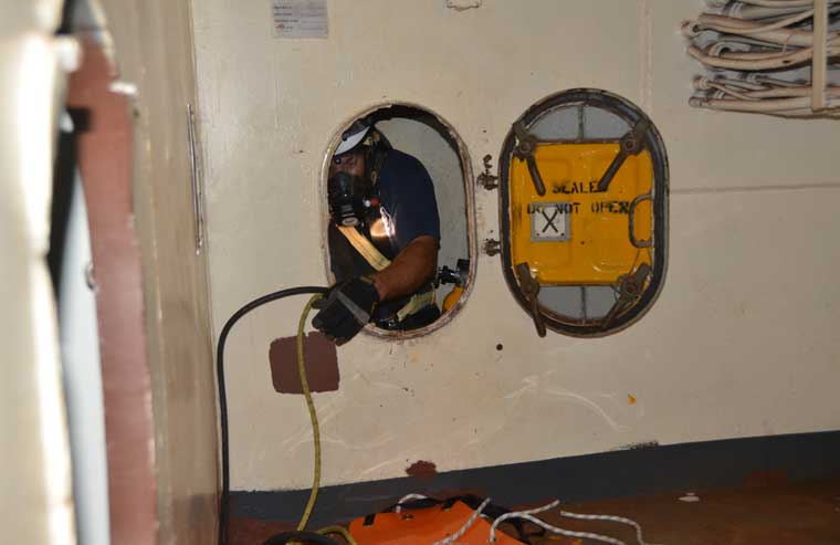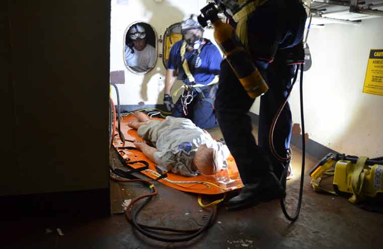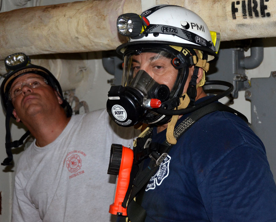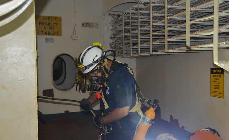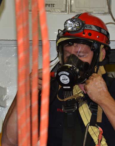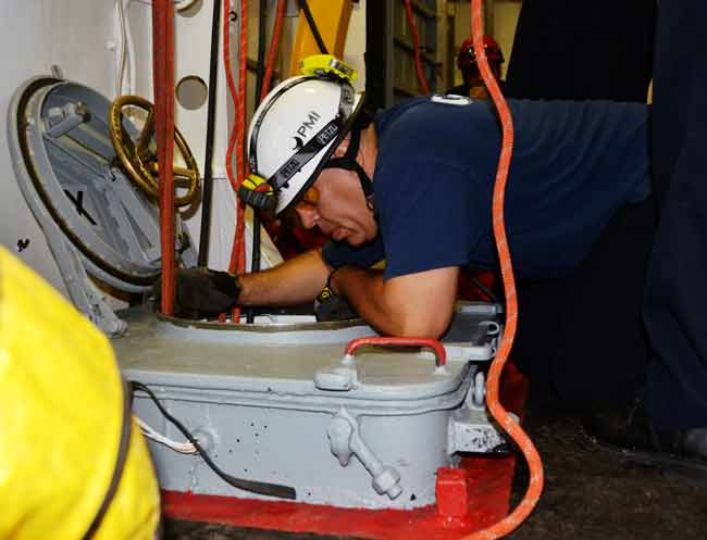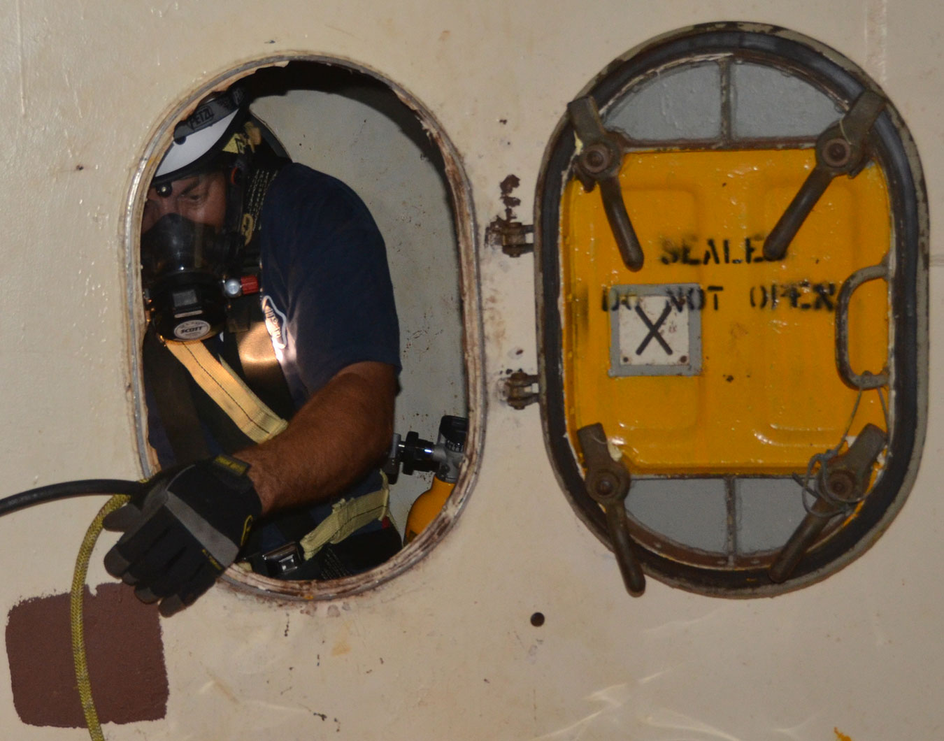 Each and every time the call comes to the Camden Fire Department, it's men and women face what may be potentially life-threatening circumstances. Standards and practices to ensure the safety of the public and first responders have been developed over the past 160-odd years, and while many at City Hall and elsewhere in State and County government may believe corners can be cut, far too many examples.. fatalities and injuries… have proven that is a falsehood. Firefighting and rescue is a dangerous business… roughly 70% of all deaths occurring in rescue operations are those of rescuers, not of rescuees. As part of ongoing training, Camden Fire Department personnel were given training in confined space rescue operations over the course of several days in September of 2011, first at Liberty Station on Broadway, followed by sessions on the battleship USS New Jersey BB-62, which is docked along the Camden waterfront. I was privileged to be allowed to monitor both parts of the course given. On September 12 I accompanied Battalion Chief Donald Johnson and Captains Frank Sandrock and David Dilks, who were conducting the class, aboard the USS New Jersey. Two groups of Camden firefighters took the training. The morning group consisted of Firefighters Brian Beach, David Diaz, Orland Nunez, and Lacy Phelps. The afternoon session attended by Captain Manny Martinez and Firefighters Efi Mercado, Gamalier Rivera, Frank Thompson, and Ken White. I have captioned some of the photos and attempted to describe what was occurring, and may well have either got it wrong or used improper terminology. If any interested party would like to assist, please comment at the bottom of the page. September 14, 2011 |