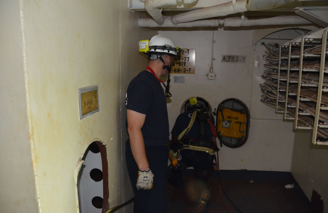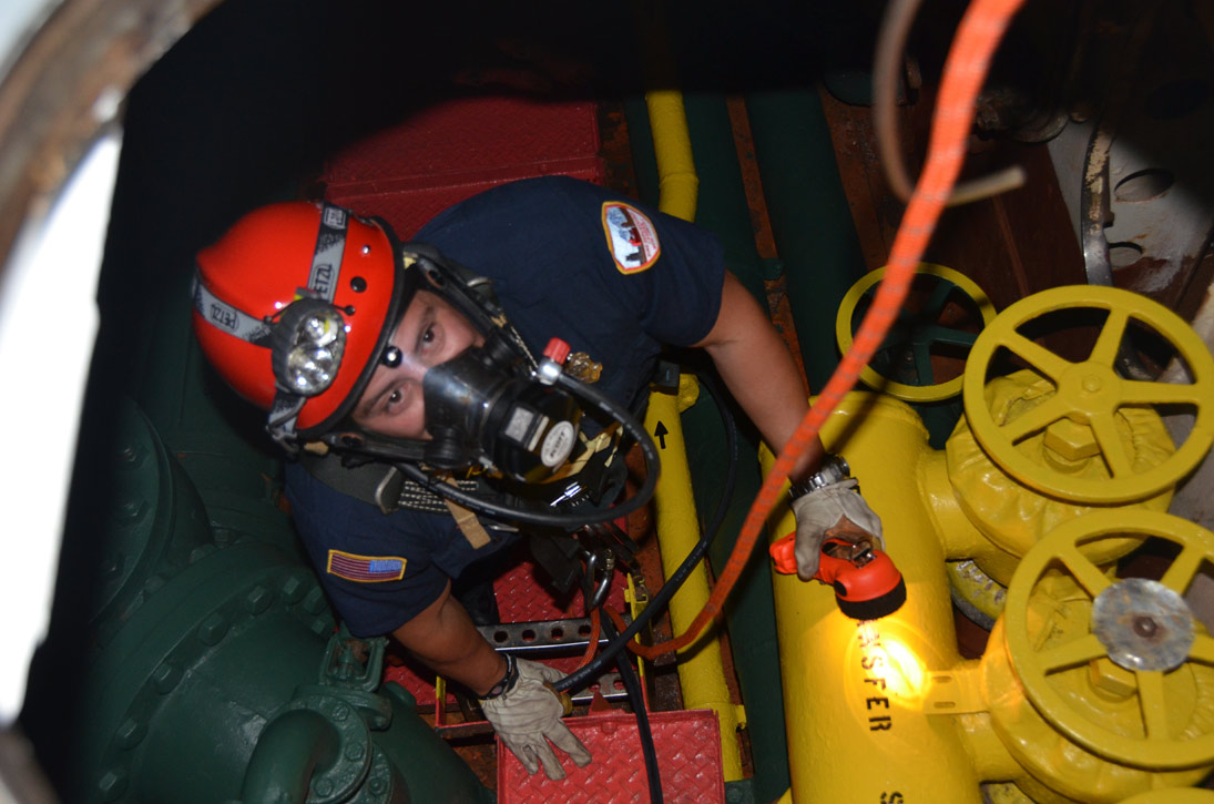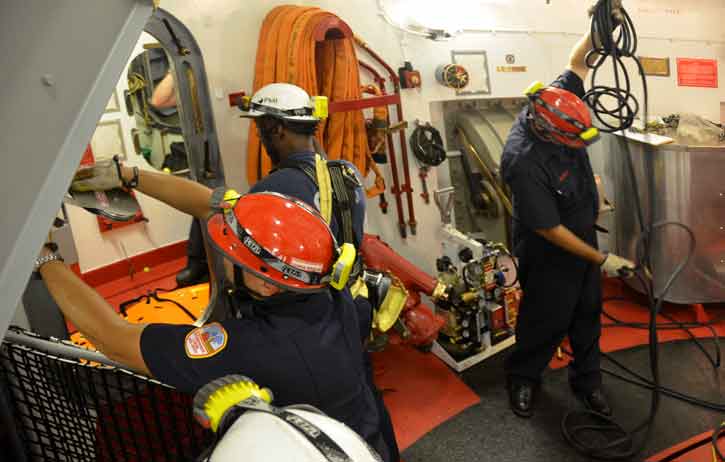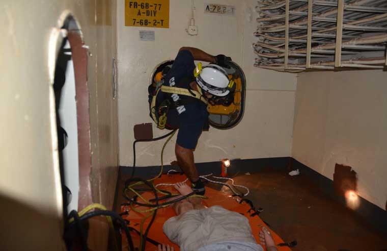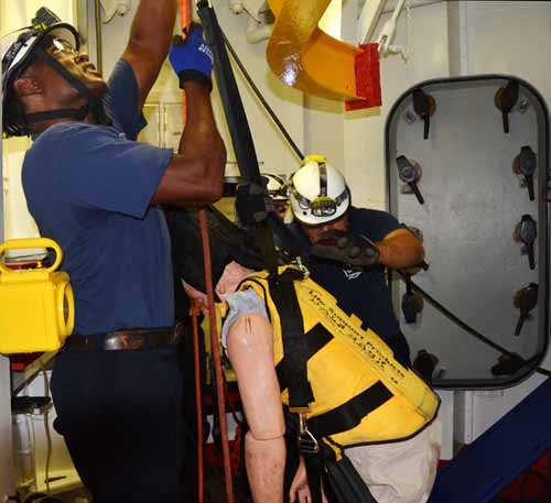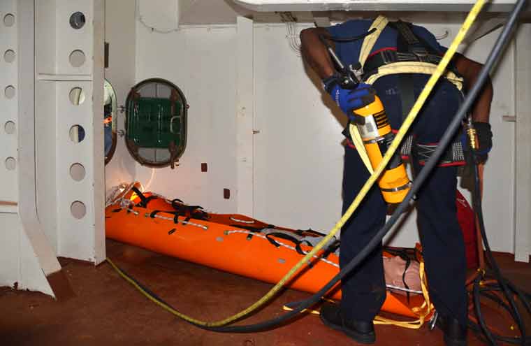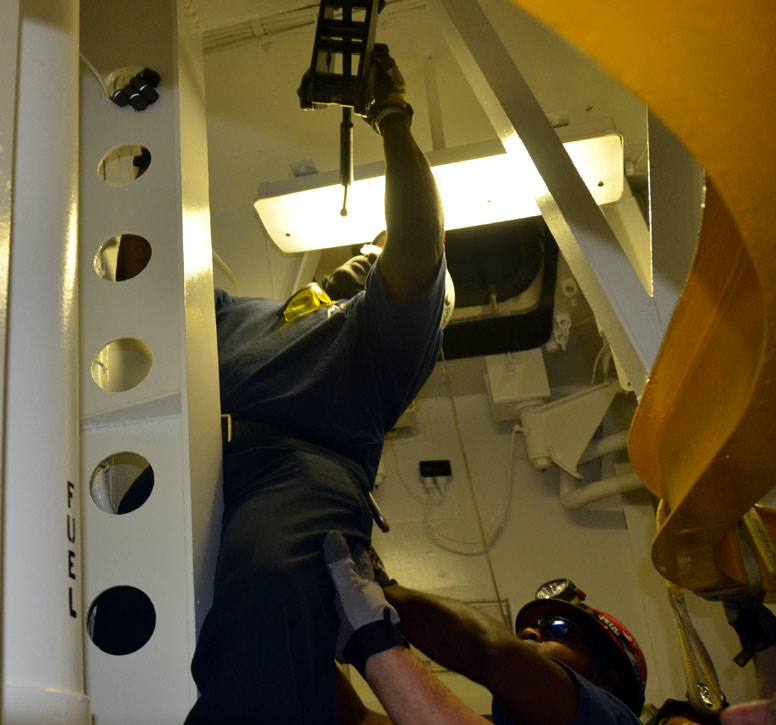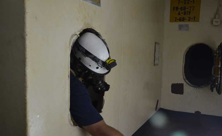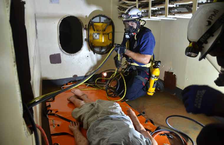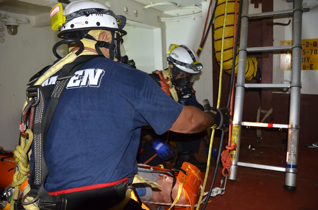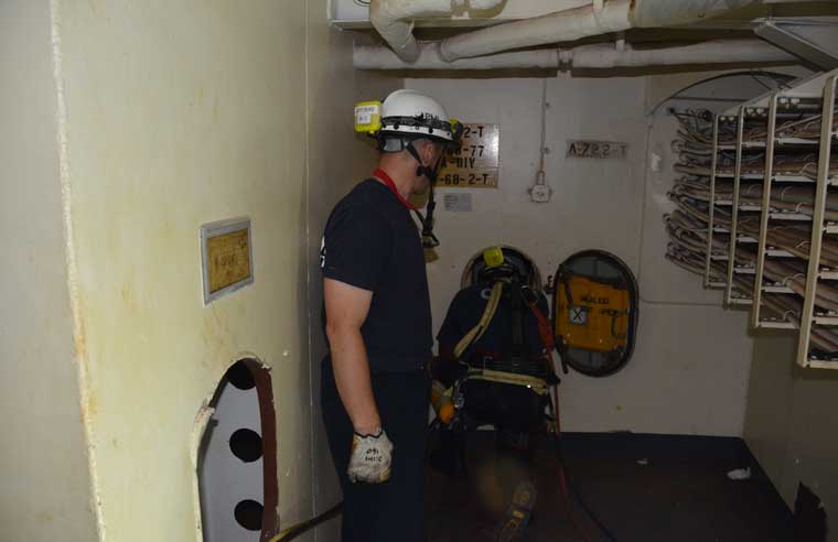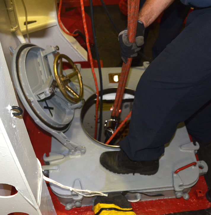 Each and every time the call comes to the Camden Fire Department, it's men and women face what may be potentially life-threatening circumstances. Standards and practices to ensure the safety of the public and first responders have been developed over the past 160-odd years, and while many at City Hall and elsewhere in State and County government may believe corners can be cut, far too many examples.. fatalities and injuries… have proven that is a falsehood. Firefighting and rescue is a dangerous business… roughly 70% of all deaths occurring in rescue operations are those of rescuers, not of rescuees. As part of ongoing training, Camden Fire Department personnel were given training in confined space rescue operations over the course of several days in September of 2011, first at Liberty Station on Broadway, followed by sessions on the battleship USS New Jersey BB-62, which is docked along the Camden waterfront. I was privileged to be allowed to monitor both parts of the course given. On September 12 I accompanied Battalion Chief Donald Johnson and Captains Frank Sandrock and David Dilks, who were conducting the class, aboard the USS New Jersey. Two groups of Camden firefighters took the training. The morning group consisted of Firefighters Brian Beach, David Diaz, Orland Nunez, and Lacy Phelps. The afternoon session attended by Captain Manny Martinez and Firefighters Efi Mercado, Gamalier Rivera, Frank Thompson, and Ken White. I have captioned some of the photos and attempted to describe what was occurring, and may well have either got it wrong or used improper terminology. If any interested party would like to assist, please comment at the bottom of the page. September 14, 2011 |